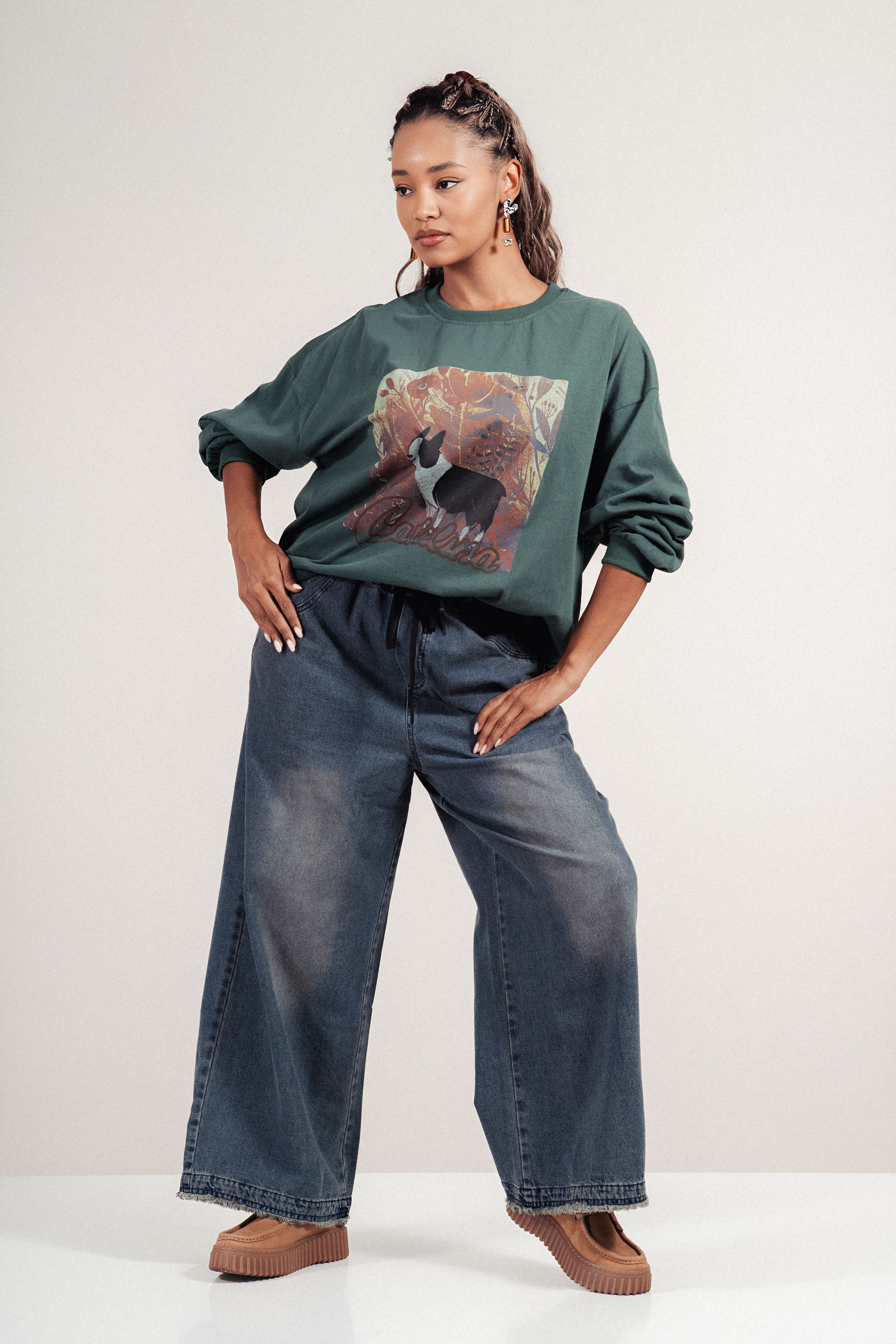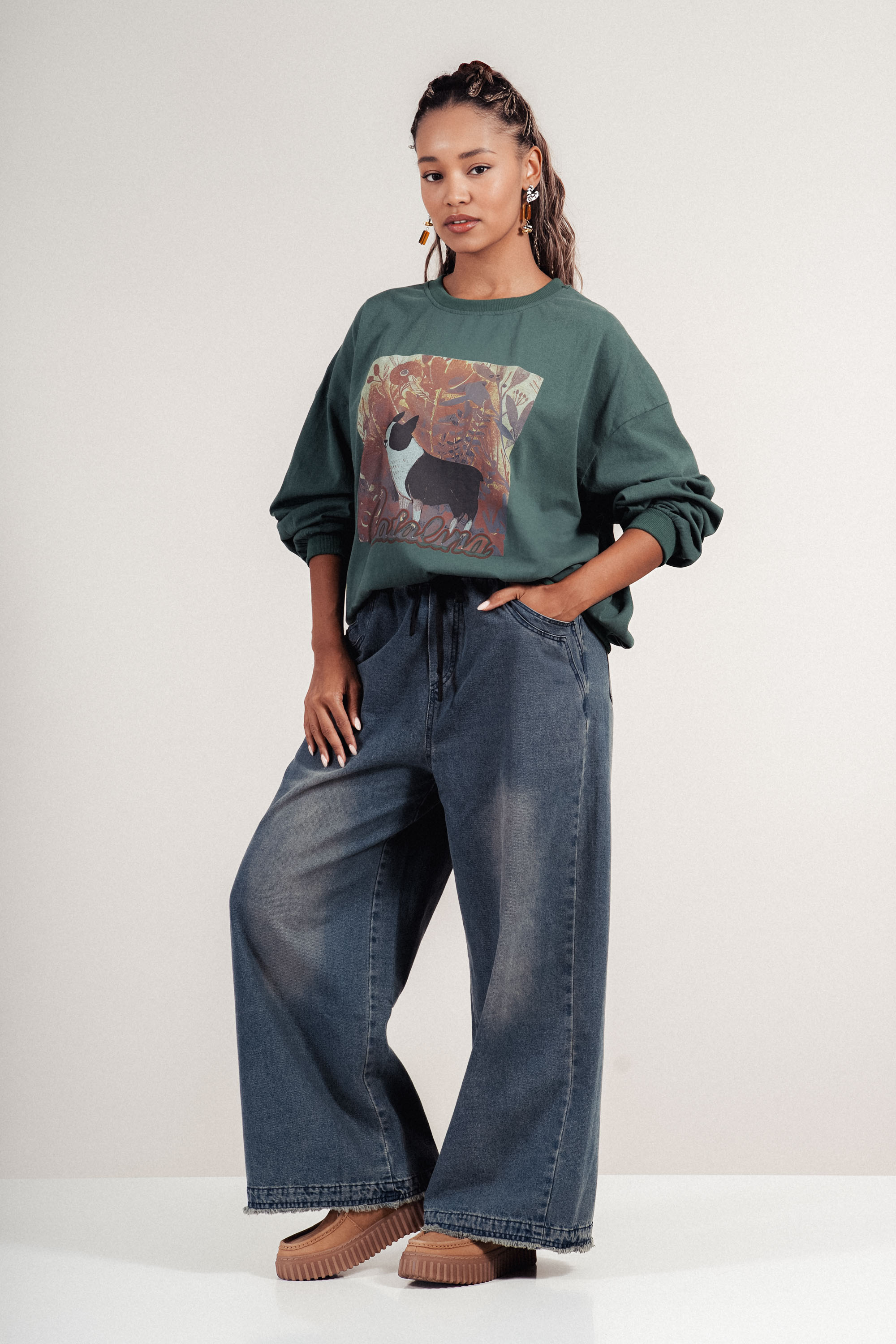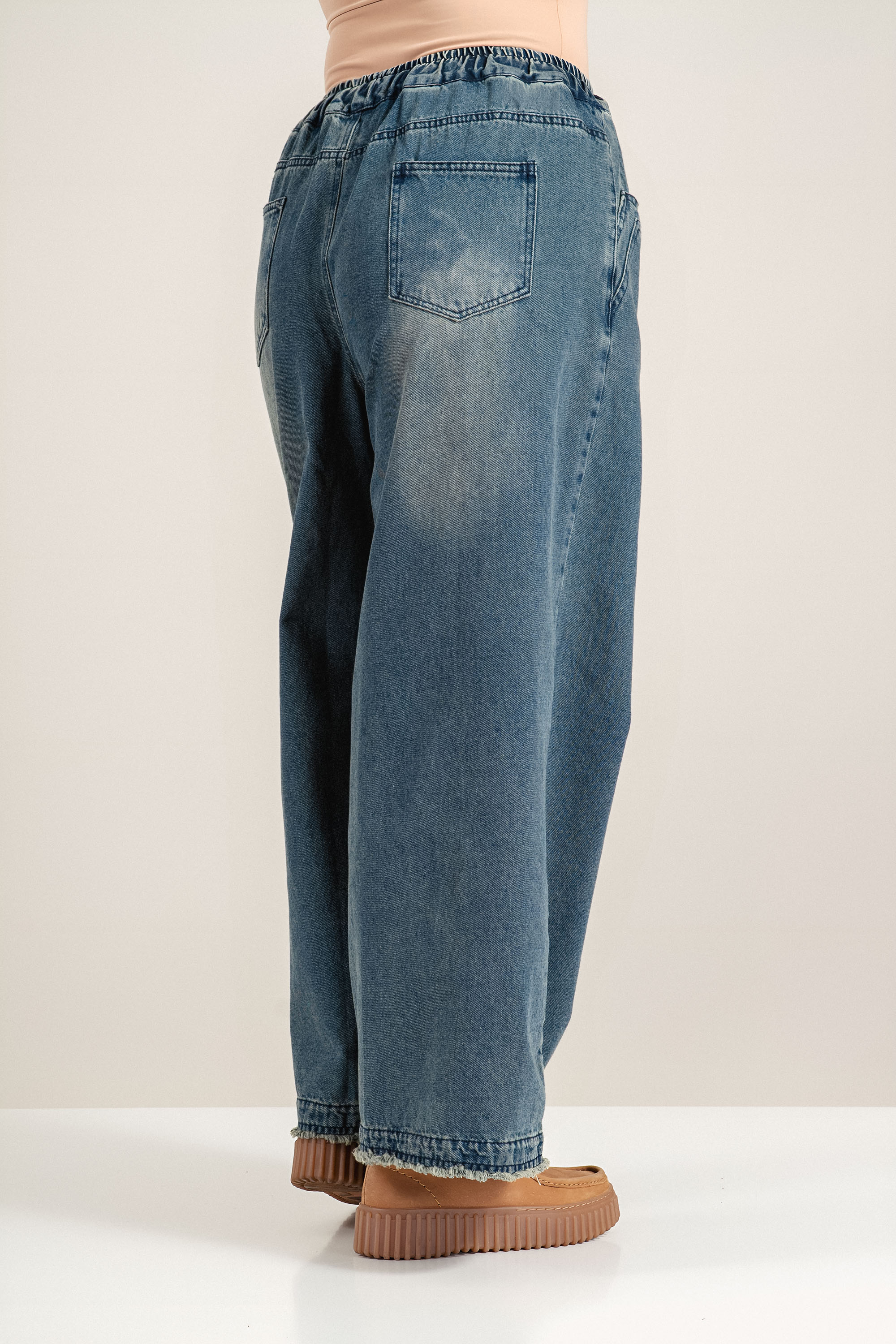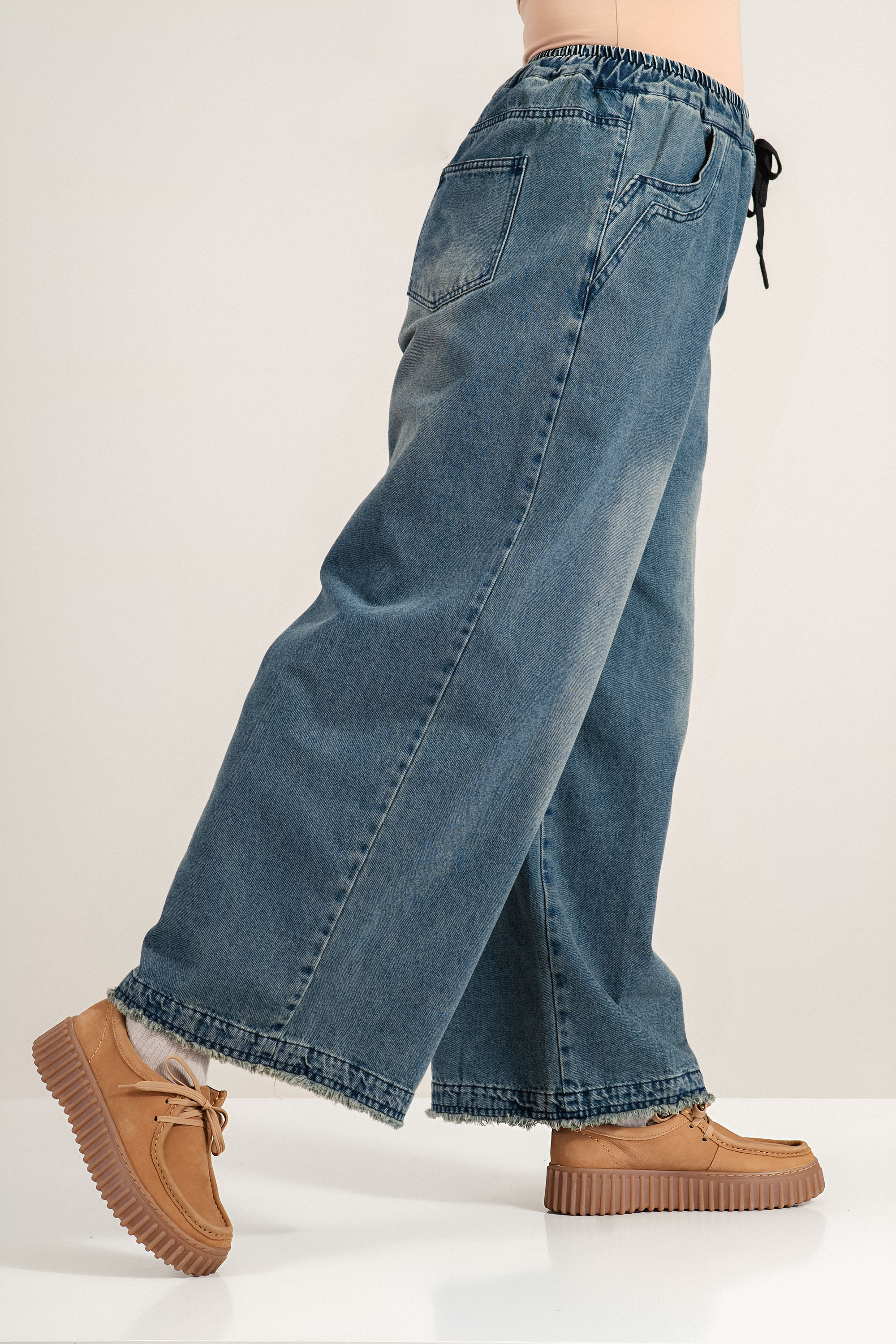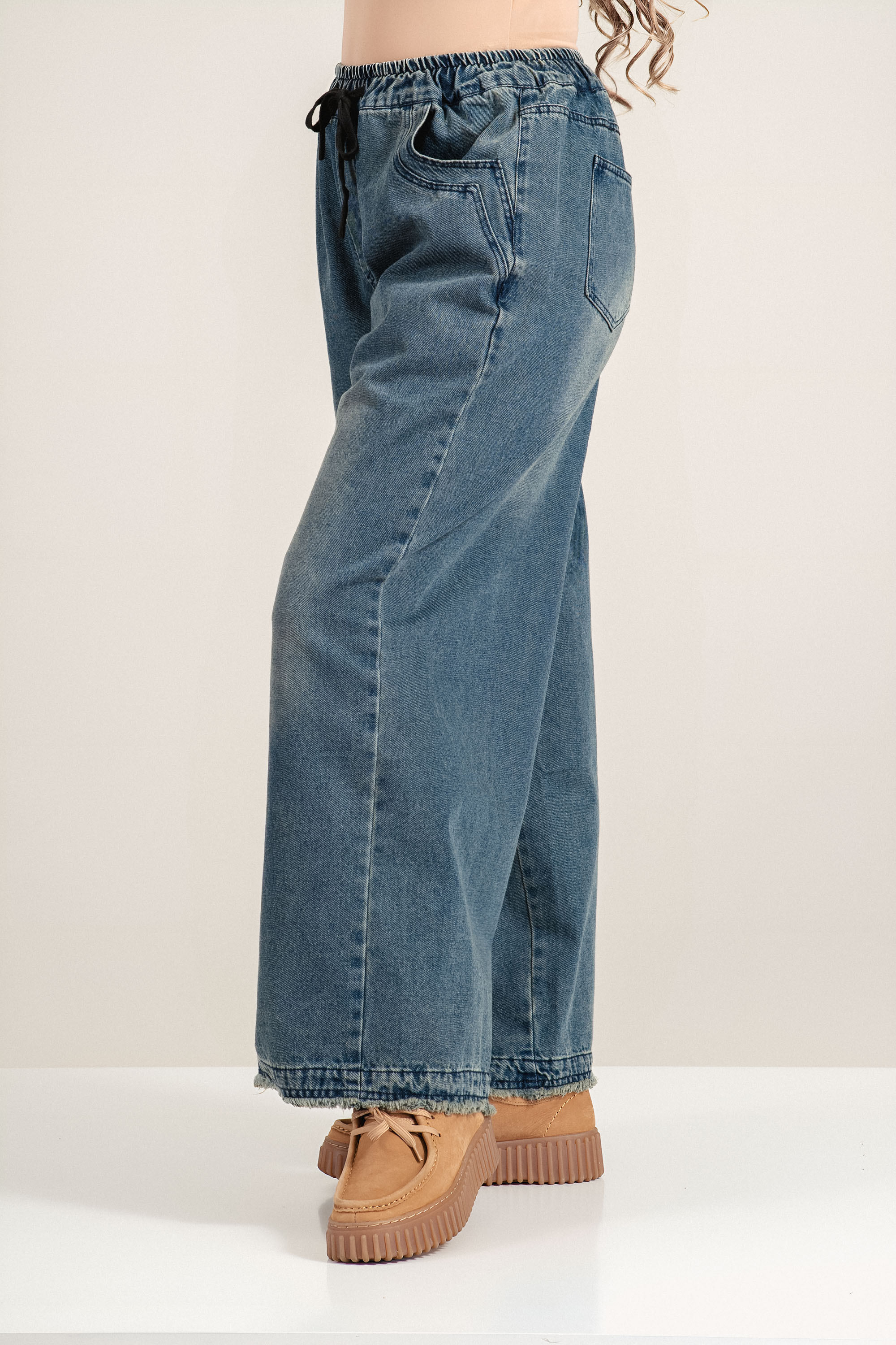 Практичен модел за ежедневието, съчетаващ удобство и стил. Дънките са изработени от мек и устойчив деним, с ластик на талията за адаптивно прилягане. Широкият крачол създава модерен силует и подчертава фигурата. Меки избелени ефекти и накъсвания придават актуална визия. Подходящи за пролетно-есенния сезон.