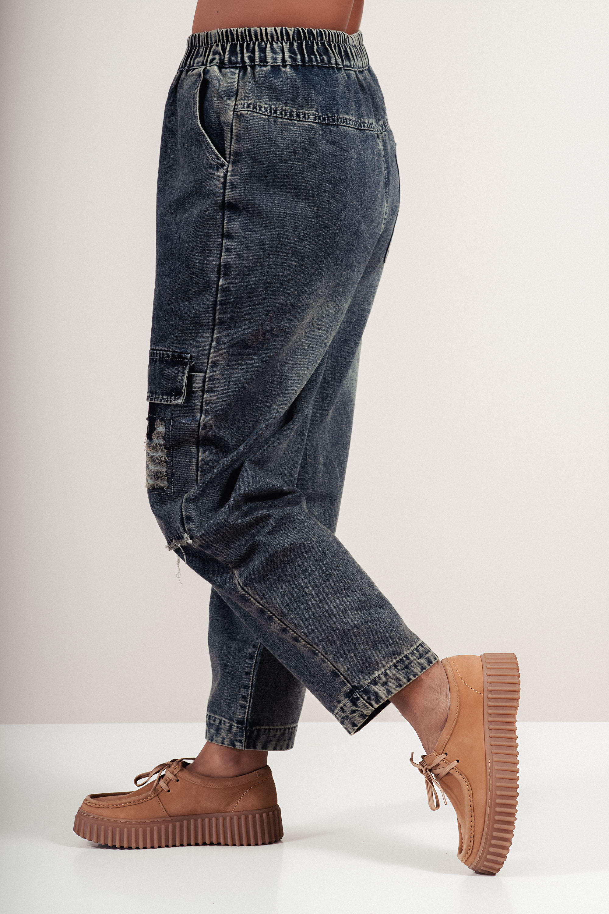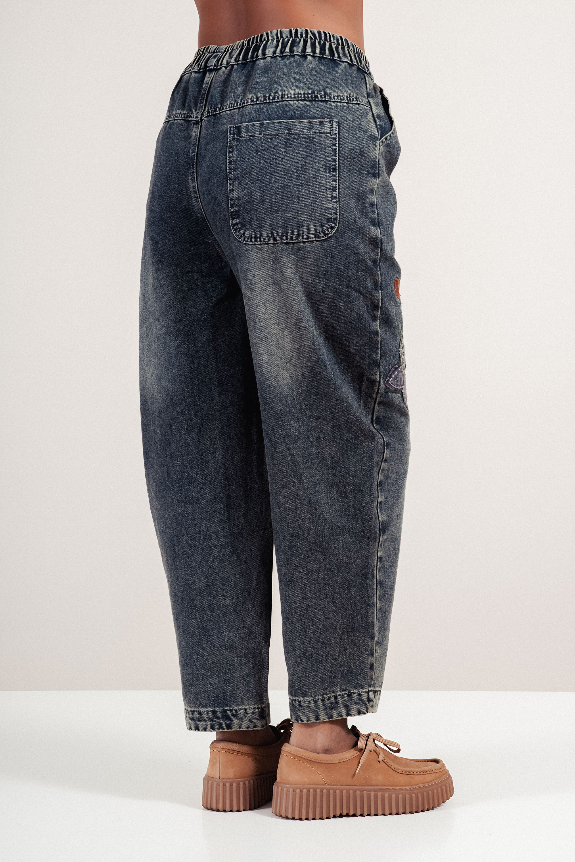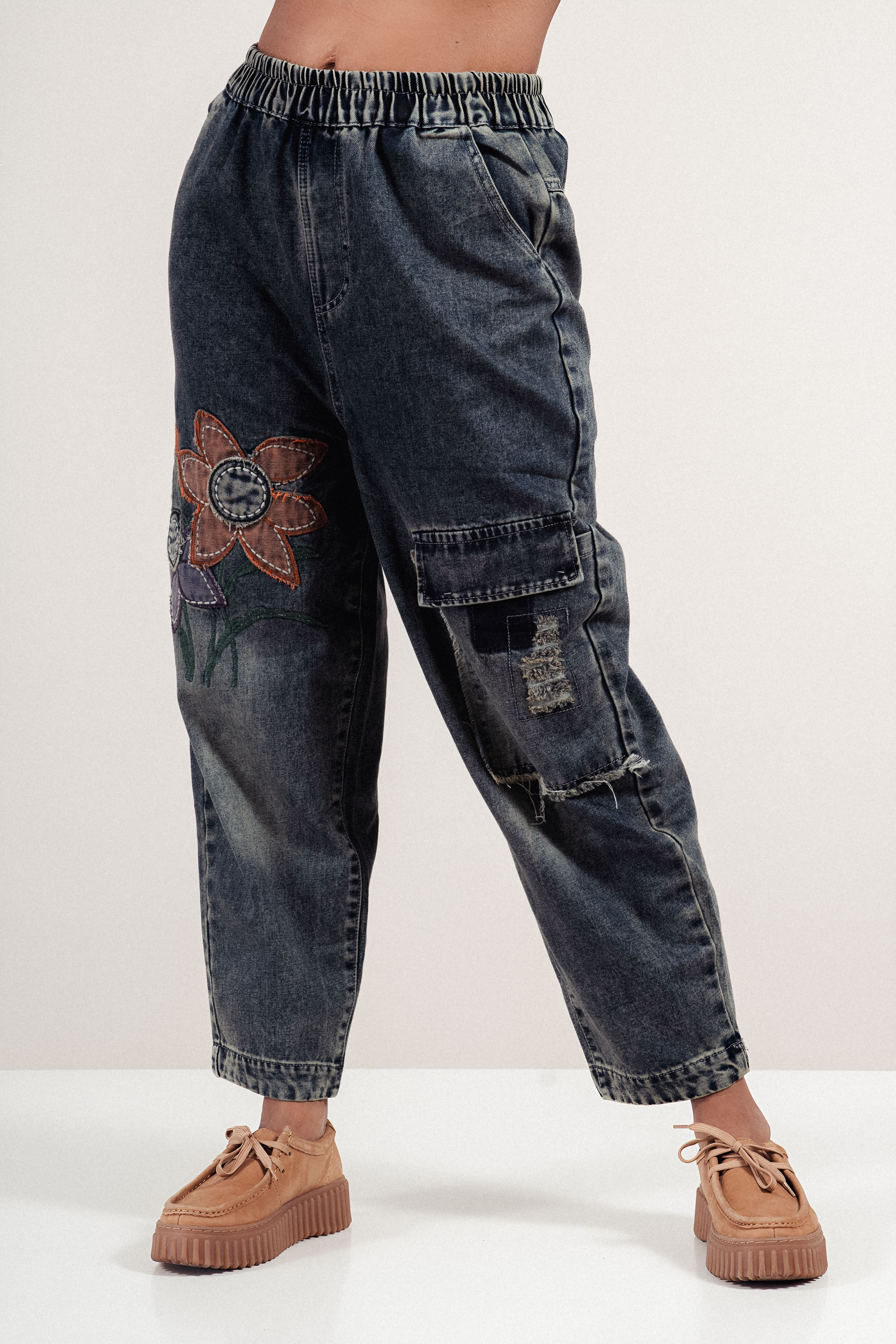 Дамски дънки от мек деним в син винтидж цвят. Моделът е с удобна ластична талия и практични странични джобове. Цветната флорална апликация отпред придава артистичен акцент и индивидуалност, а леките накъсвания по крачолите допълват модерен, небрежен стил. Подходящи за ежедневие и градски визии с тениска или блуза.