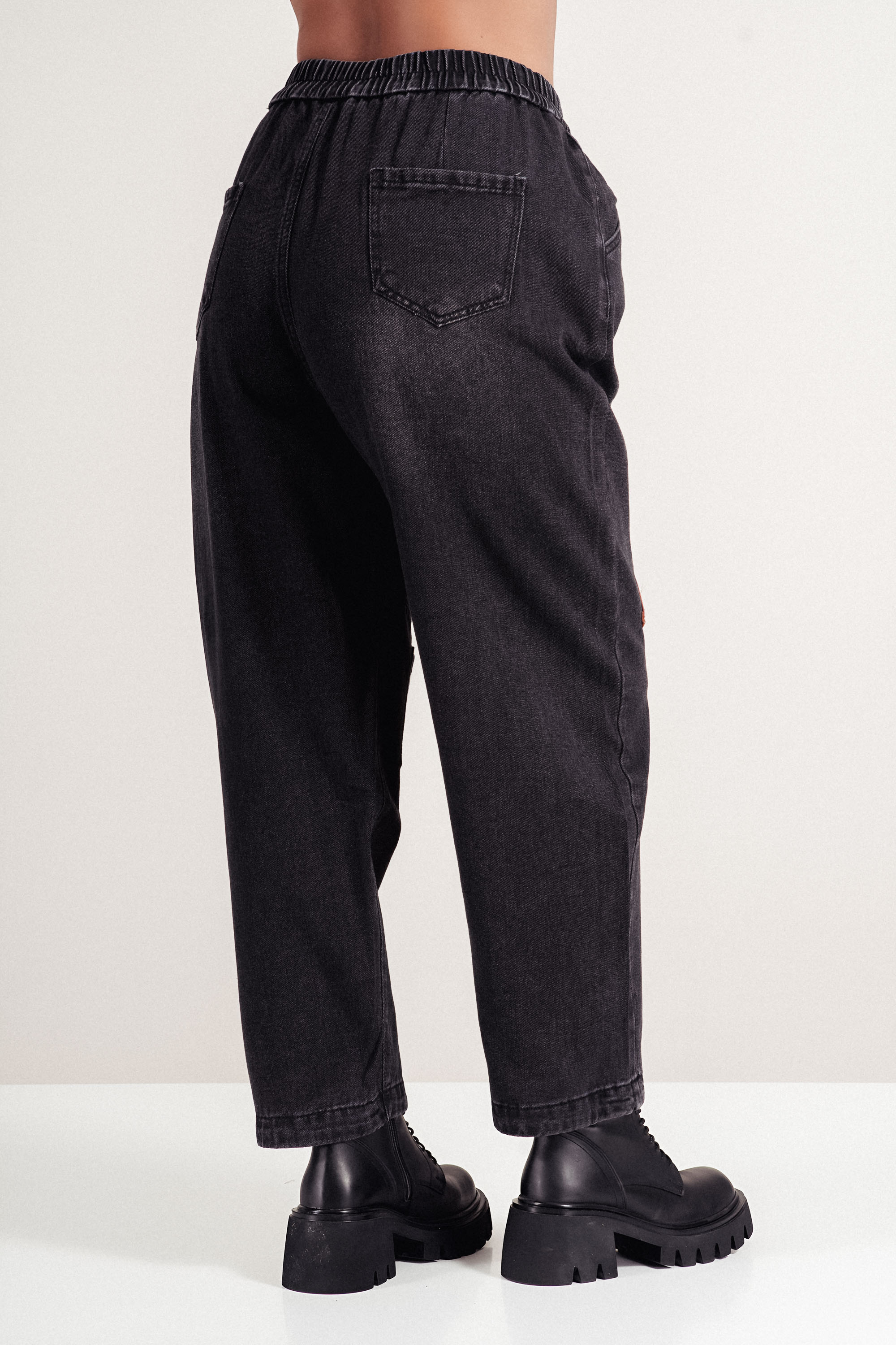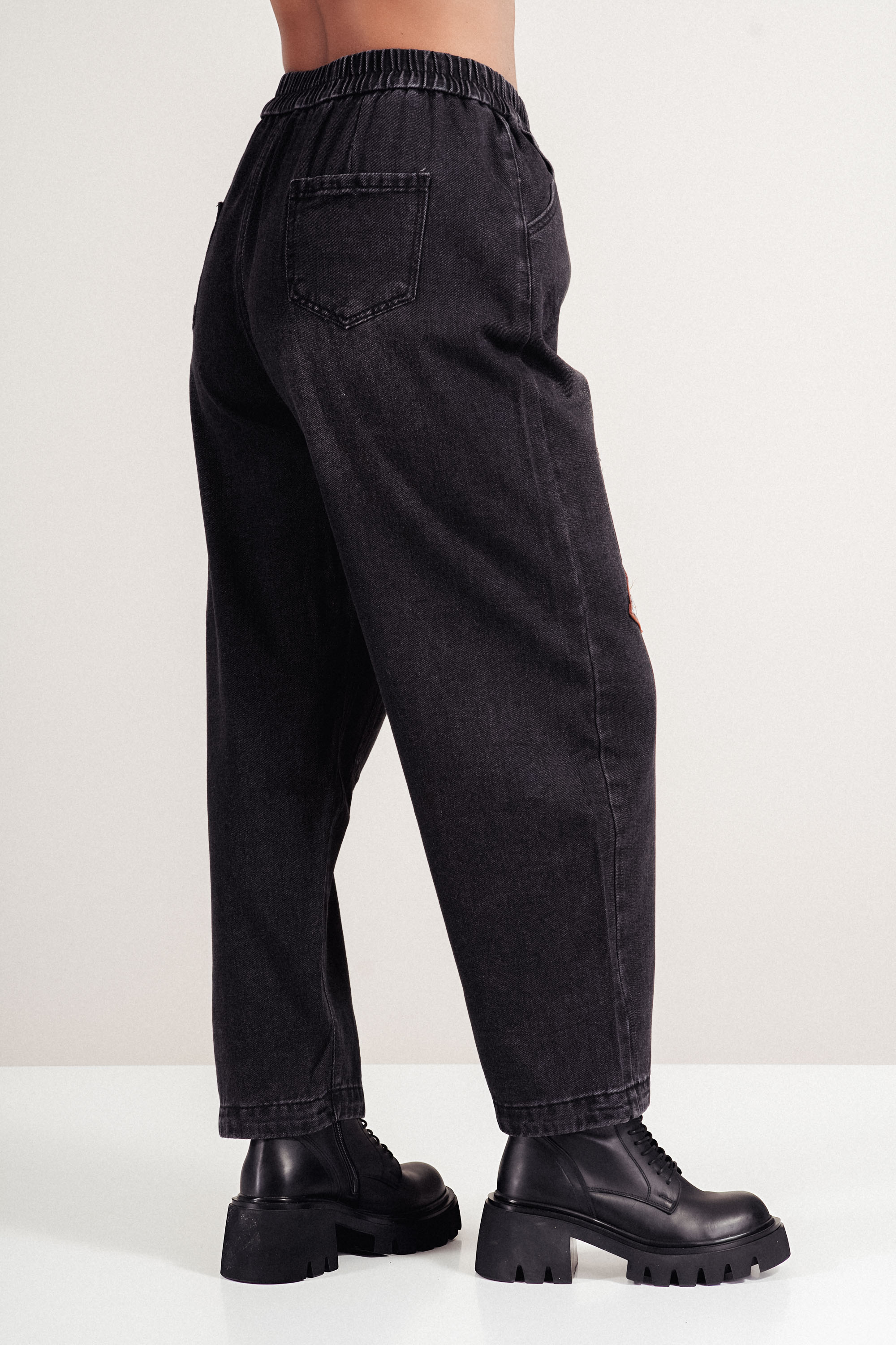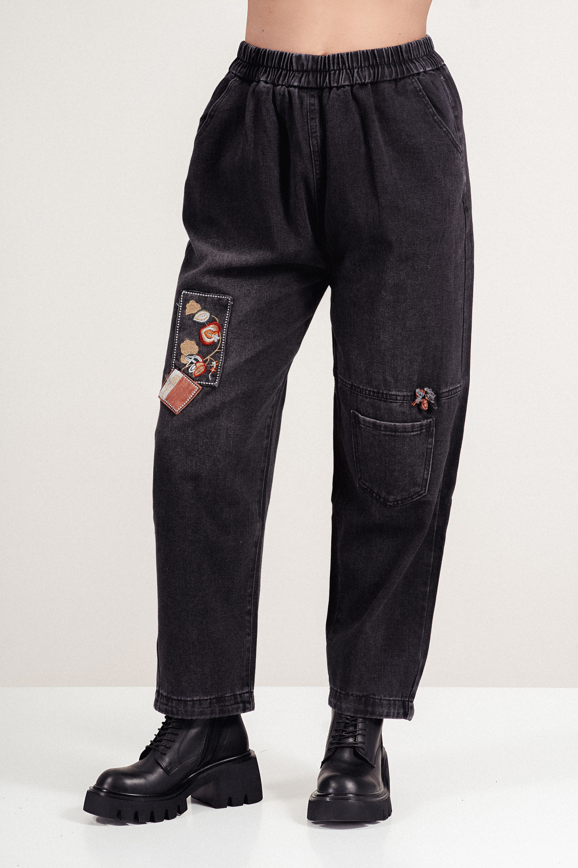 Модерни дънки от мек деним в изтънчен черен нюанс. Моделът е с ластична талия и права кройка, която осигурява комфорт и свобода на движение. Артистичната бродерия в червено и бежово добавя оригинален акцент, а еластичните маншети в подгъва придават съвременна визия. Подходящи за ежедневието, пътувания или градски разходки