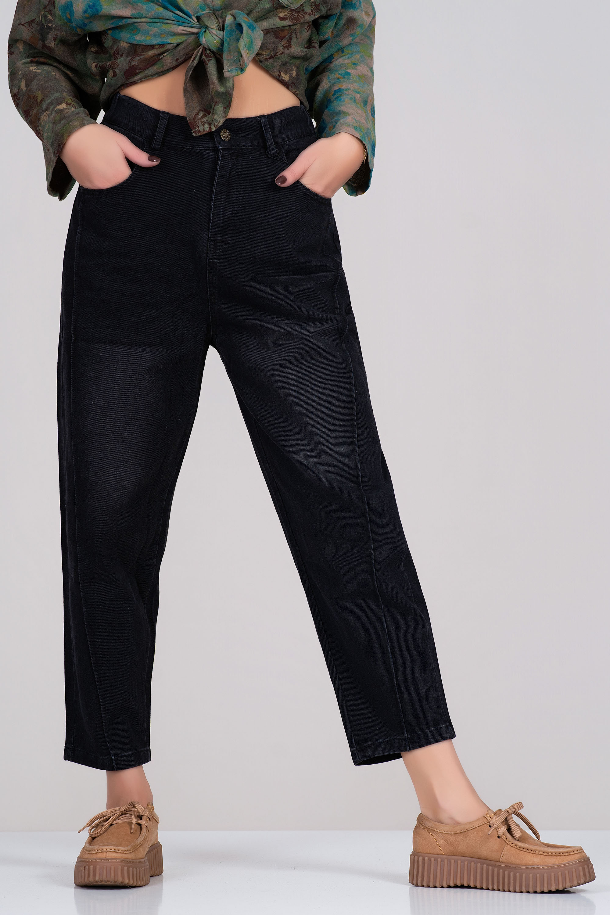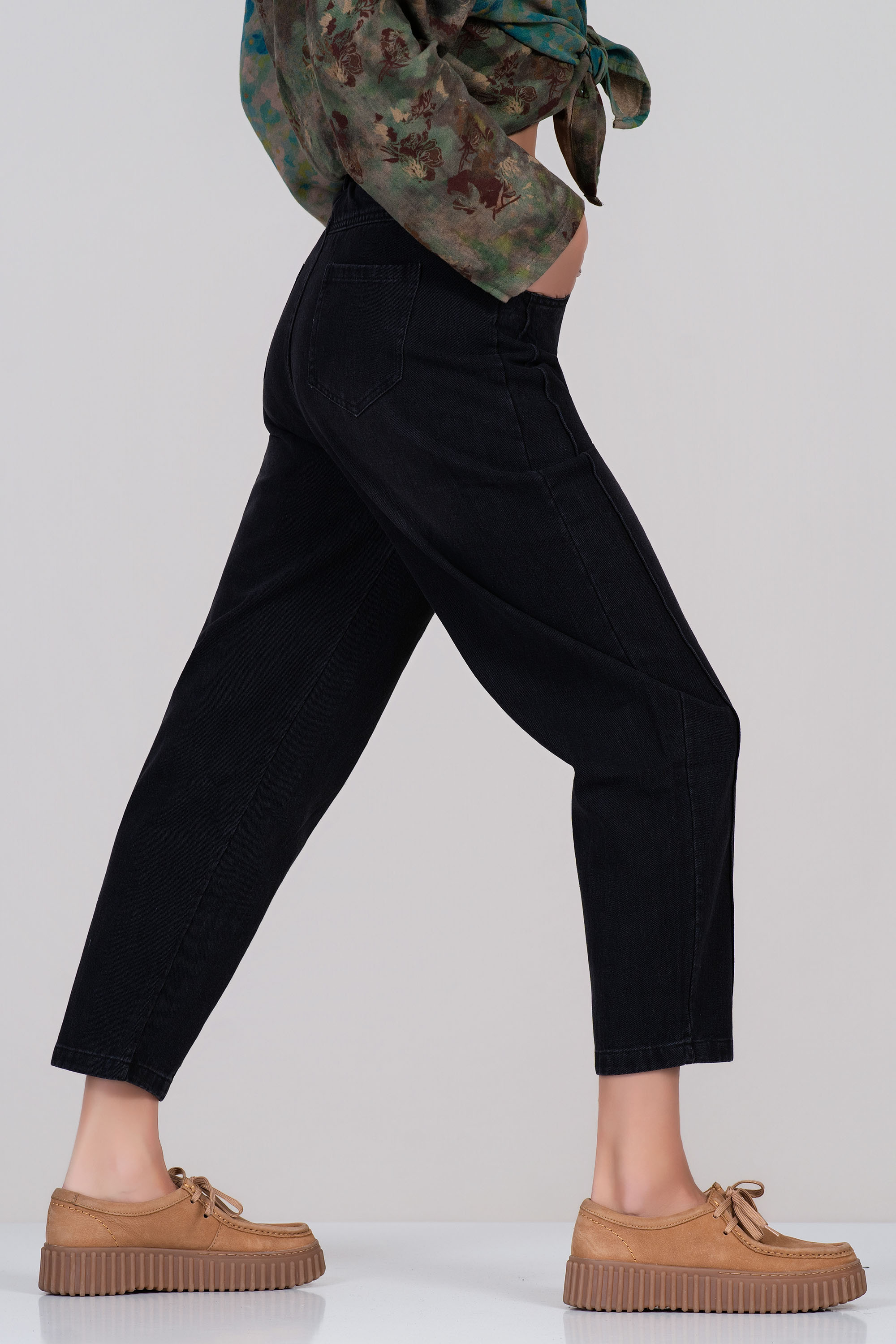 Тези дънки в класически черен деним са елегантна и практична основа за всекидневен гардероб. Моделът е с леко скъсена дължина и ластик на талията. Предните кантове визуално издължават крака и придават структурирана линия. Подходящи за комбиниране с ризи, блузи и плетива.