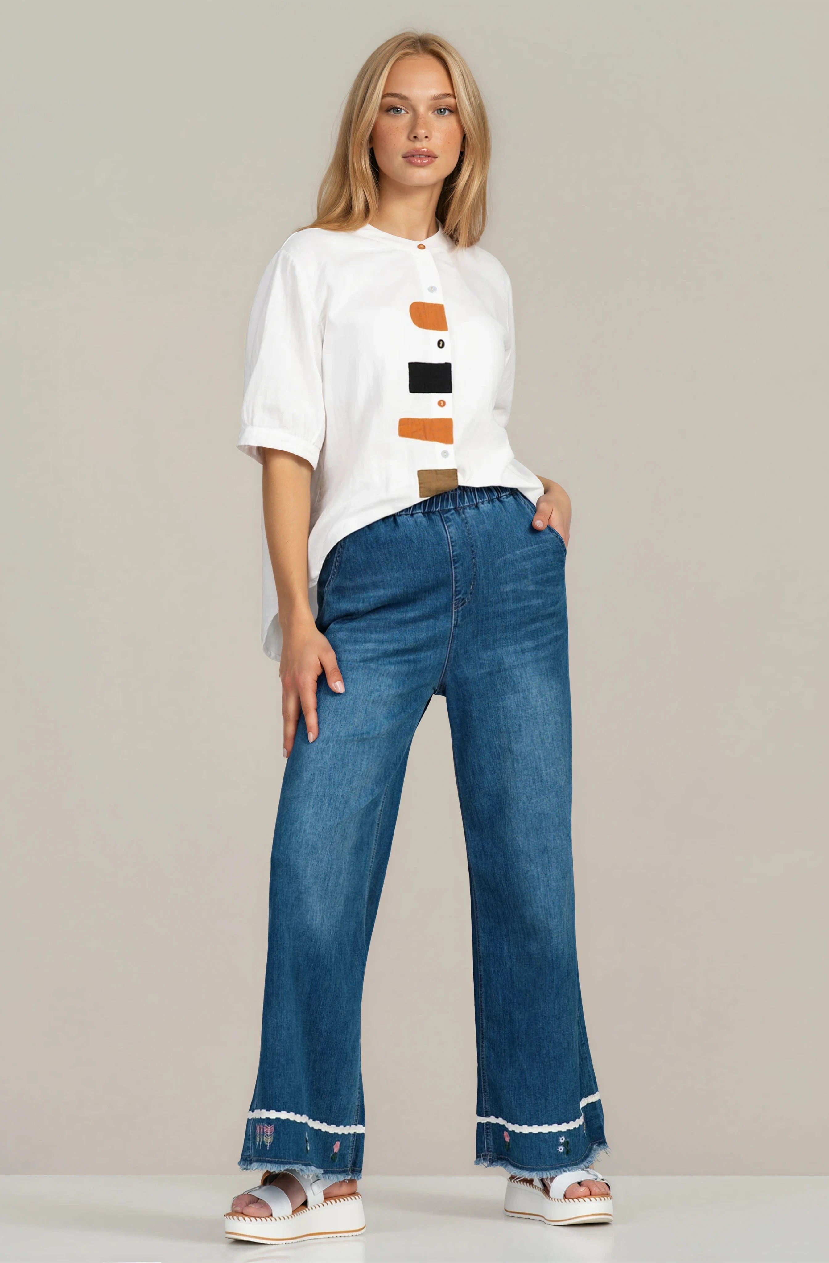 Ежедневни дамски дънки с модерна визия и отличителни флорални акценти. Деним материята осигурява устойчивост и комфорт при носене, а еластичната талия гарантира перфектно прилягане. Свободният силует е подходящ за динамично ежедневие и създава актуално градско излъчване. Лесно се комбинират с тениски, ризи или топове.