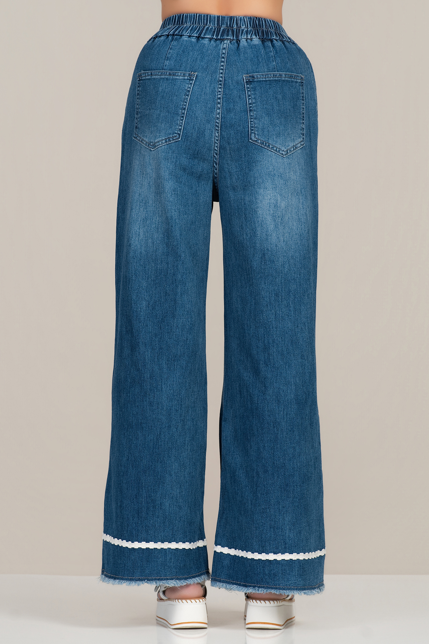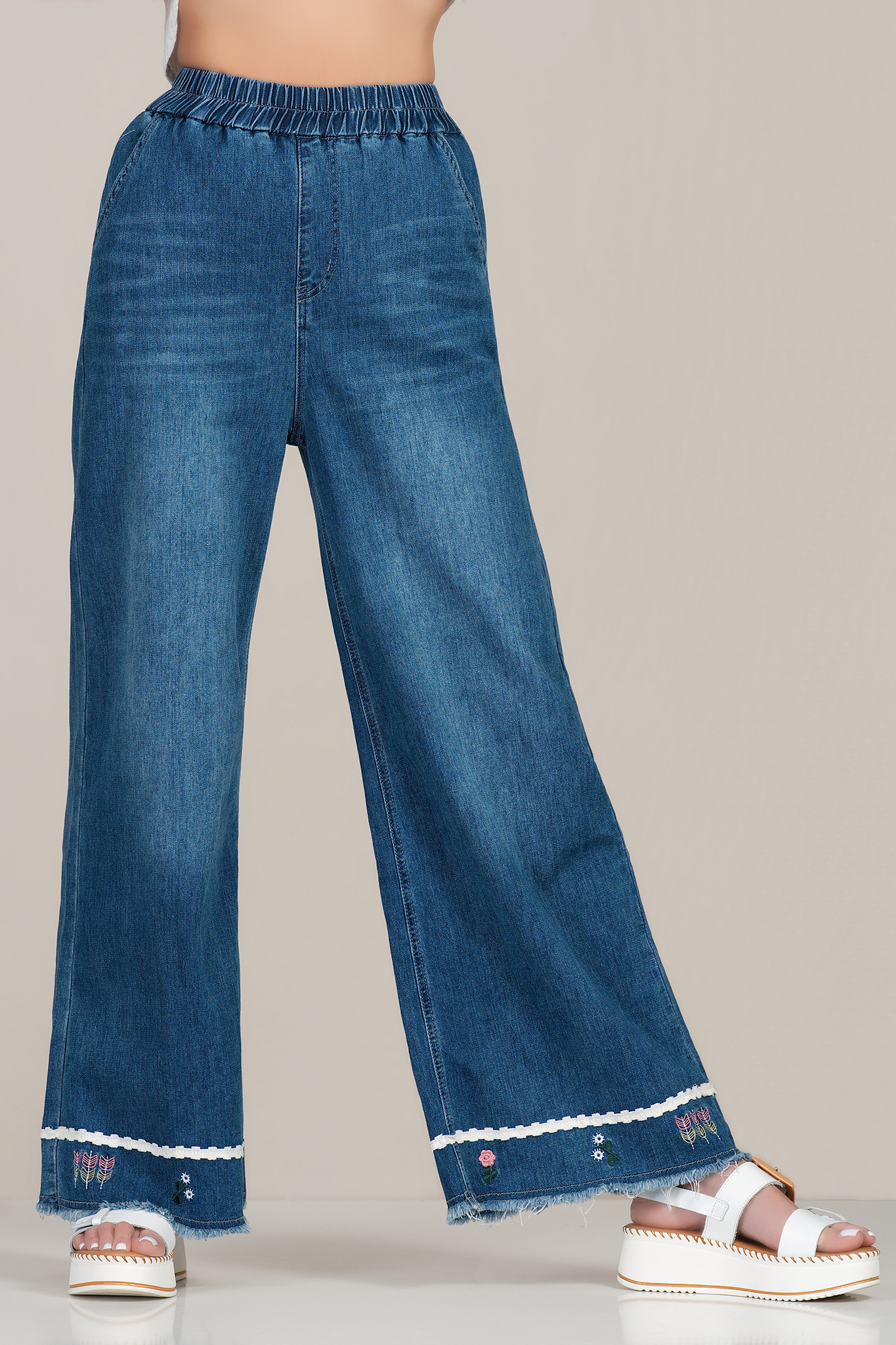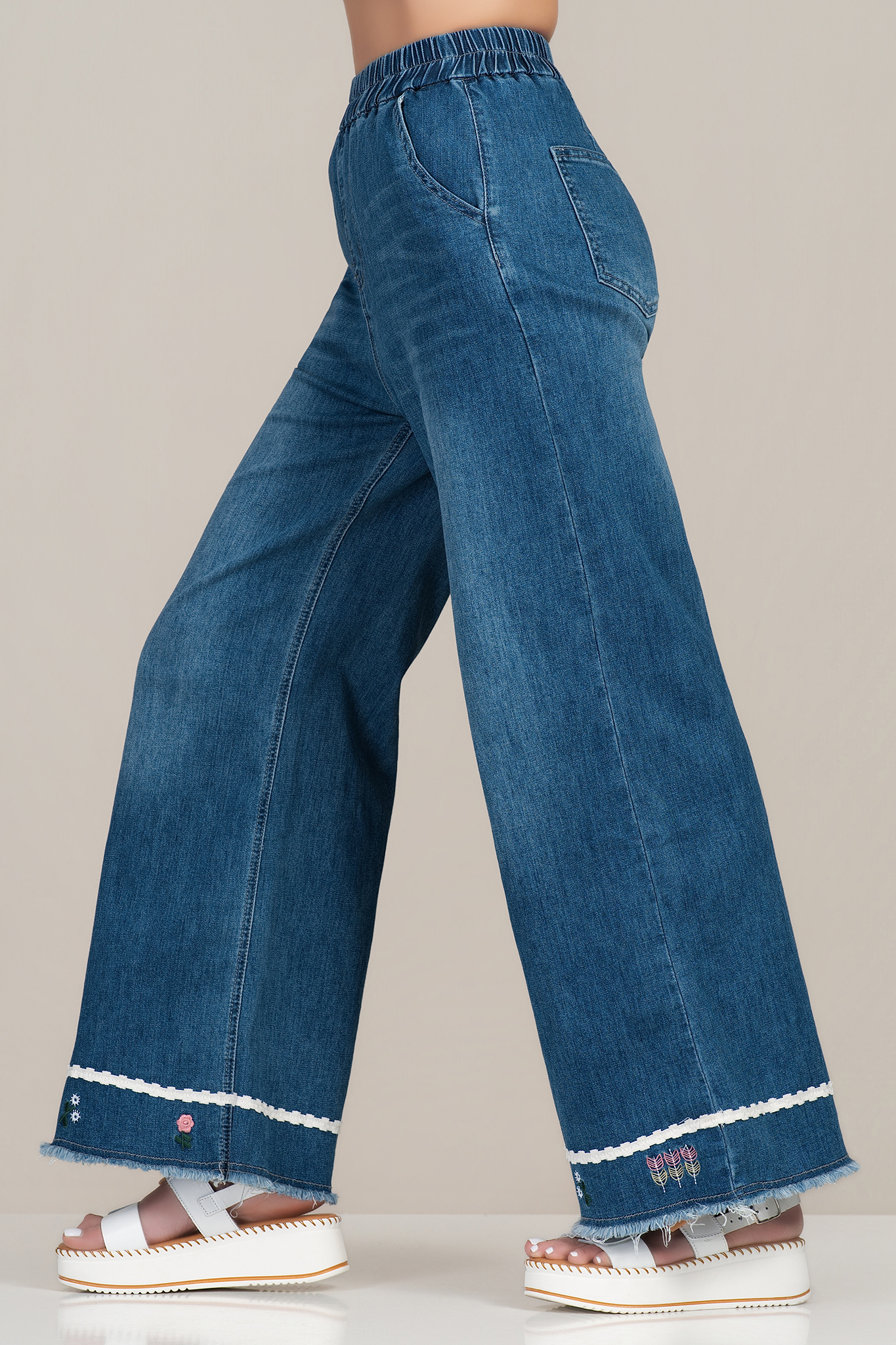 Дамски дънки в синьо с еластична талия и флорална бродерия в края