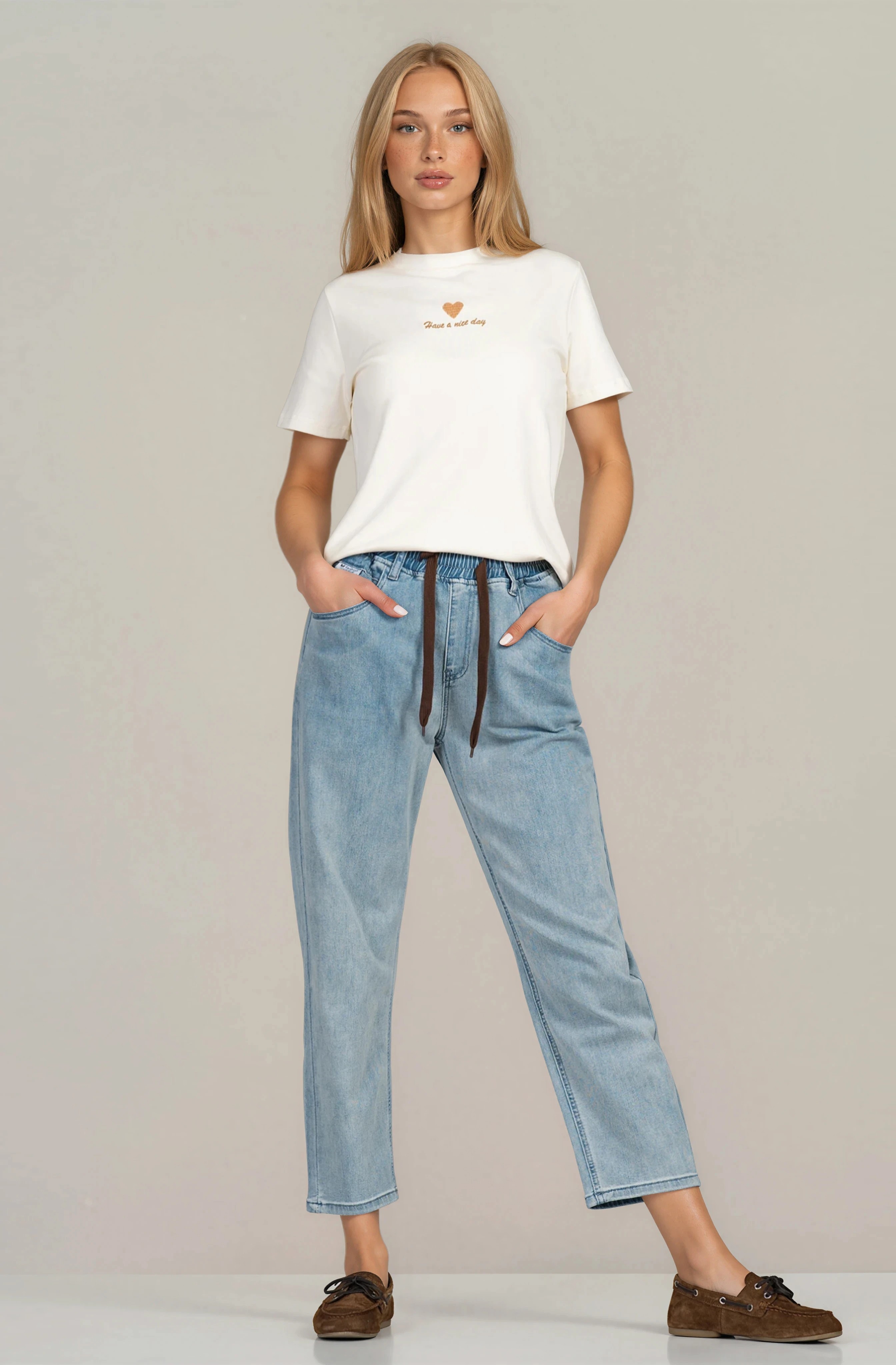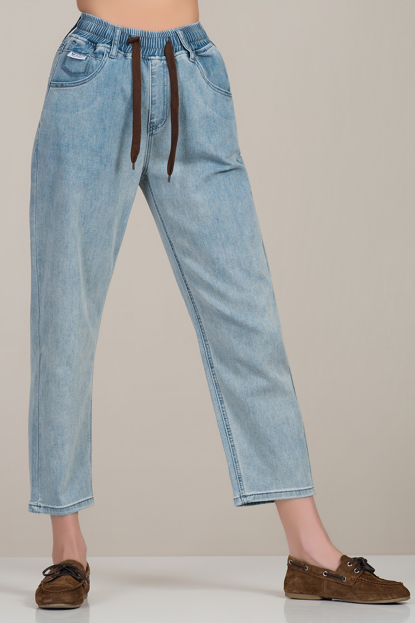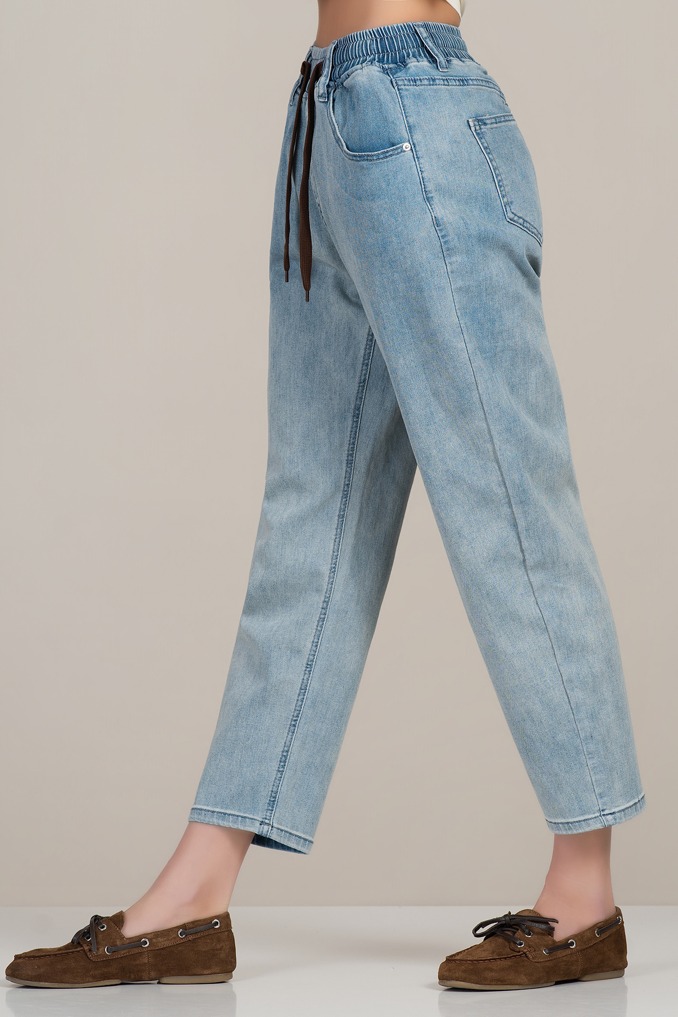 Дамски дънки в светлосиньо със свободна кройка, ластик и връзки в талията
