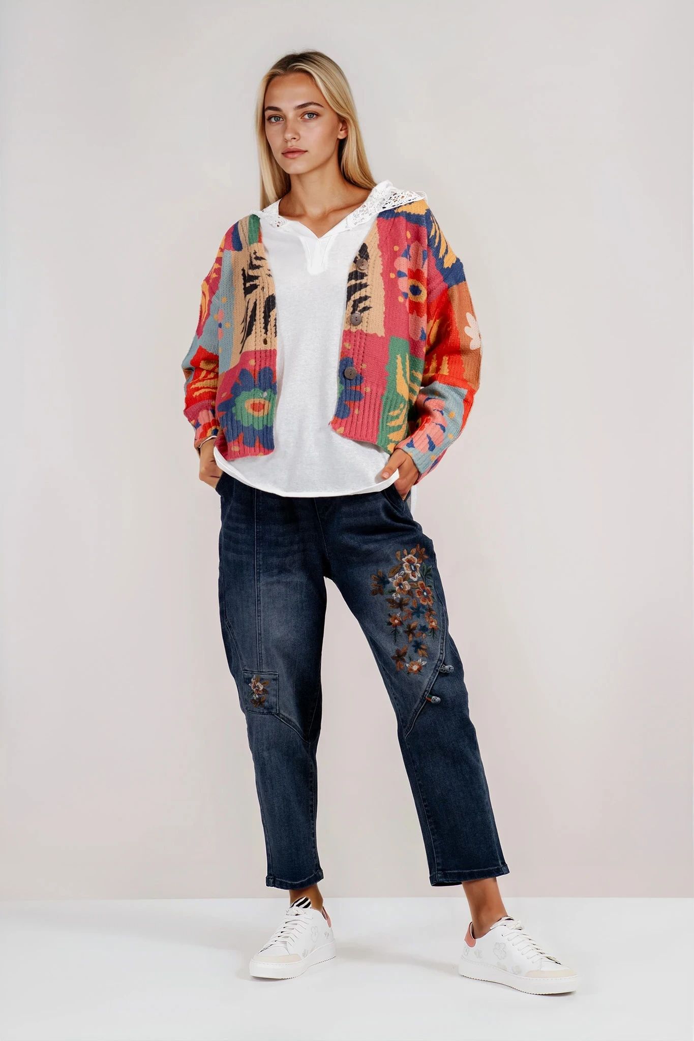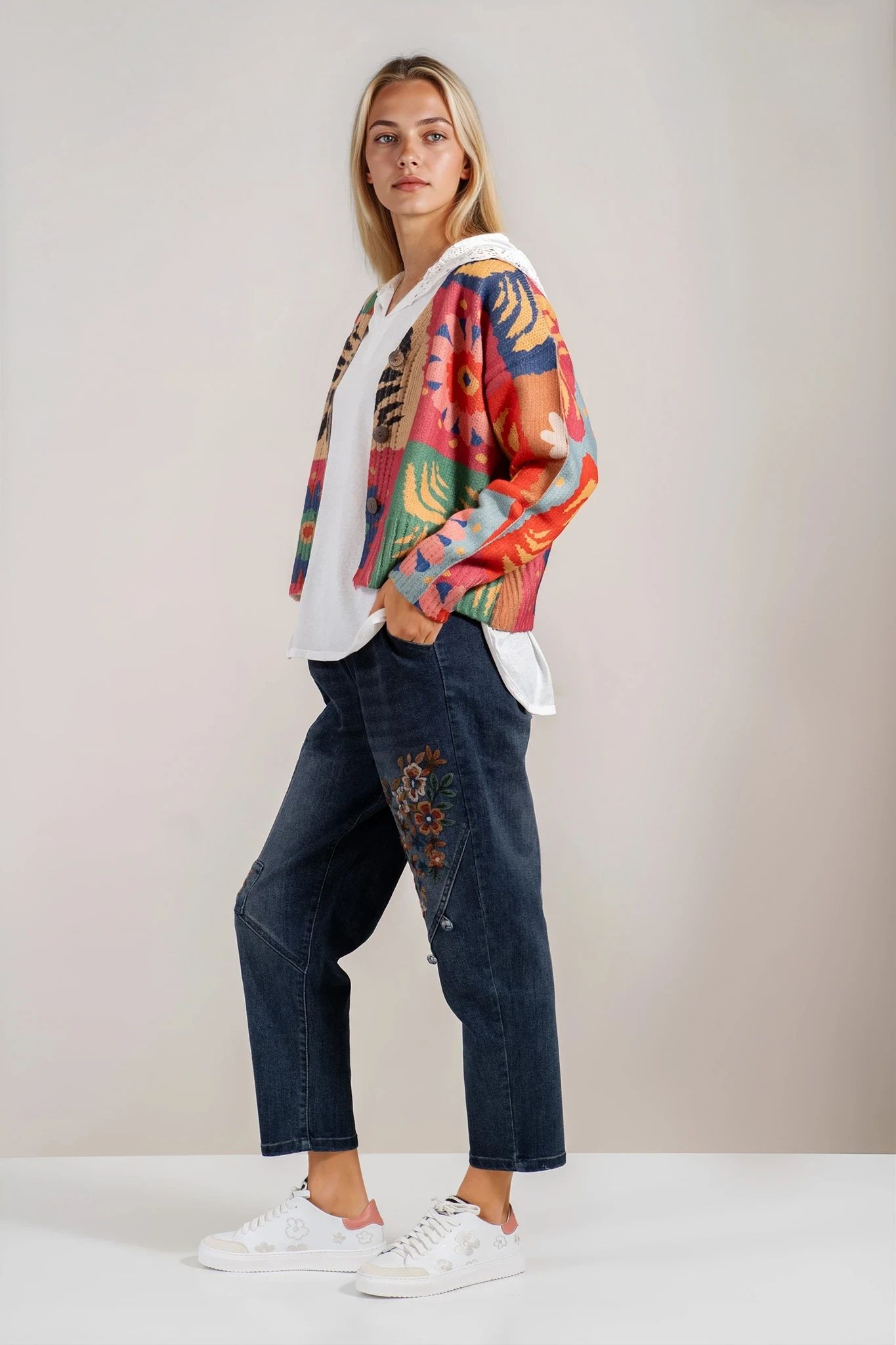 Дамски дънки в тъмносиньо с флоралана бродерия и ластик в талията