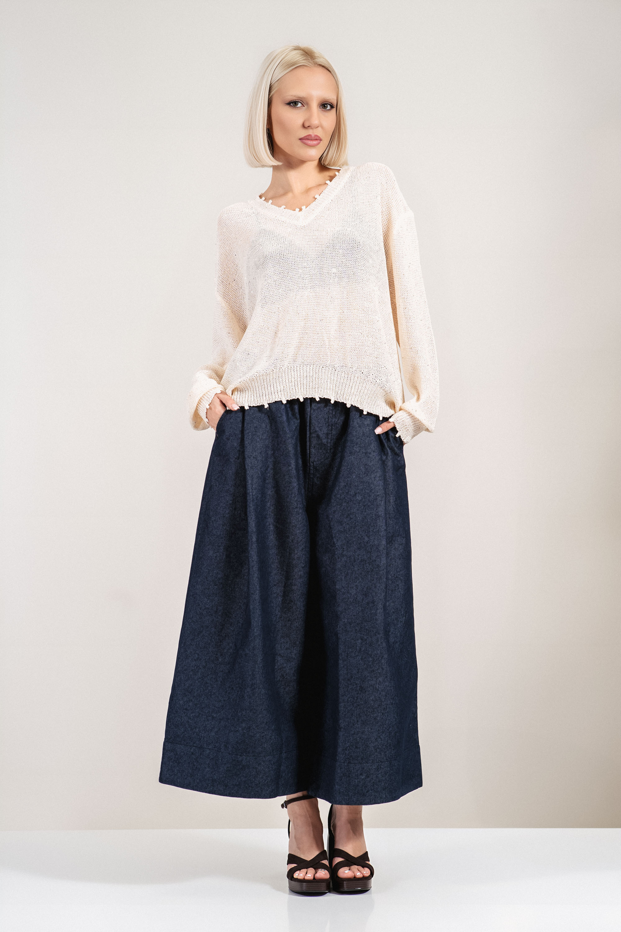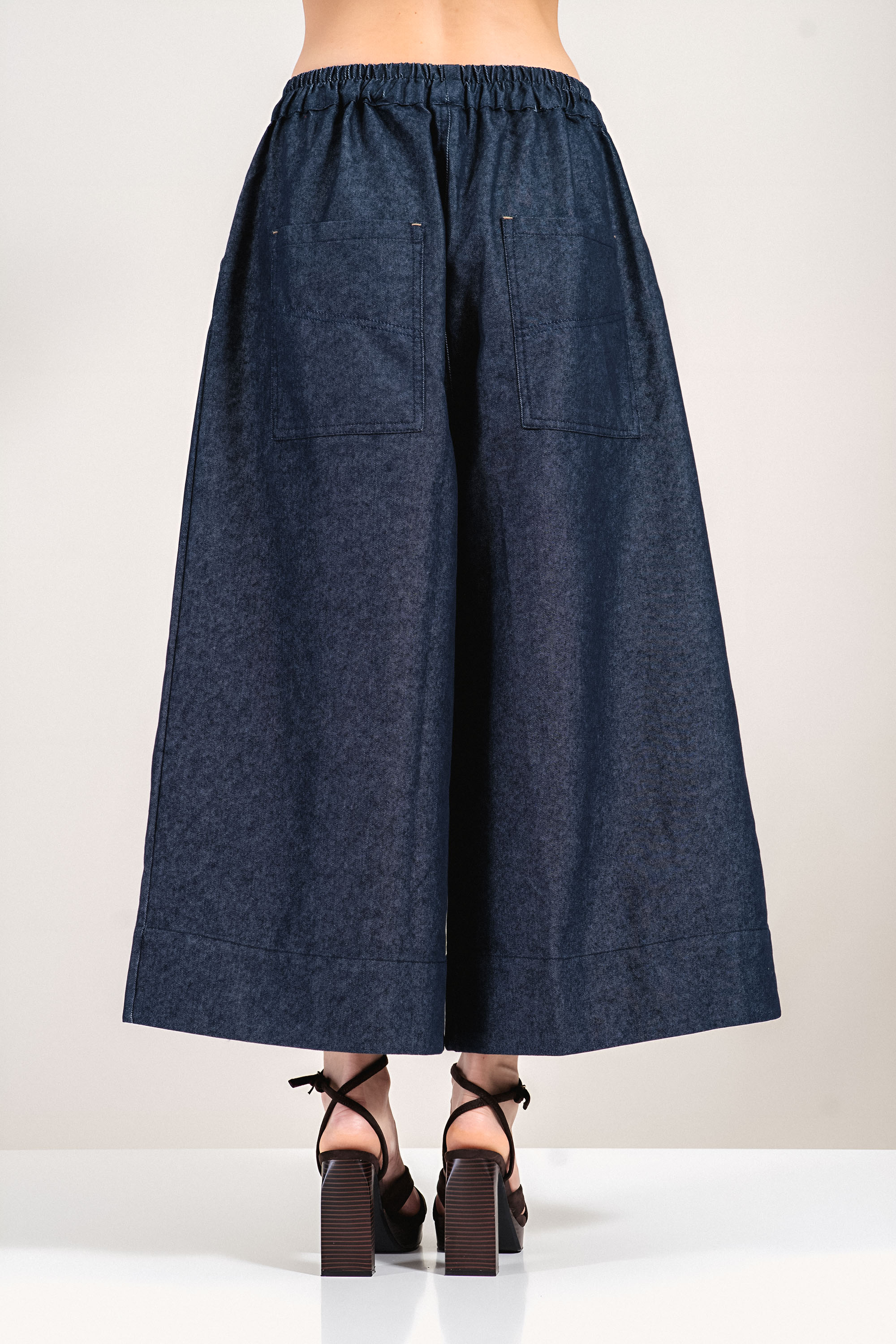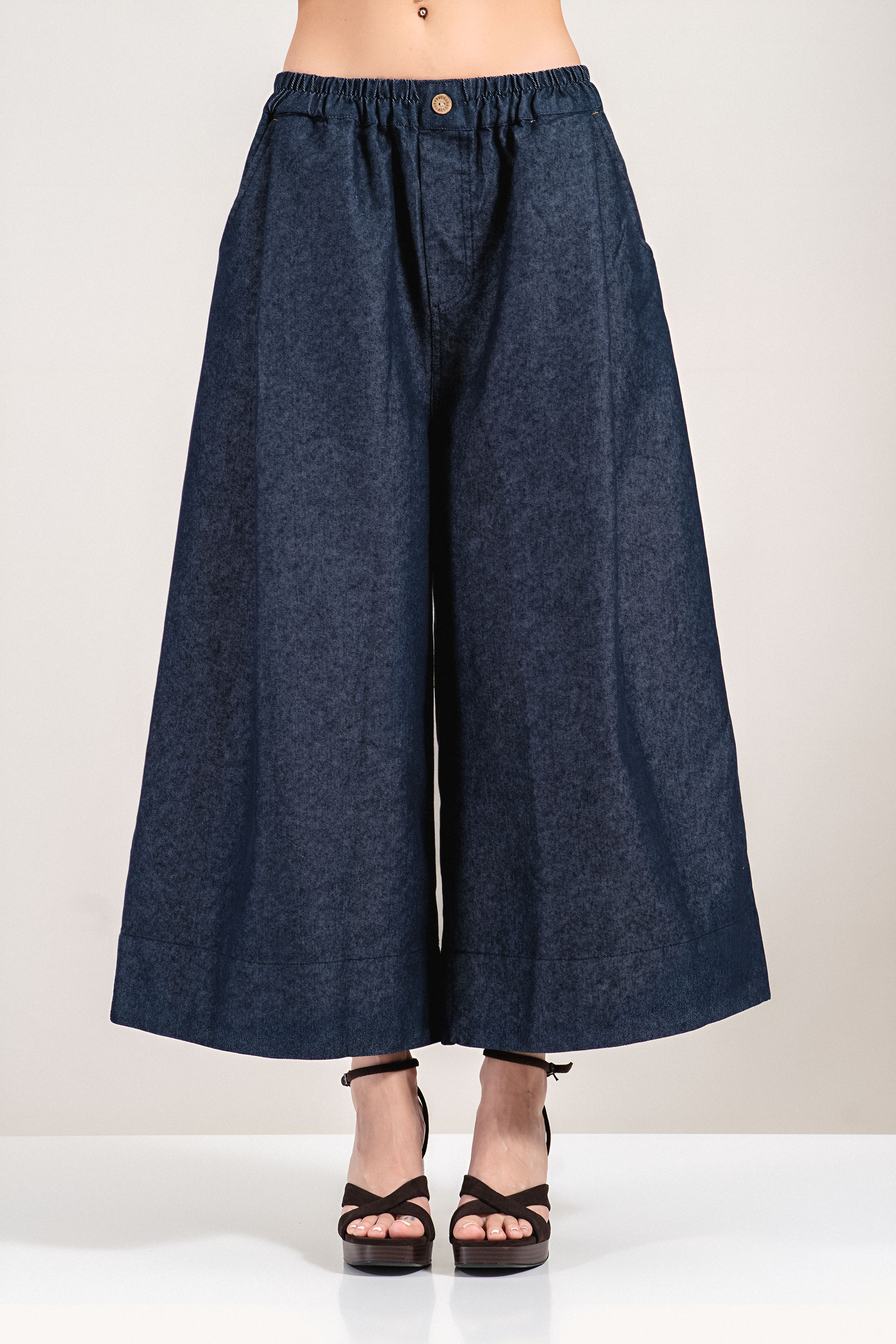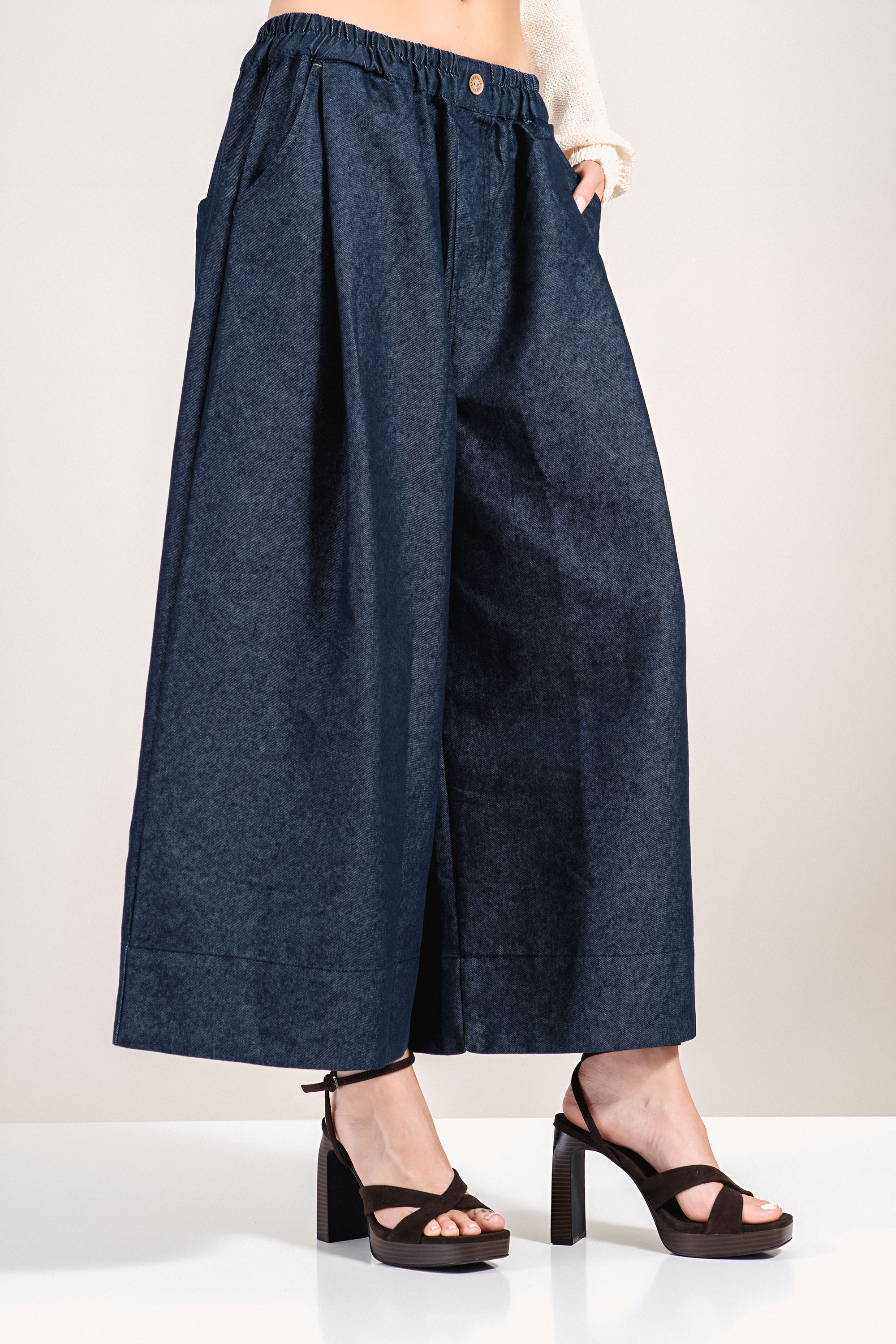 Дамски дънки в тъмносиньо с широк крачол и еластична талия