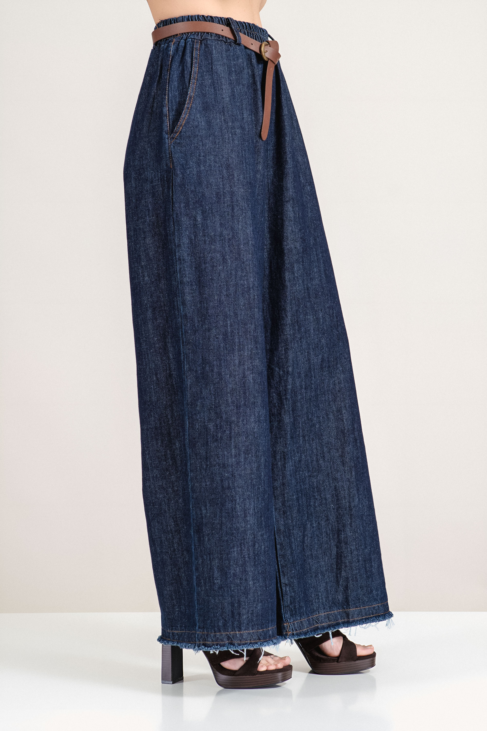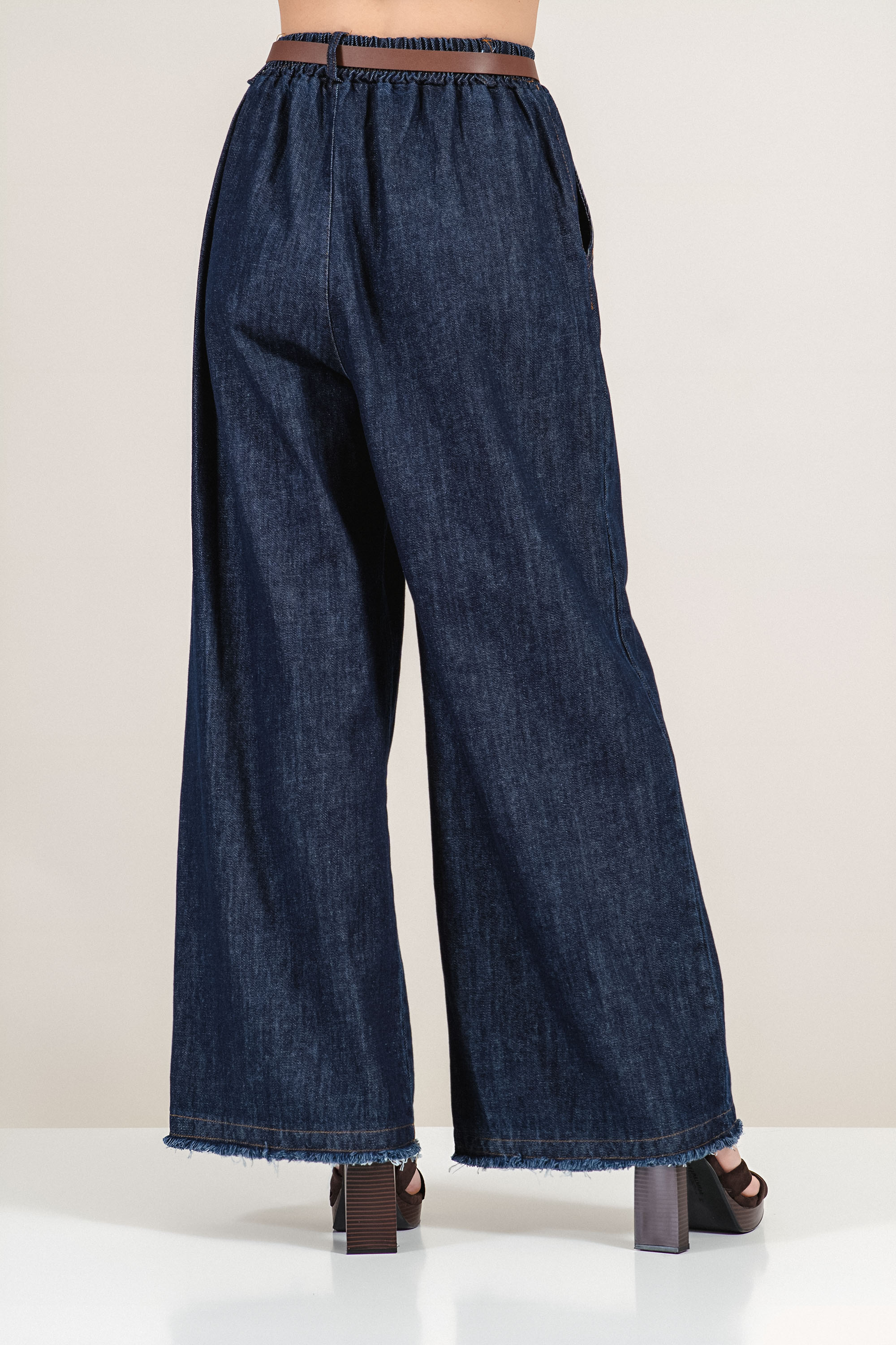 Дамски дънки в тъмносиньо с широк крачол с накъсвания в края и допълнителен колан