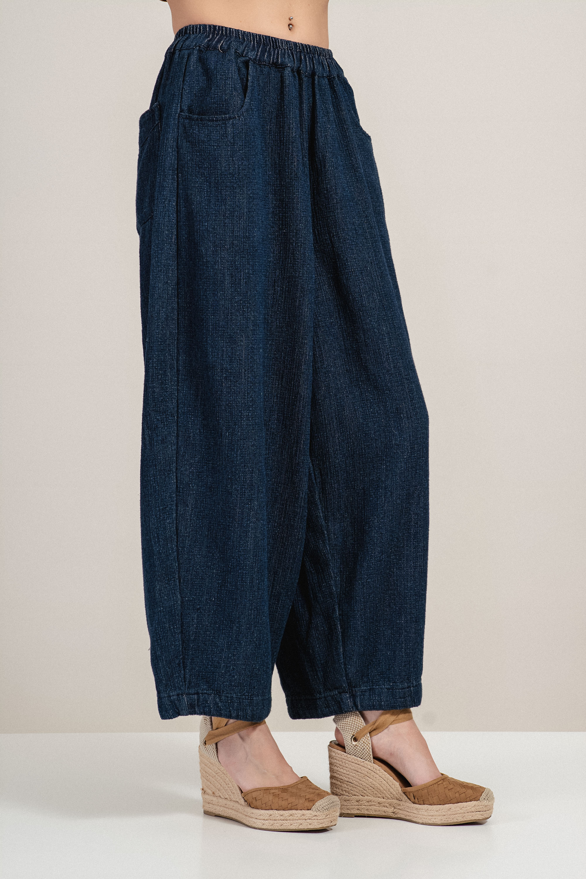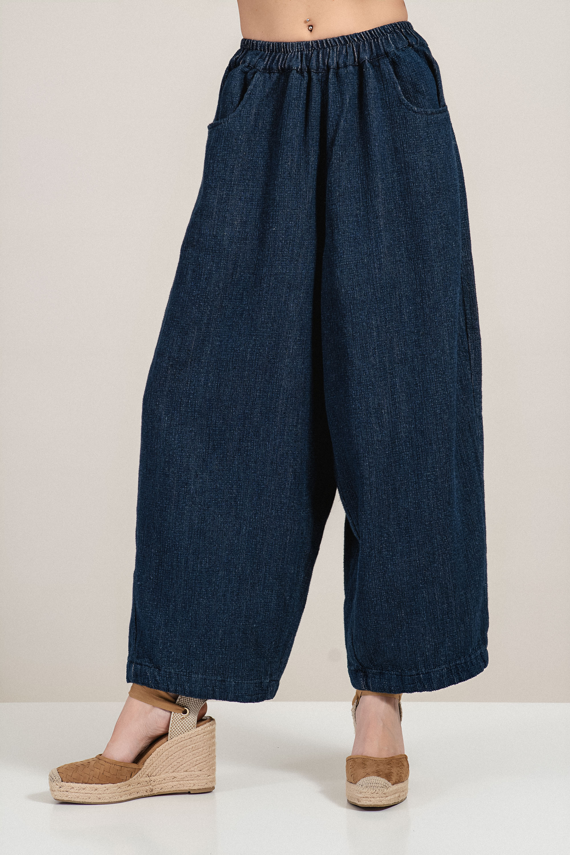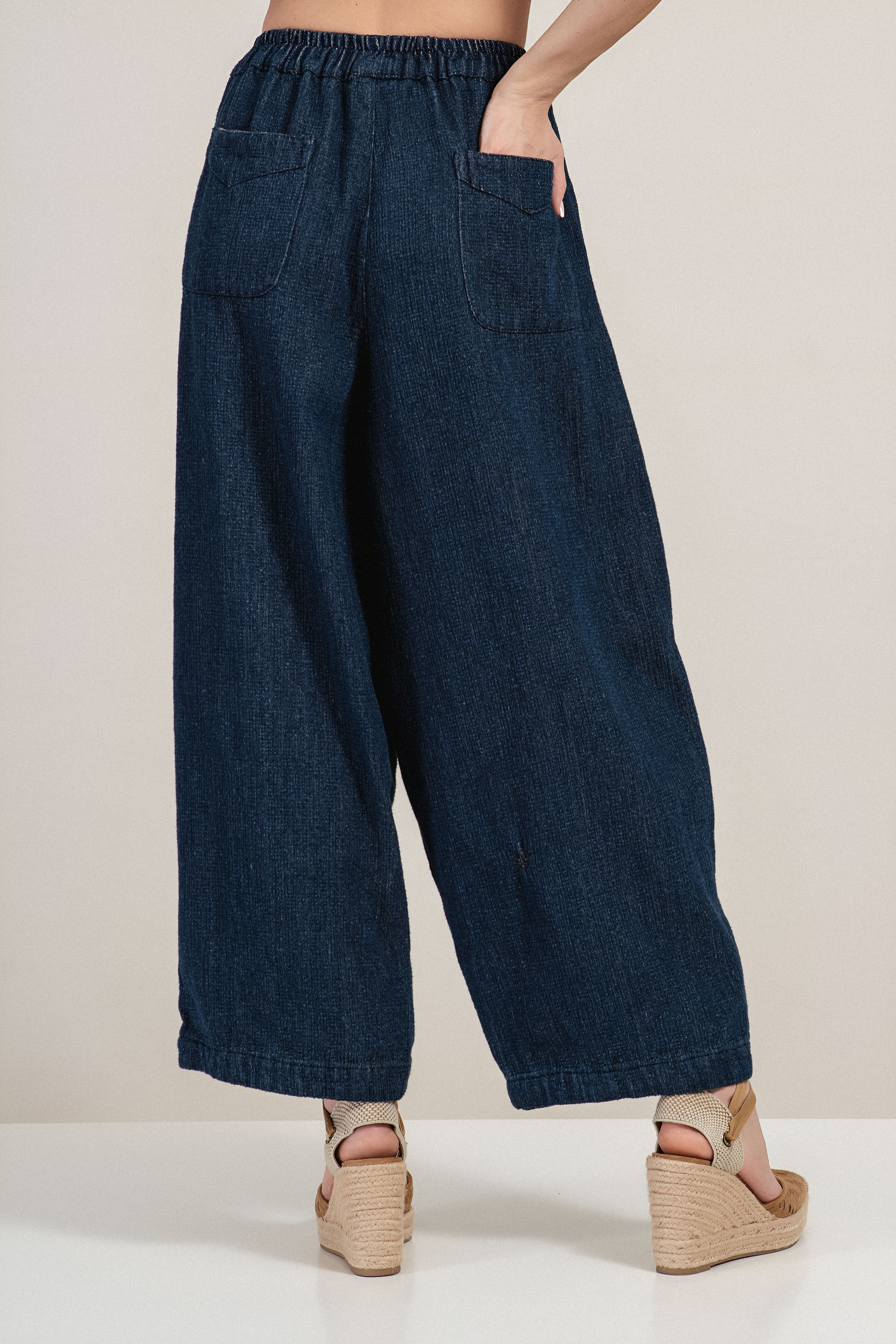 Стилен панталон от деним с тъмносин цвят и модерна свободна линия. Памучната материя осигурява здравина и комфорт при носене, подходяща за ежедневна употреба. Ластикът в талията гарантира удобно прилягане, а широкият крачол създава актуален силует и свобода на движение. Идеален избор за градски визии, комбиниран с тениски, ризи или по-елегантни топове.
