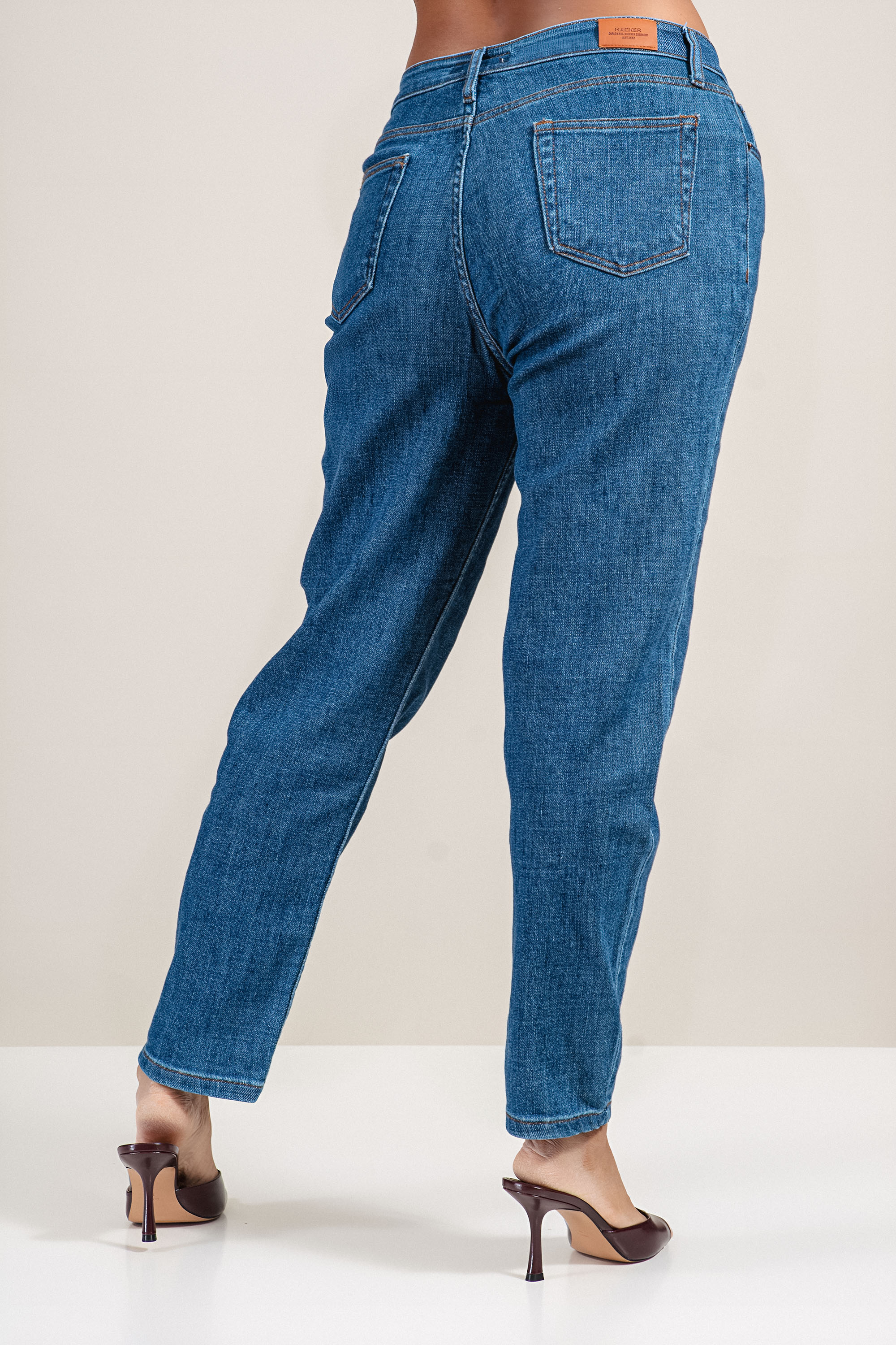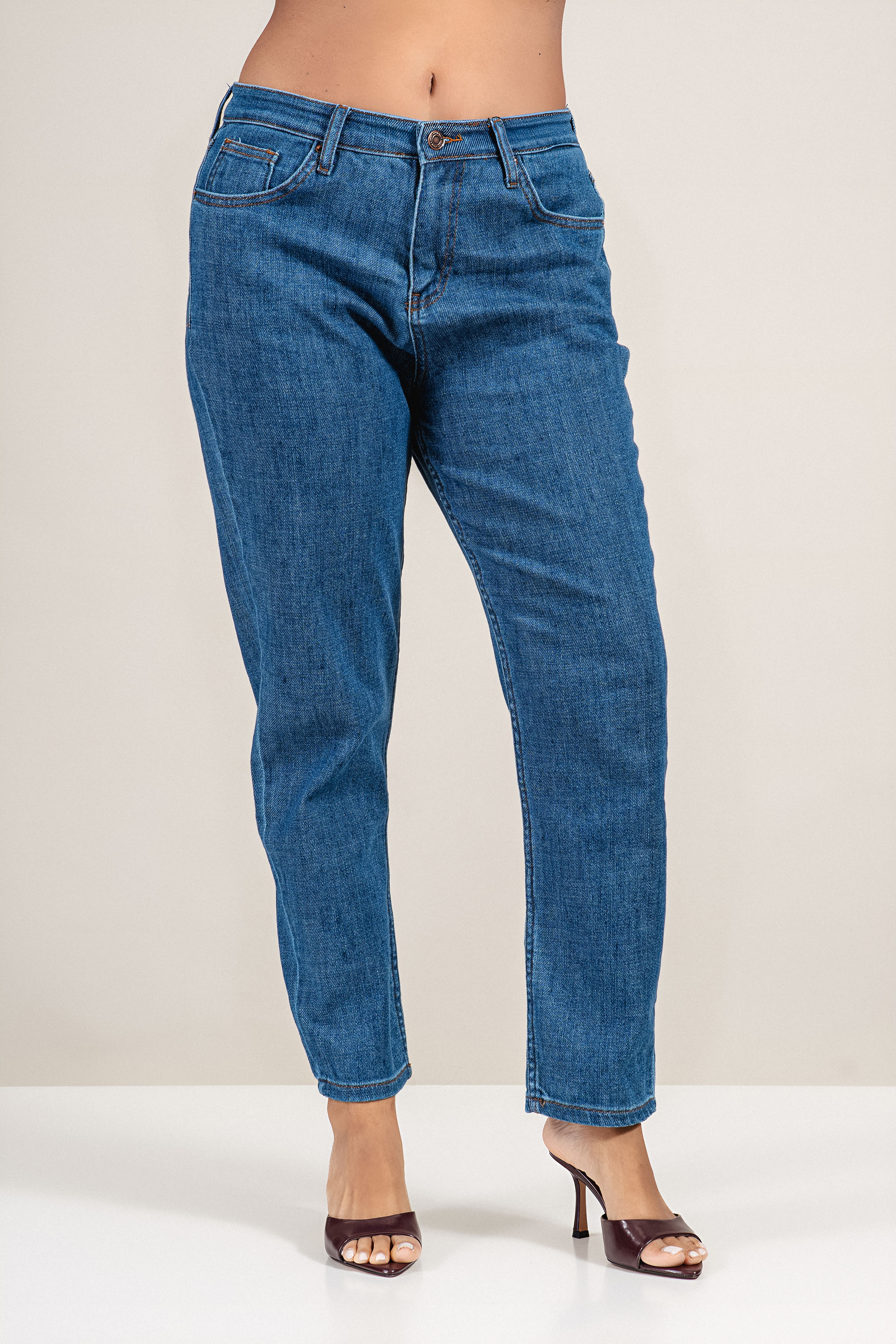 Стилен модел с изчистена линия и модерен деним акцент. Дънките са едноцветни в класически син нюанс, с подчертани предни шевове по крачолите, които визуално издължават силуета. Жълтите кантове добавят фин контраст и индивидуалност към визията. Памучната материя с добавен спандекс осигурява комфорт, еластичност и добро прилягане към фигурата, което ги прави подходящ избор за ежедневие през пролетно-летния сезон.