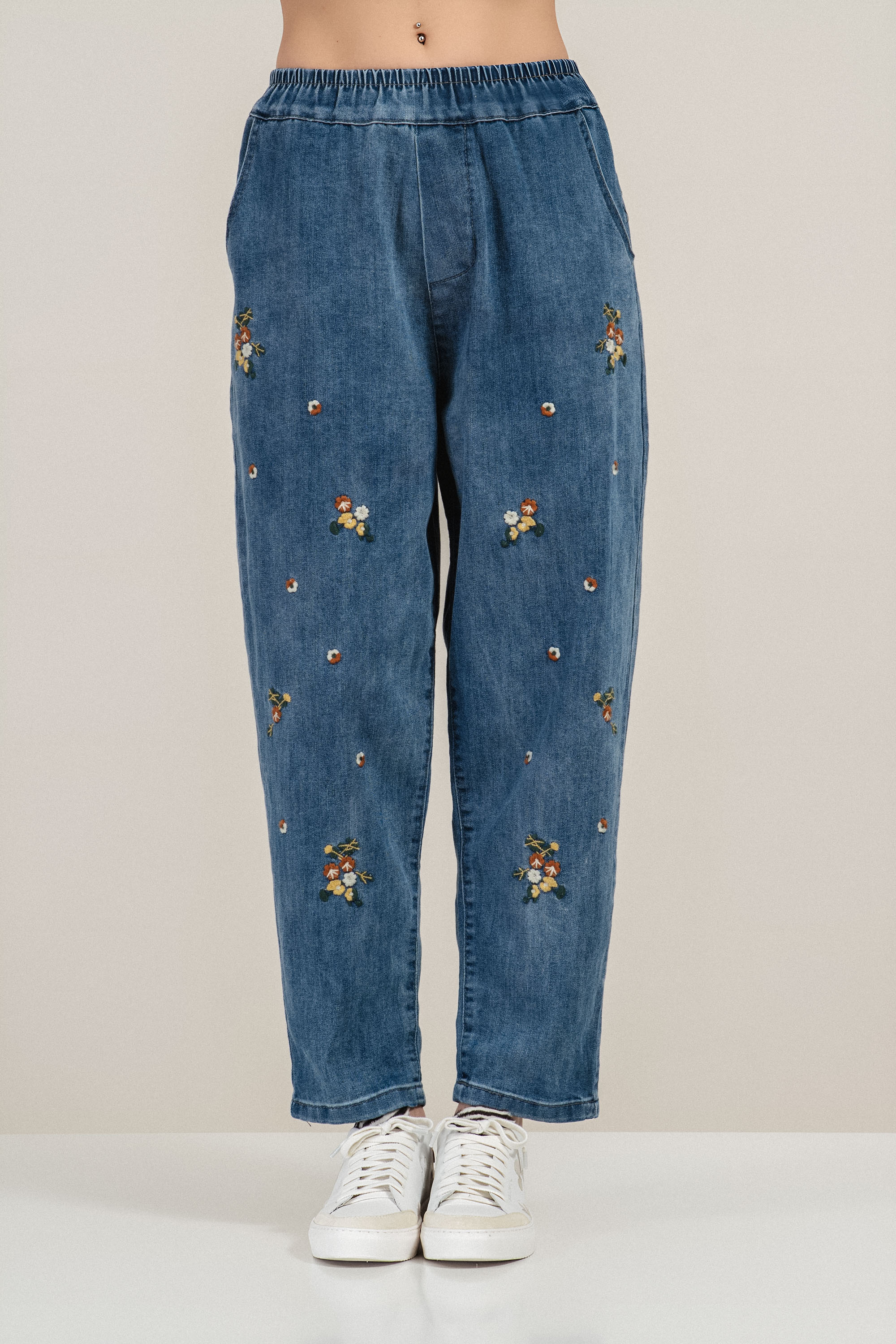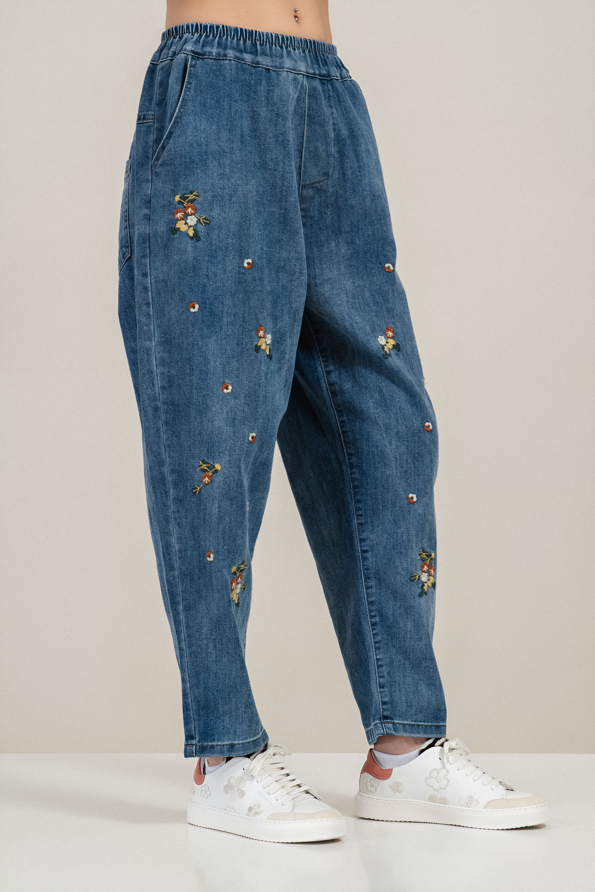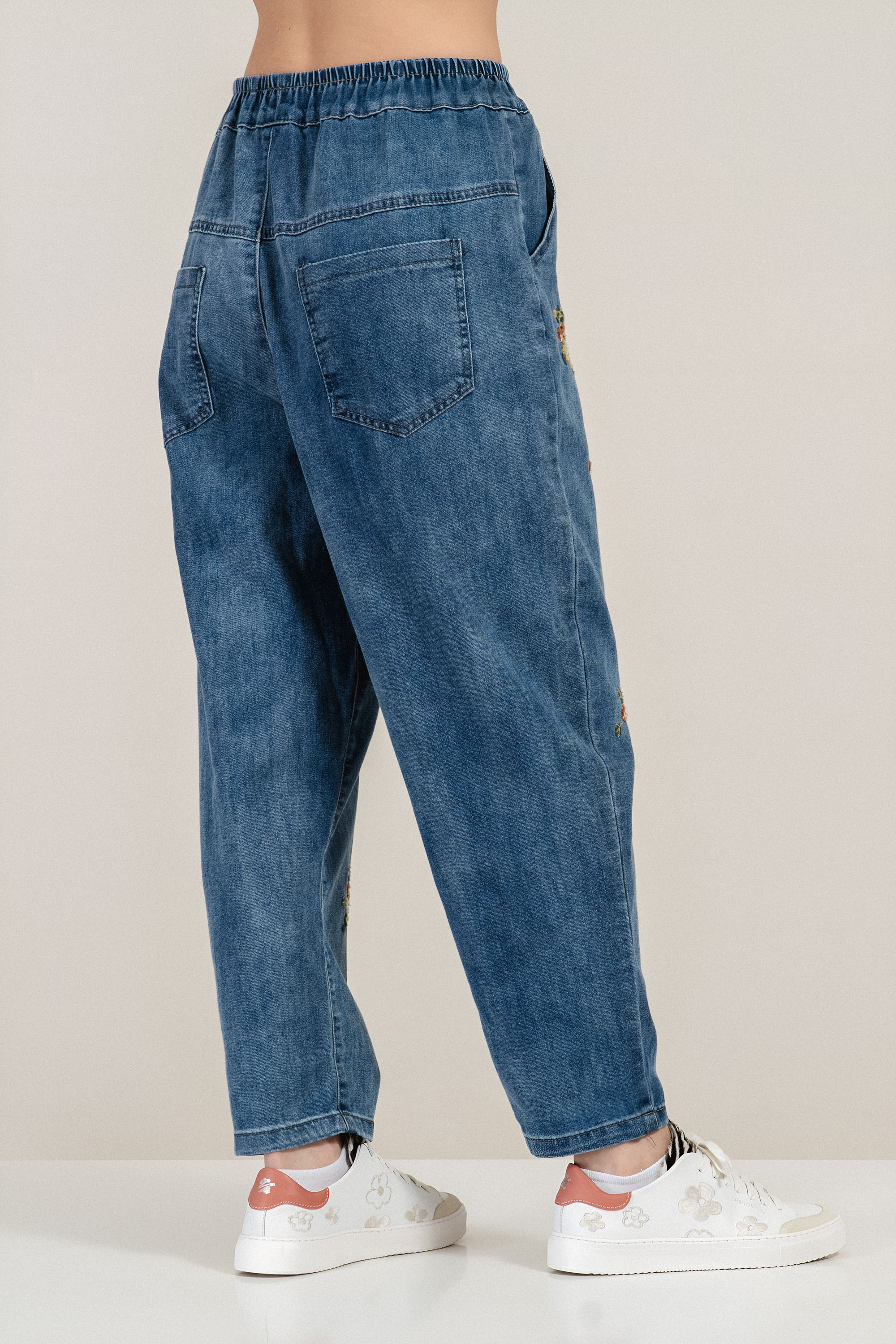 Класически модел дънки в син деним с комфортна линия и модерни акценти. Памучната основа осигурява естествена здравина и удобство, а добавеният еластан придава необходимата еластичност за свобода на движение. Ластикът в талията с вътрешно каре гарантира адаптивно прилягане, а бродираните цветя в жълто, зелено и оранжево създават отличителен завършек. Подходящ избор за ежедневни градски визии през всички сезони.