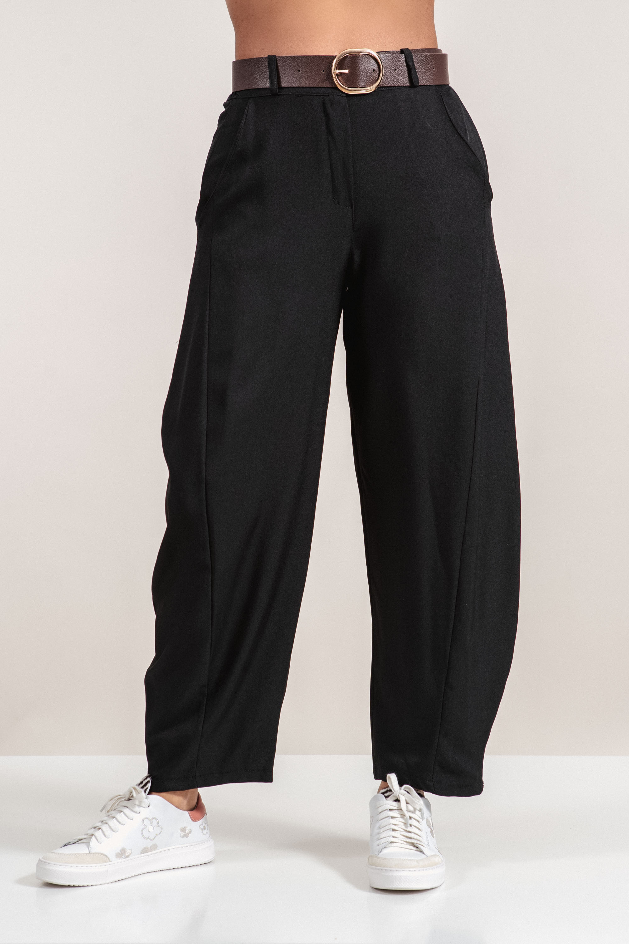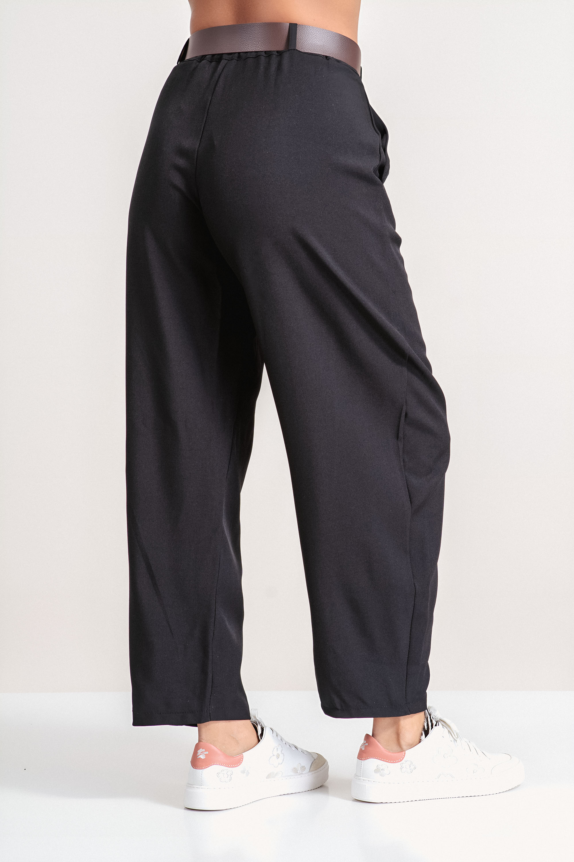 Стилен панталон със съвременен силует и минималистичен дизайн. Моделът е черен цвят и се отличава със свободен крачол, който придава елегантност и комфорт при носене. Ластикът в задната част на талията осигурява удобно прилягане, а коланът със златиста тока добавя изискан акцент към визията. Подходящ избор за комбиниране както с риза и сако, така и с лека блуза за модерна градска визия.