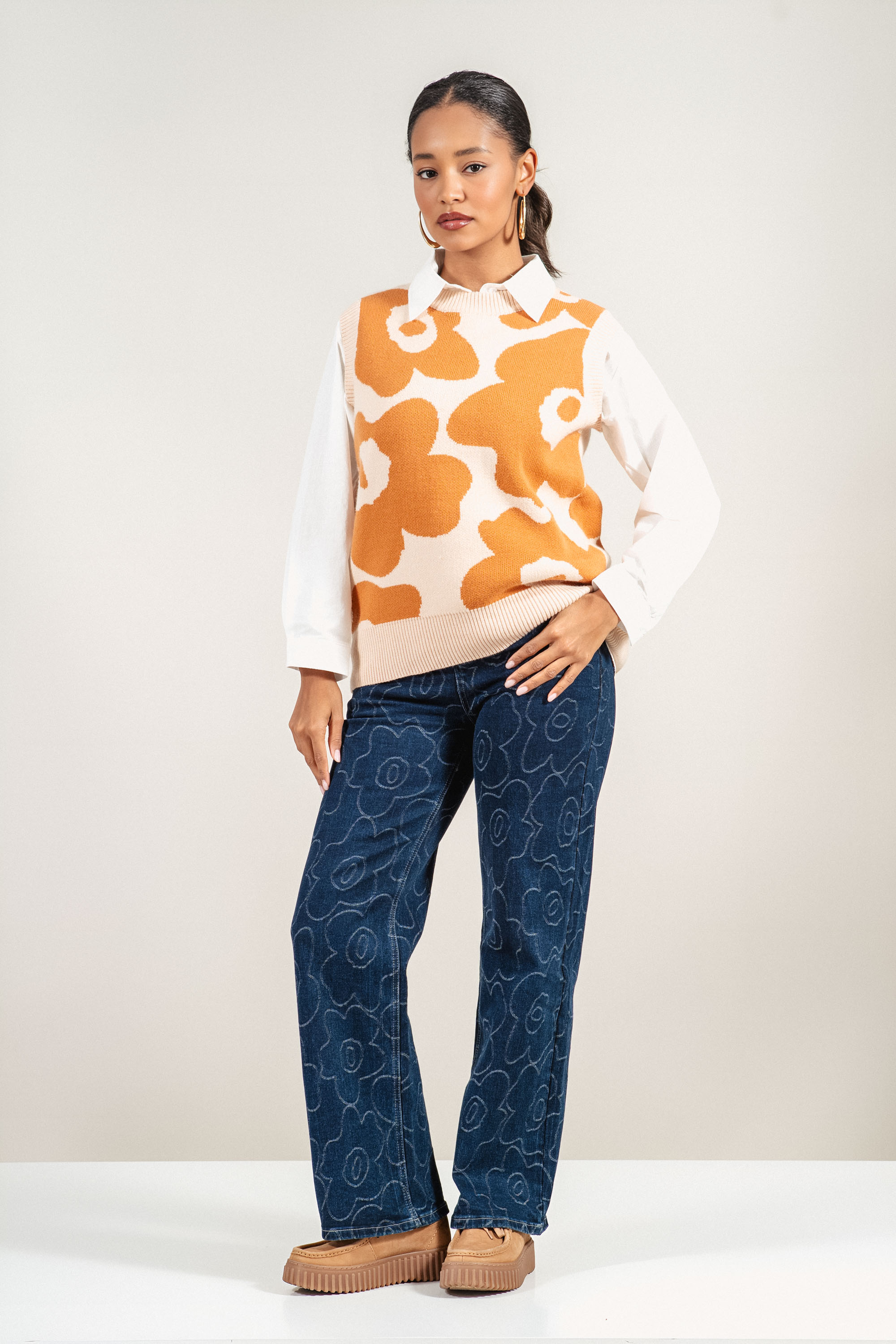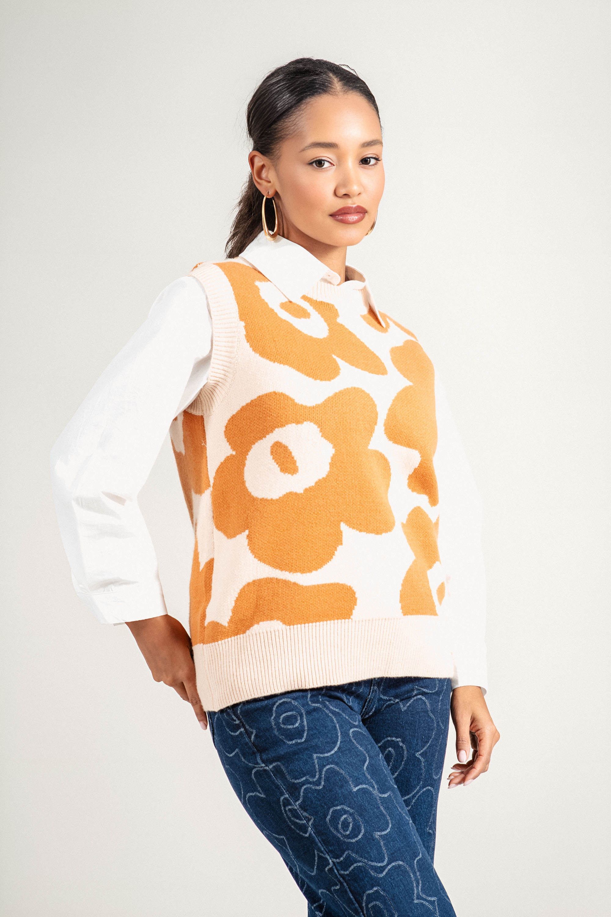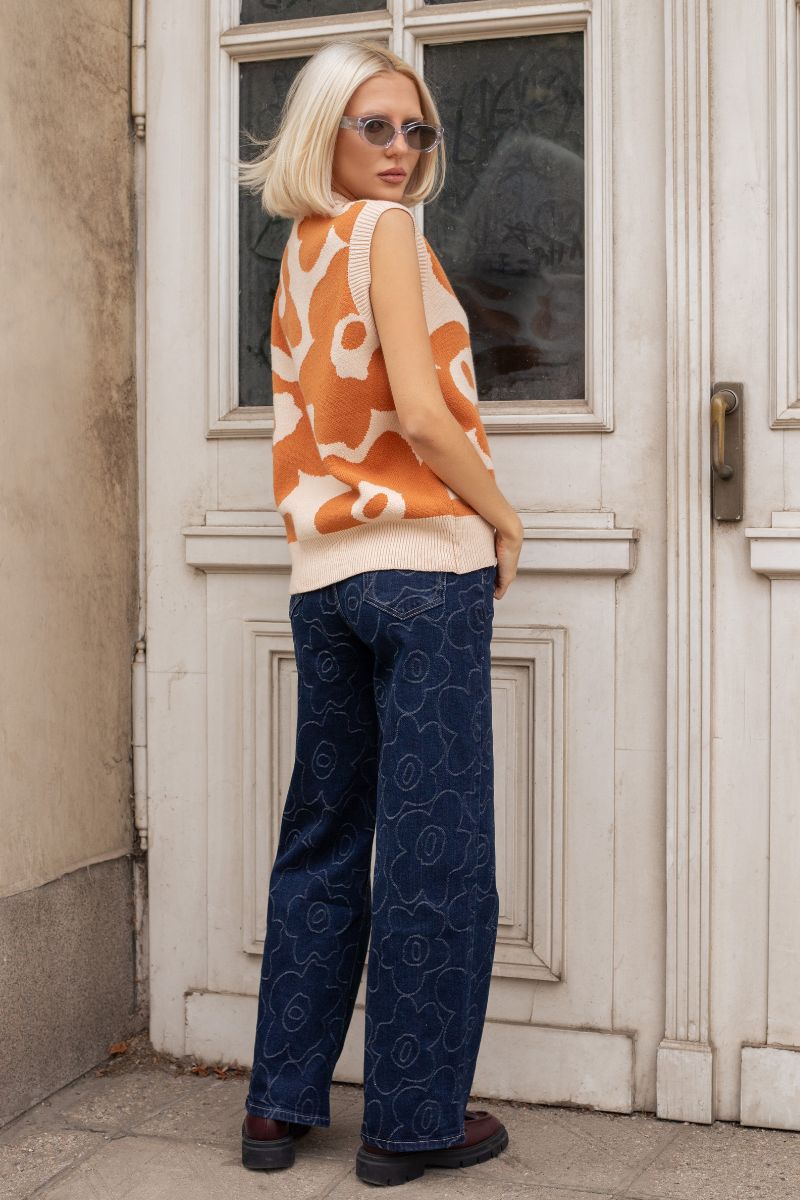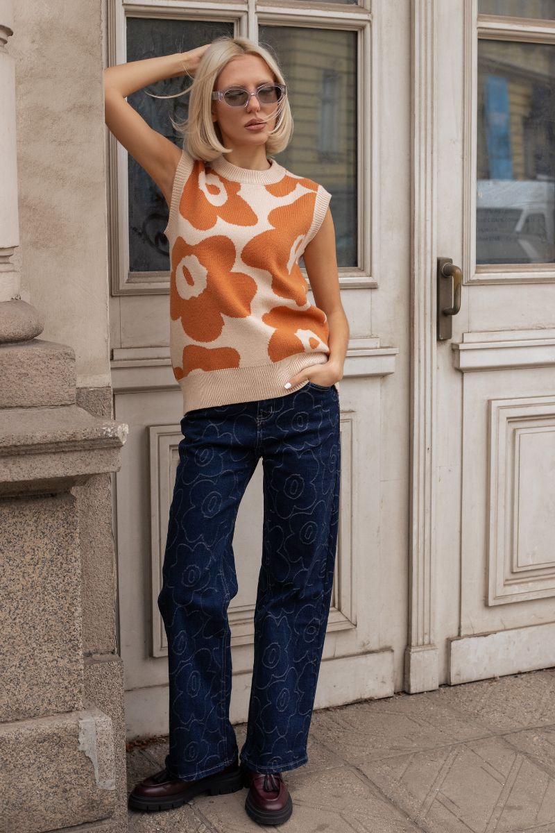 Този елек от серията на "Dragonfly" съчетава модерен силует с артистичен характер. Изработен от фино плетиво с високо съдържание на вискоза, той осигурява мекота и деликатна еластичност. Бежовата основа е оживена с оранжев флорален принт, който придава индивидуалност на визията. Класическото обло деколте и правата линия го правят подходящ за носене както самостоятелно, така и върху риза или блуза. Подходящ за есенно-зимния сезон и ежедневни градски визии.