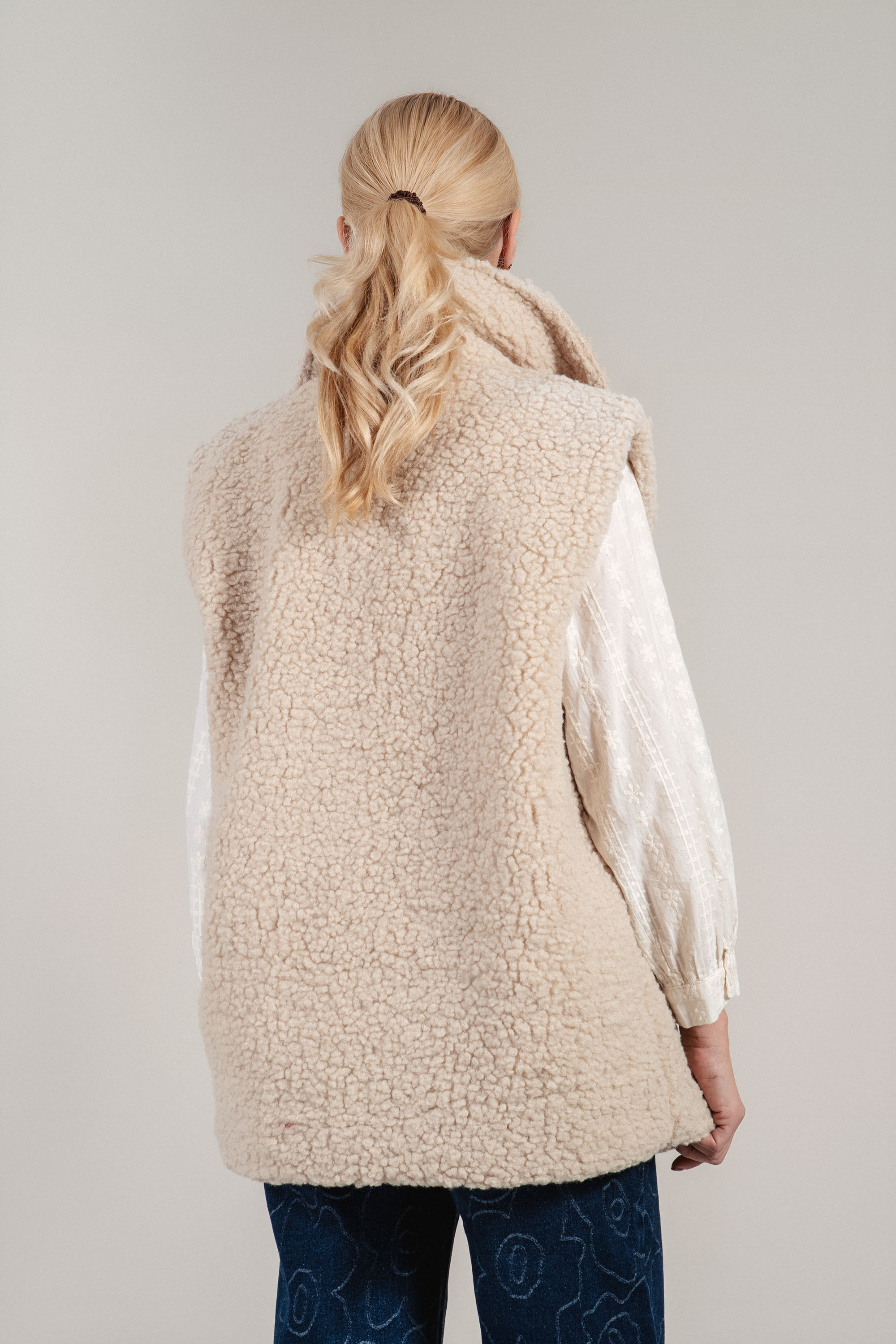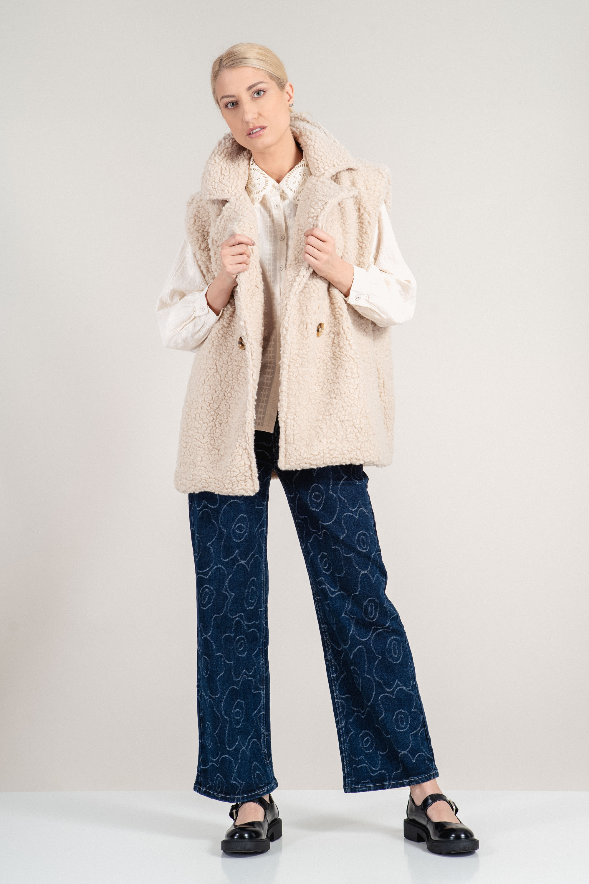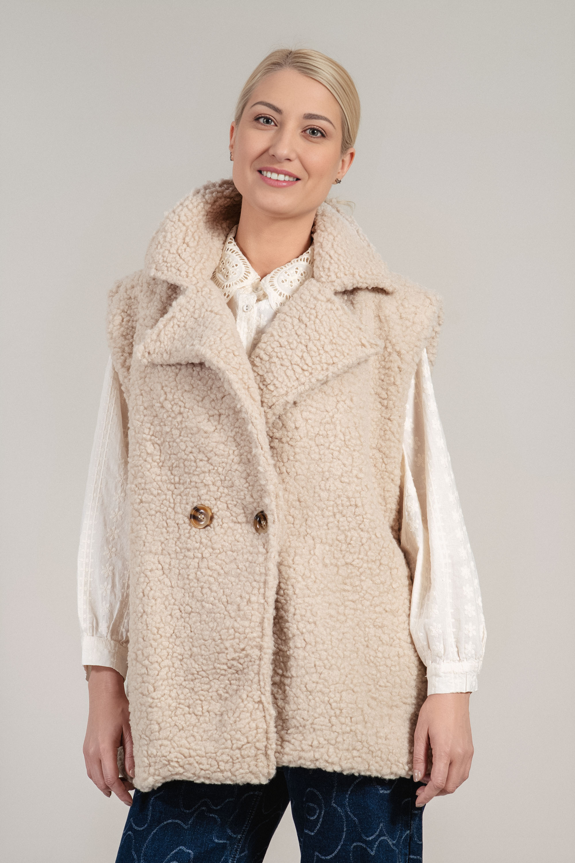 Този макси елек в светлобежово е отличен избор за преходния сезон. Изработен от мека материя тип еко кожа с изразена текстура, моделът съчетава комфорт и визия с характер. Kопчета и изчистеният силует го правят лесен за съчетаване както с дънки, така и с по-елегантни визии.