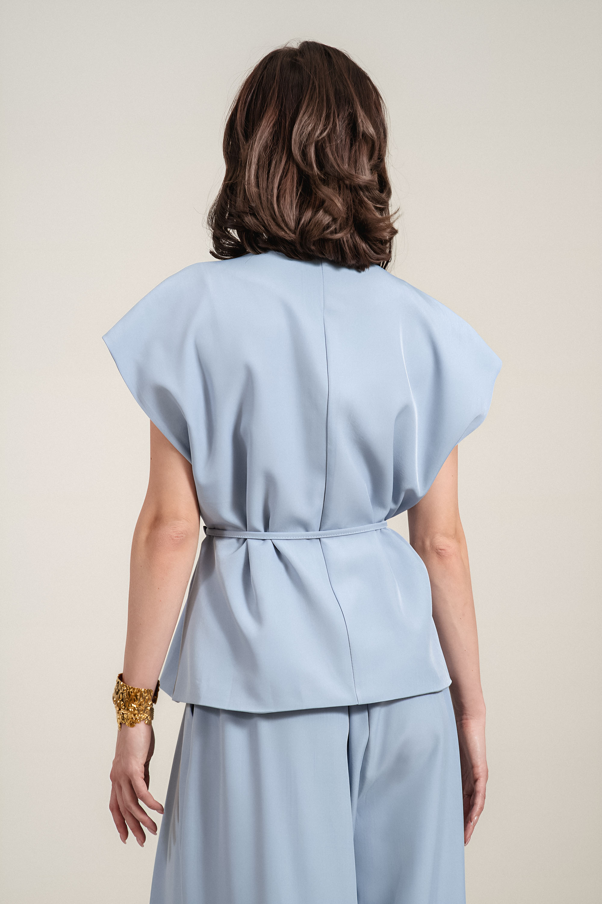 Елегантен елек с модерен „прегърни ме“ дизайн, който подчертава талията и оформя женствен силует. Фината и гладка материя осигурява лекота и комфорт, като същевременно запазва изчистена визия. Острото деколте издължава фигурата, а връзката в талията позволява индивидуално регулиране. Подходящ избор както за офис визии, така и за по-елегантни ежедневни комбинации.