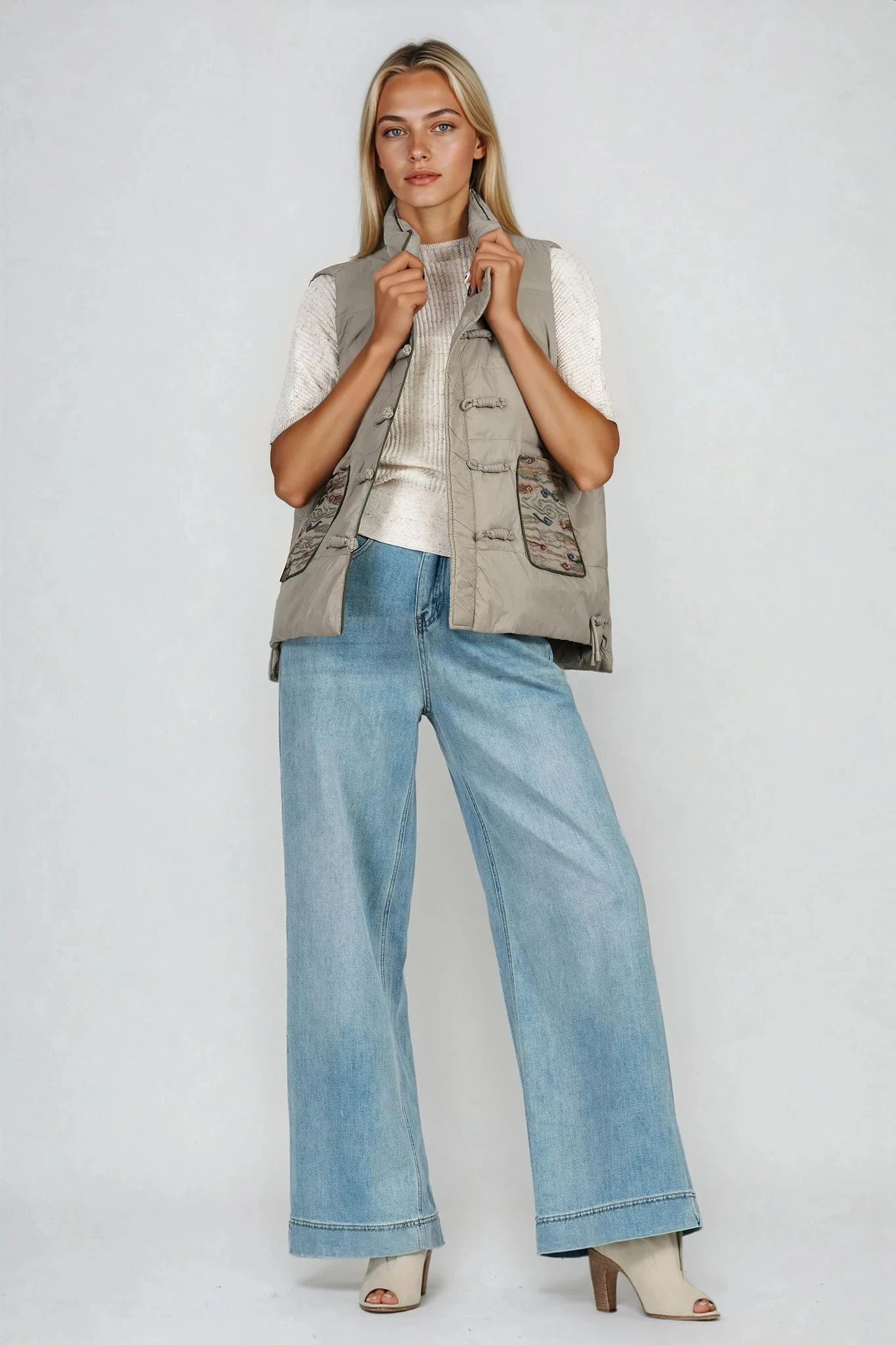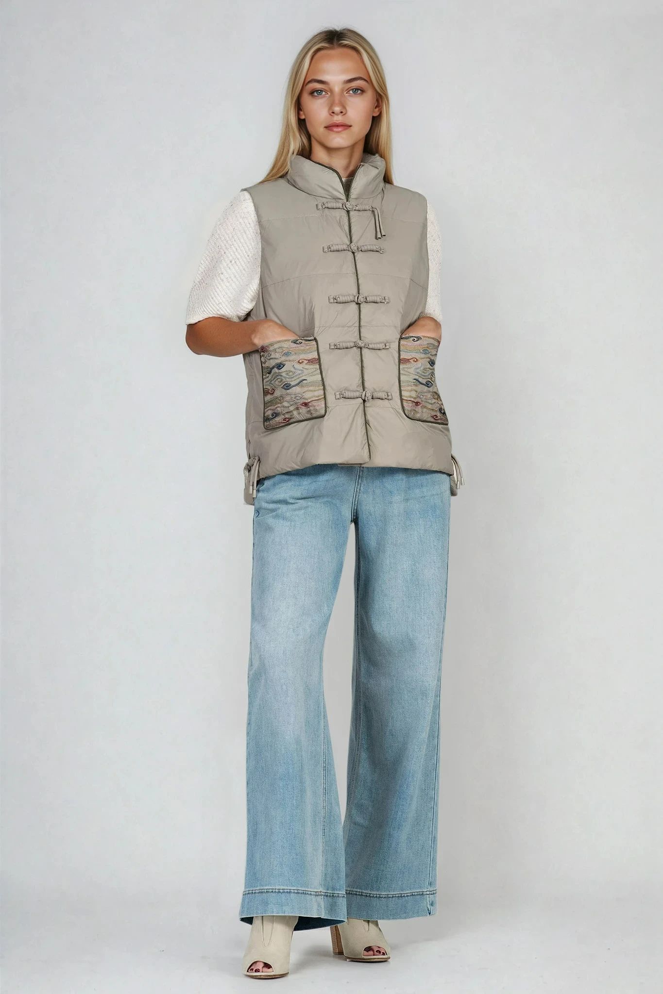 Дамски елек в зелено с бродерия по джобовете