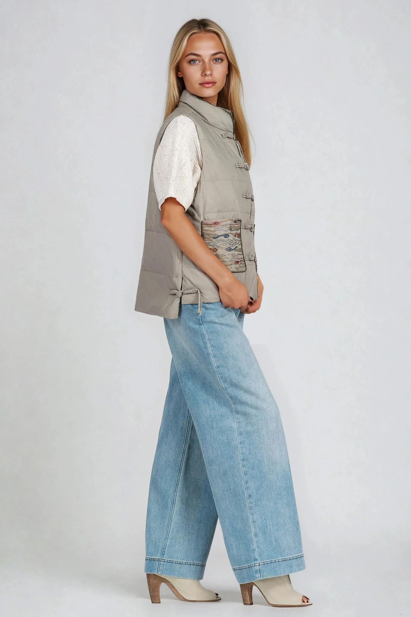 Този капитониран елек се отличава с изчистена линия, модерни бродирани джобове и тъмни кантове за акцент. Материята е промазана и подходяща за ветровито време, а дизайнът позволява лесно комбиниране с ежедневен или уикенд стил.