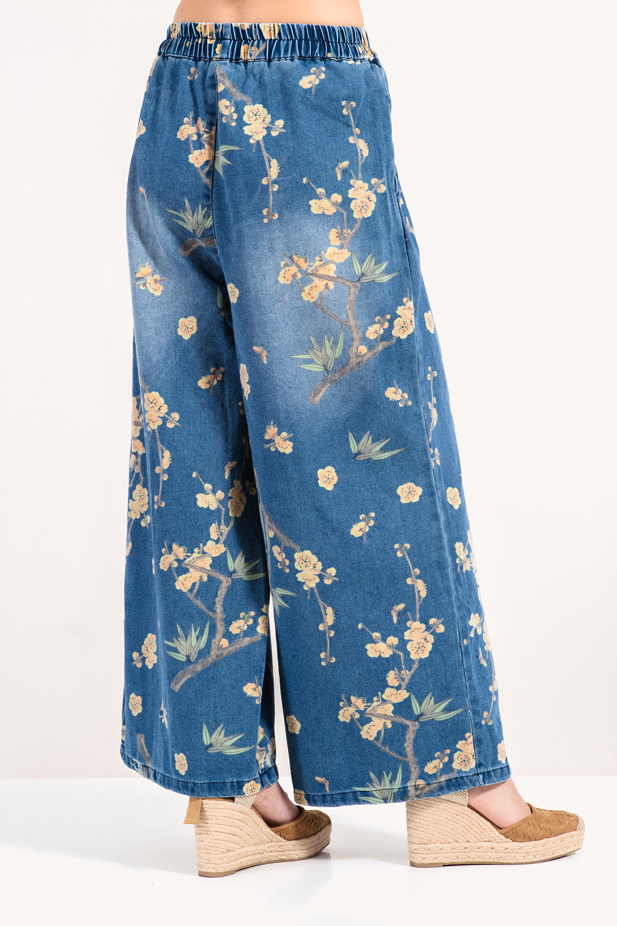 Дамски модерини дънки с флорален десен и еластична талия с връзки