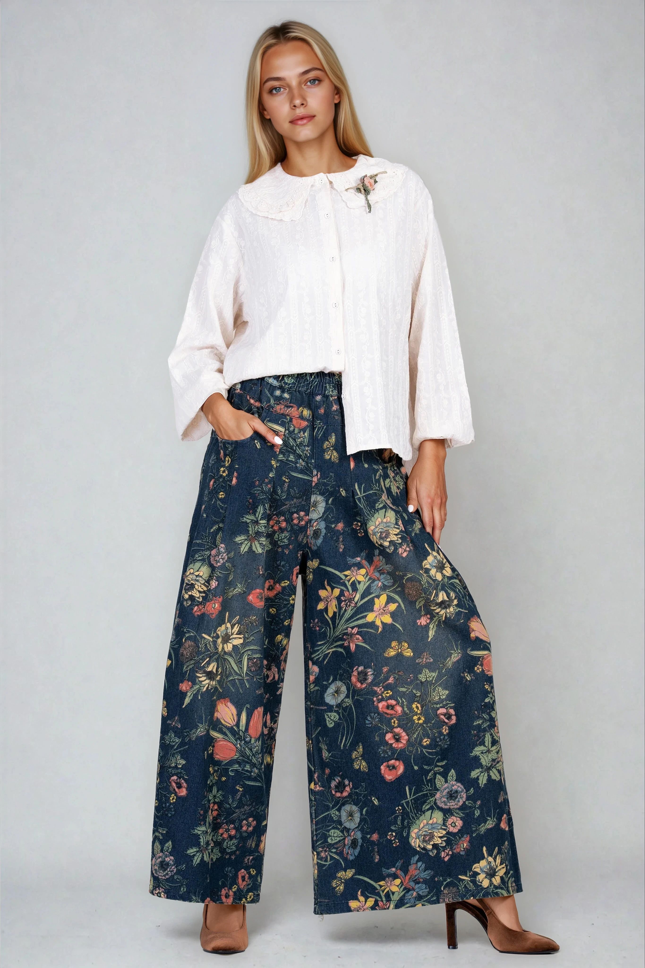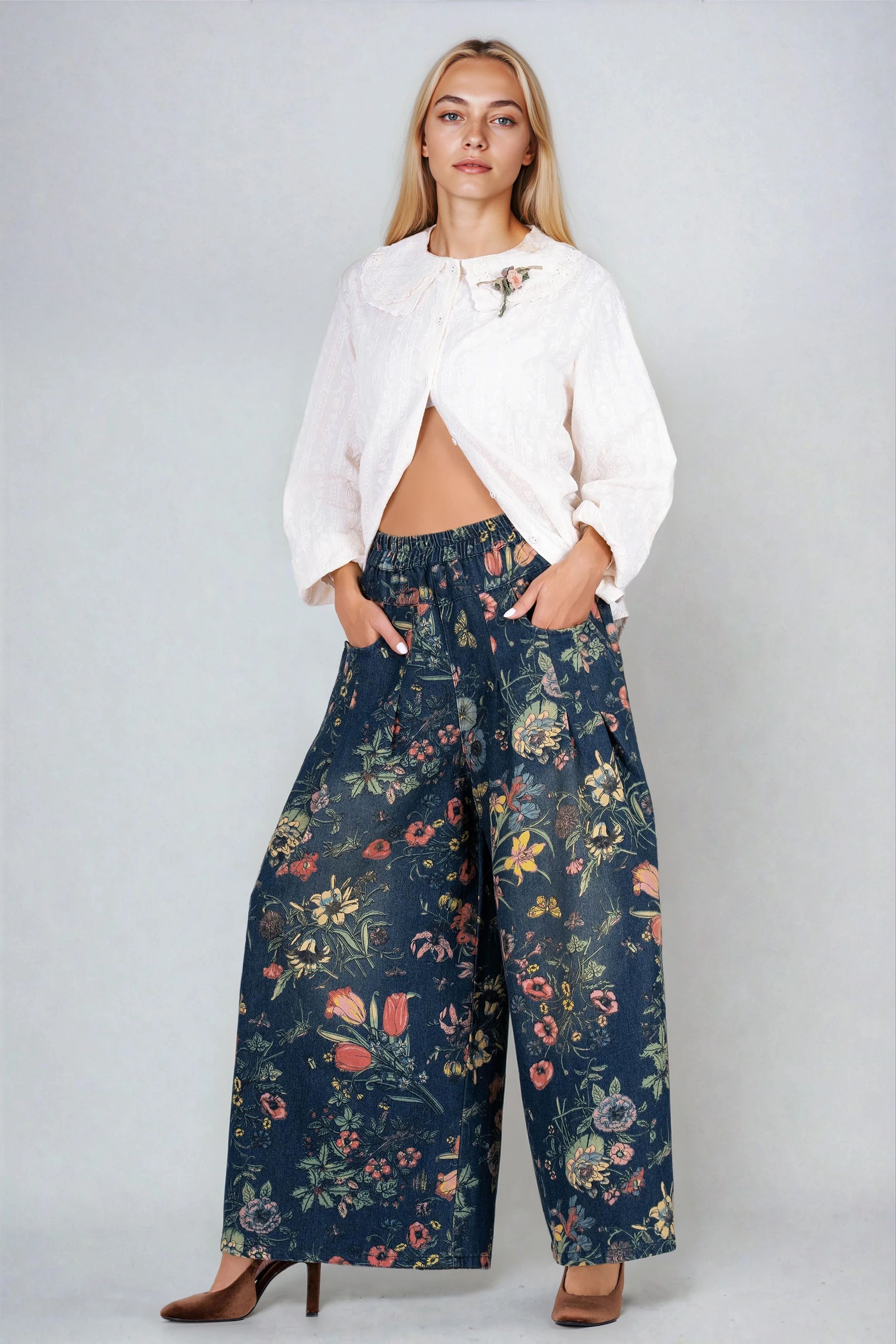 Тези дълги дънки съчетават артистичен флорален десен с удобна кройка и еластична талия. Плътната денимова материя и свободният силует ги правят подходящи за целодневно носене през преходните сезони. Декоративните джобове отпред и меките нюанси в жълто, зелено и оранжево подчертават женствеността и индивидуалния стил.