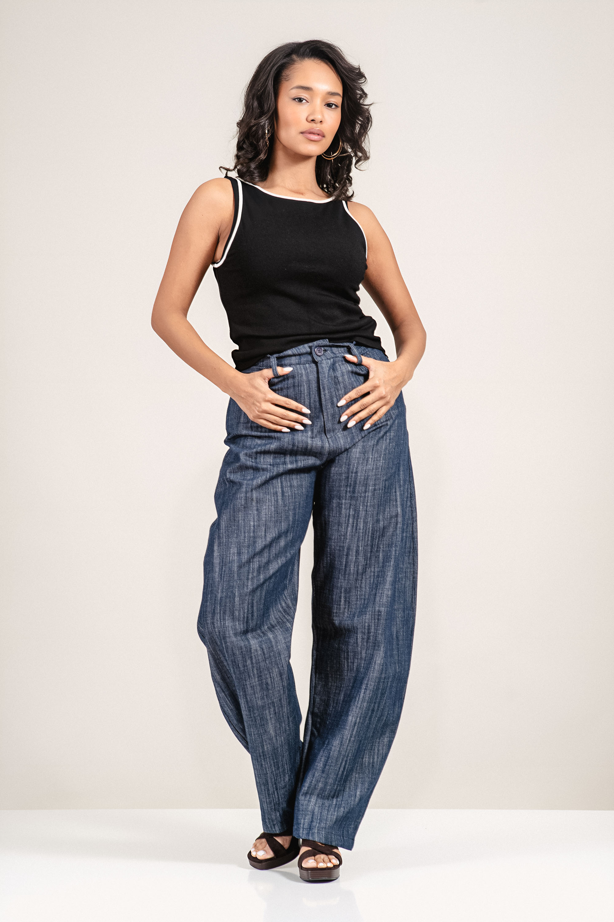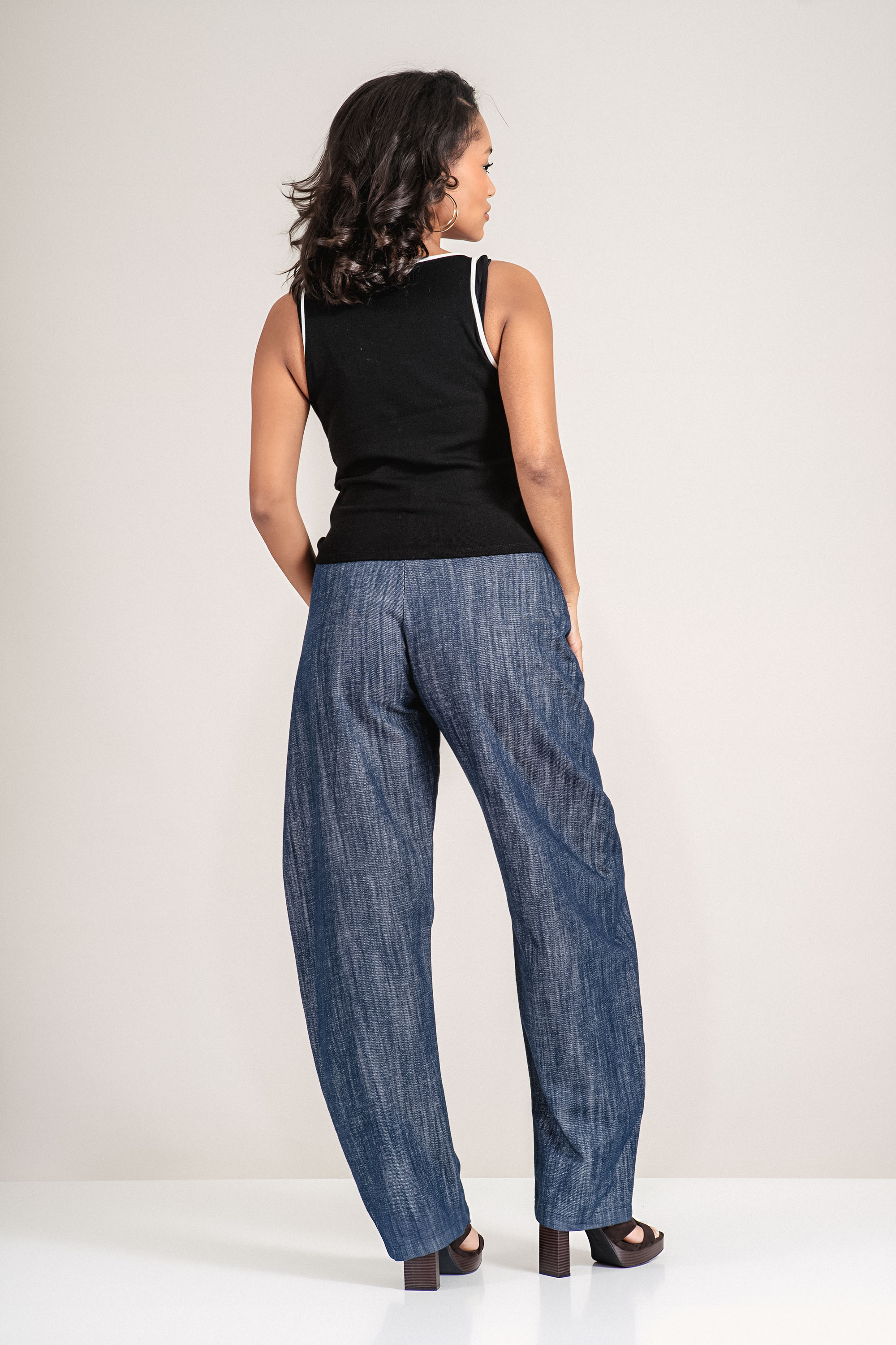 Съвременна интерпретация на деним визията с акцент върху комфорт и стил. Натуралната памучна материя придава мекота, като запазва структурата на силуета без еластичност. Свободната линия и дългият широк крачол оформят балансиран и динамичен профил, характерен за колекция "Dragonfly". Моделът позволява комбиниране както с елегантни обувки, така и със сникърси за модерна градска визия.
