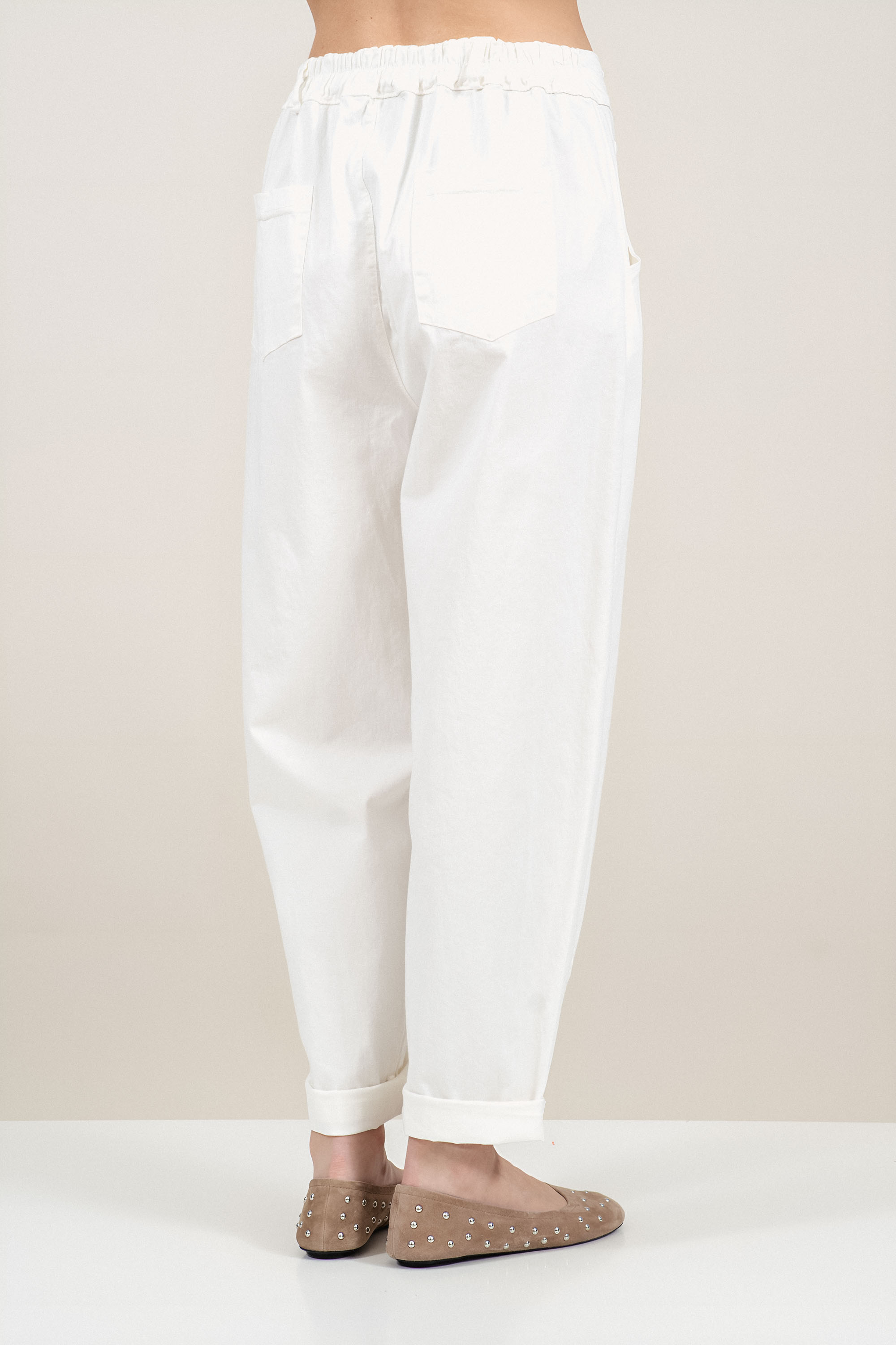 Дамски памучен панталон в бяло със стеснен крачол и ластик на талията