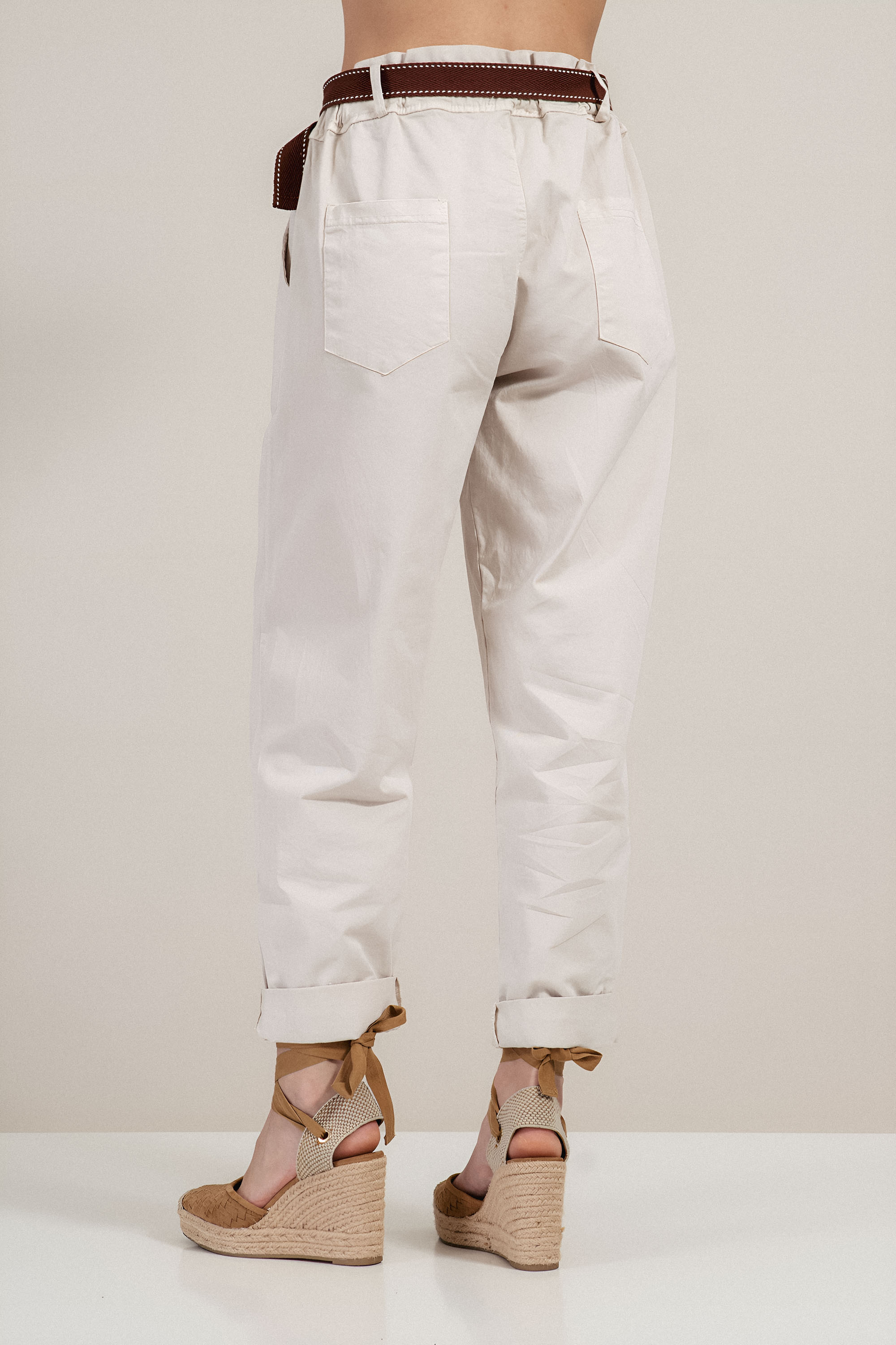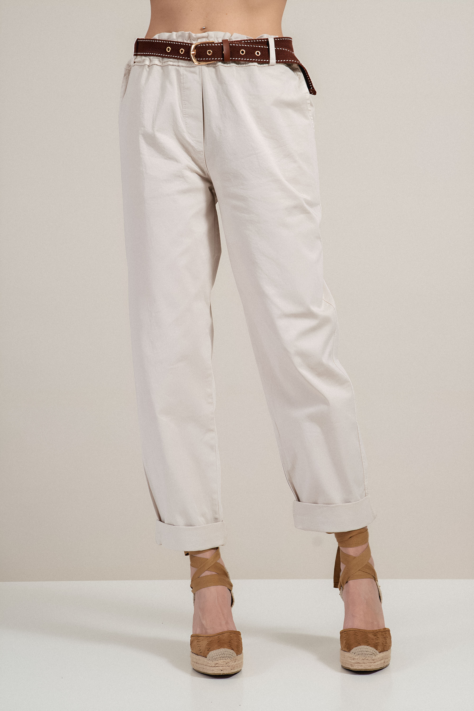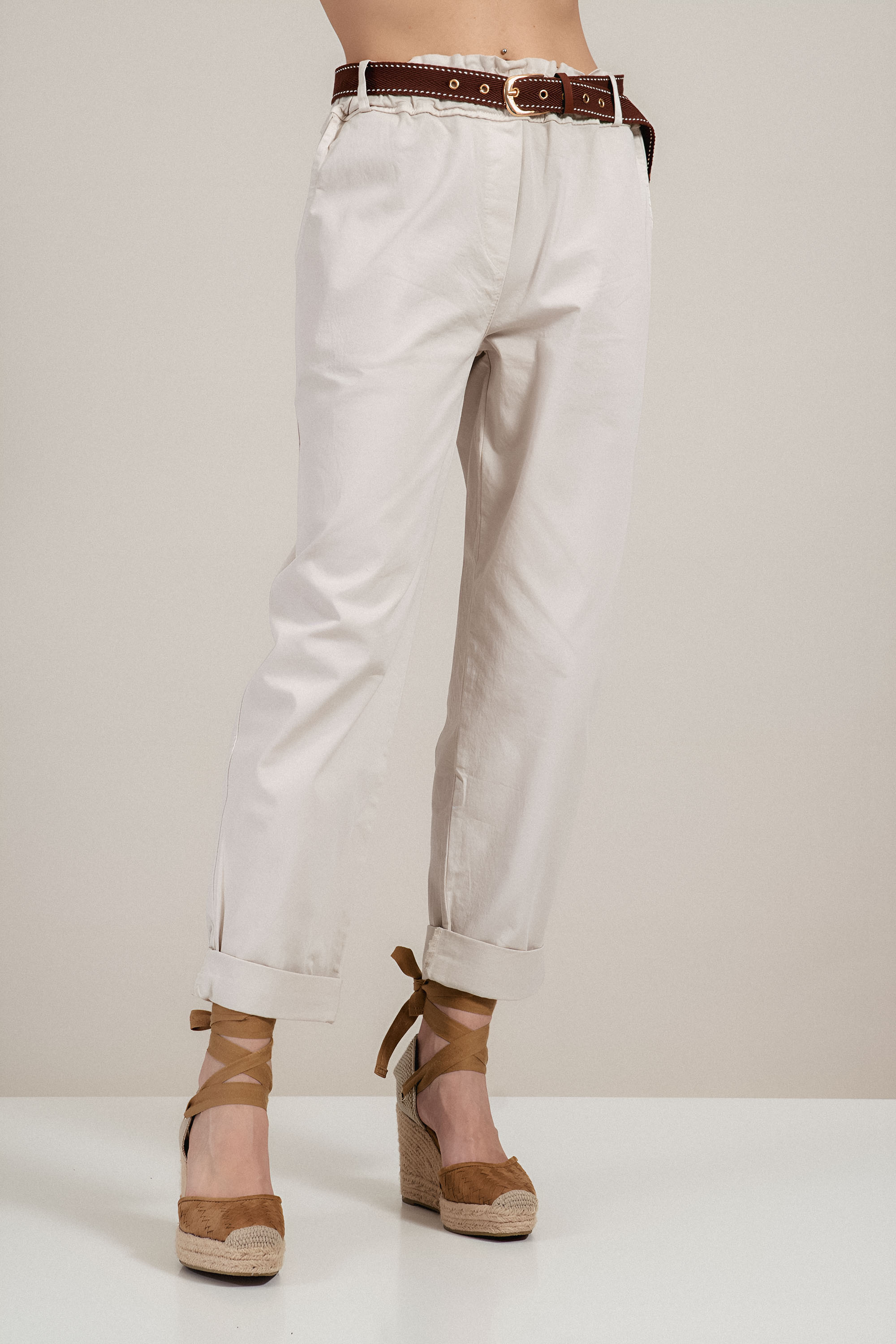 Дамски памучен панталон в светлобежово с ластична талия, колан и свободна кройка