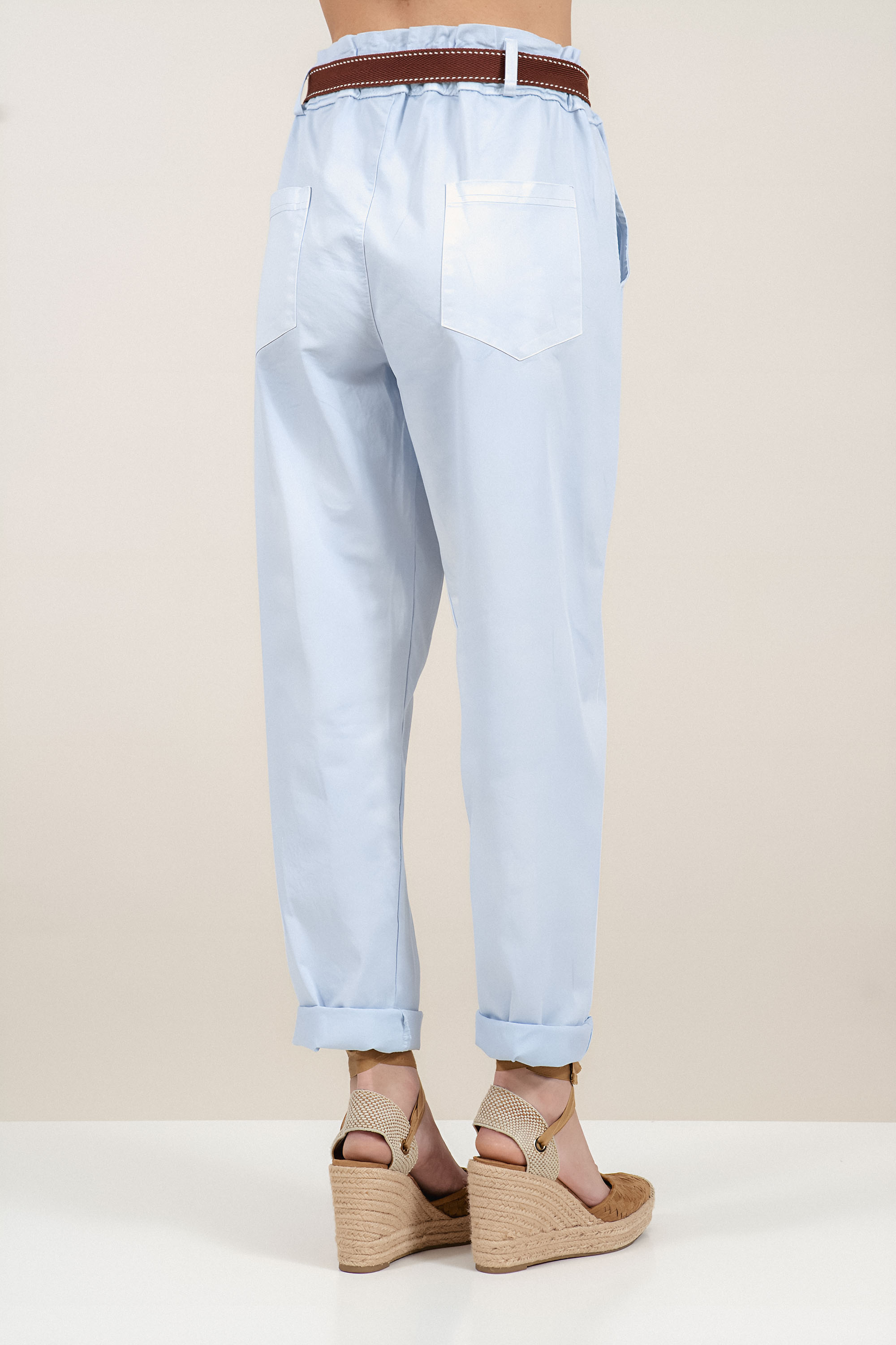 Елегантен и удобен модел с подчертана свобода на движение. Изработен от памучна материя, панталонът предлага естествен комфорт и лекота при носене. Свободната кройка и ластичната талия оформят балансиран силует, подходящ за динамично ежедневие. Светлосиният тон създава свежа визия, а текстилният колан добавя фин стилов акцент. Подходящ избор за комбиниране с обувки на нисък ток или спортно-елегантни модели.