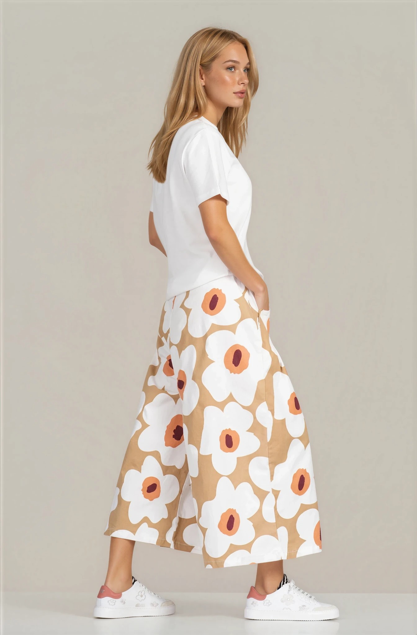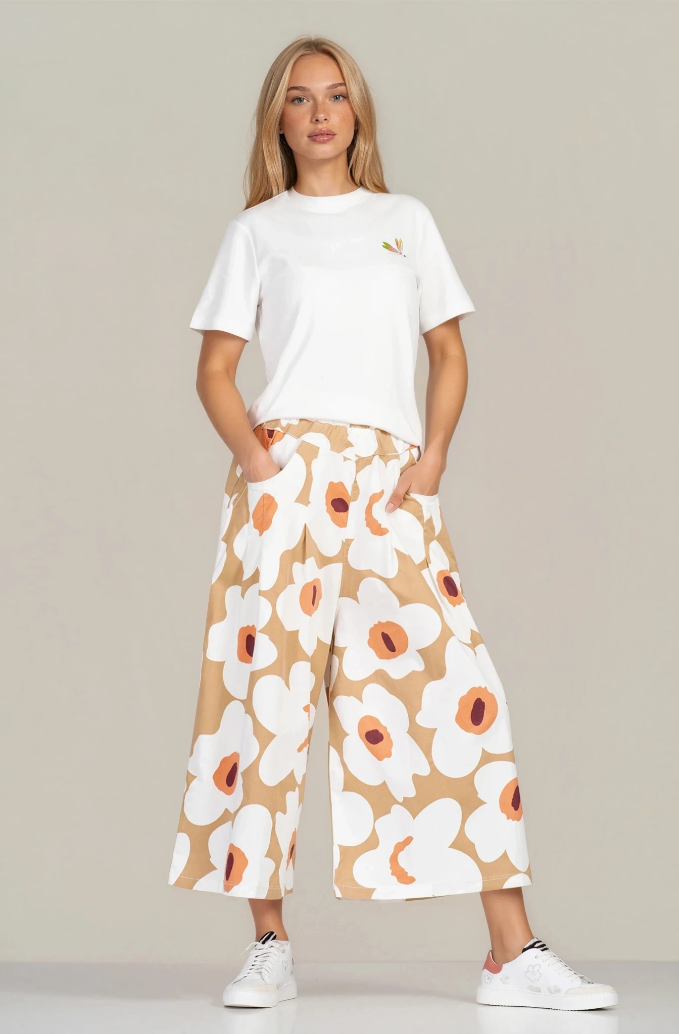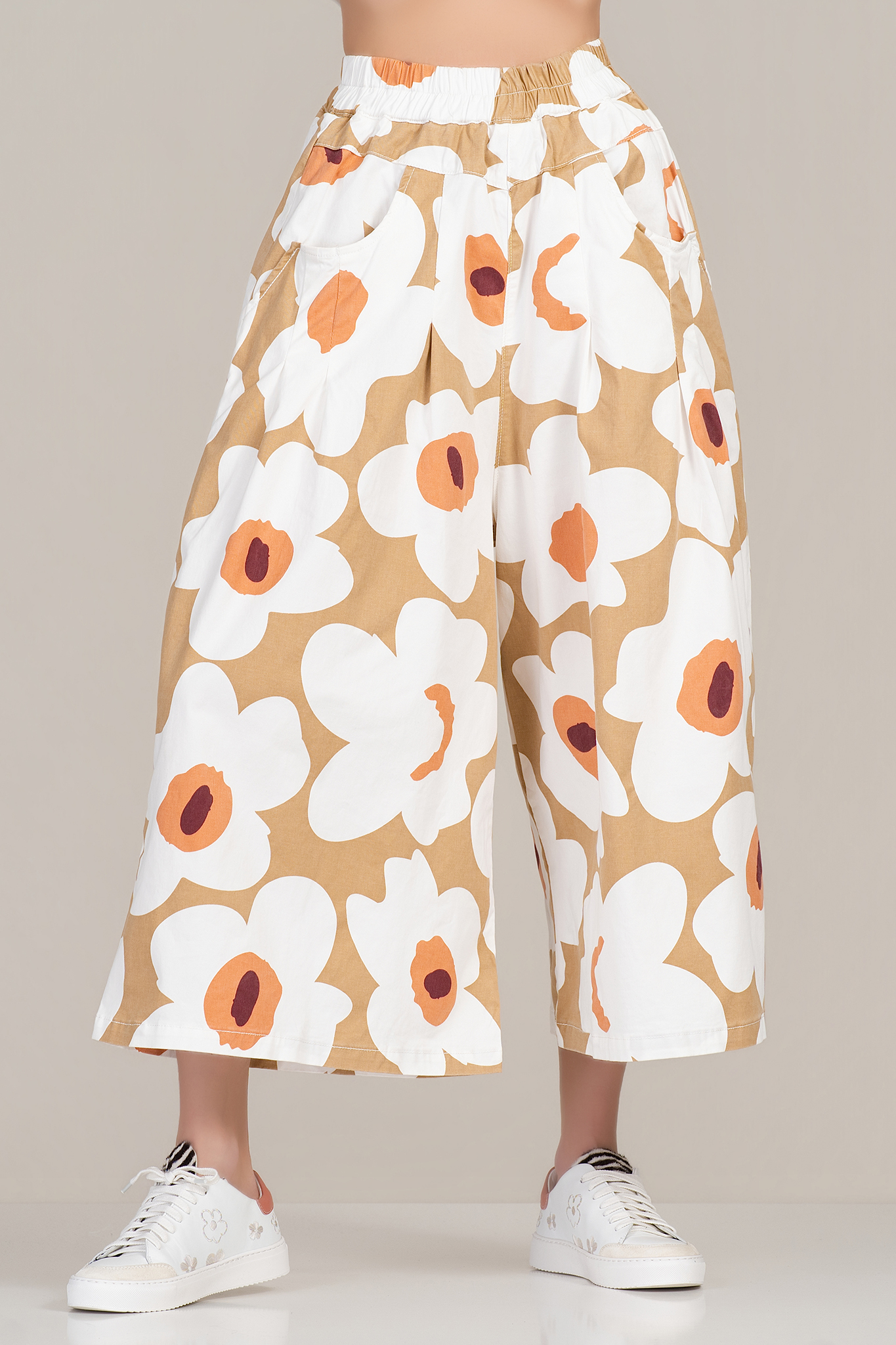 Дамски панталон "Dragonfly" от памук в бежово с бял флорален принт и широка кройка