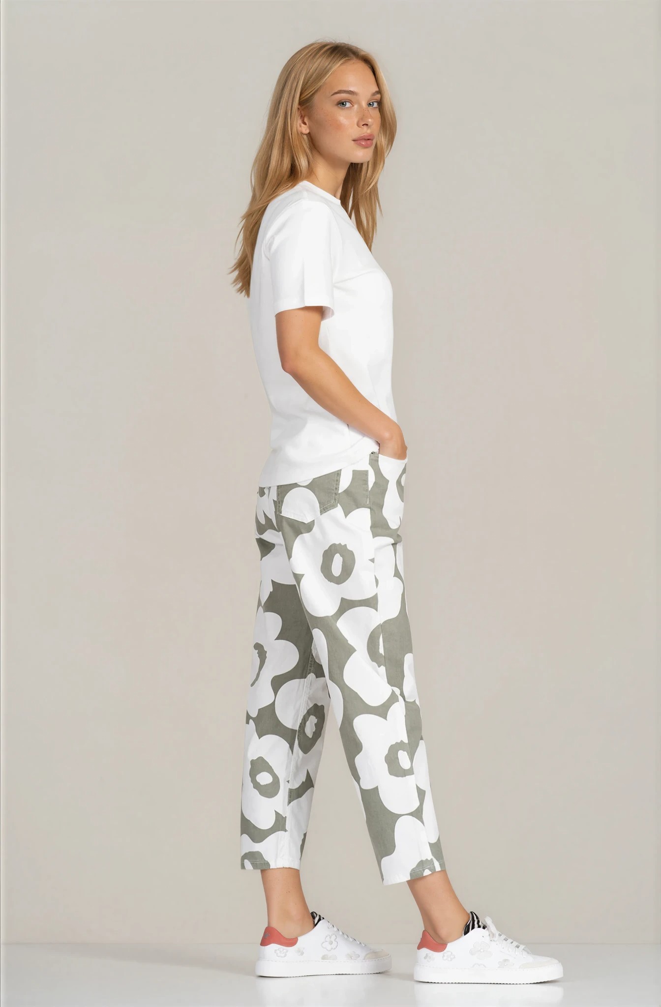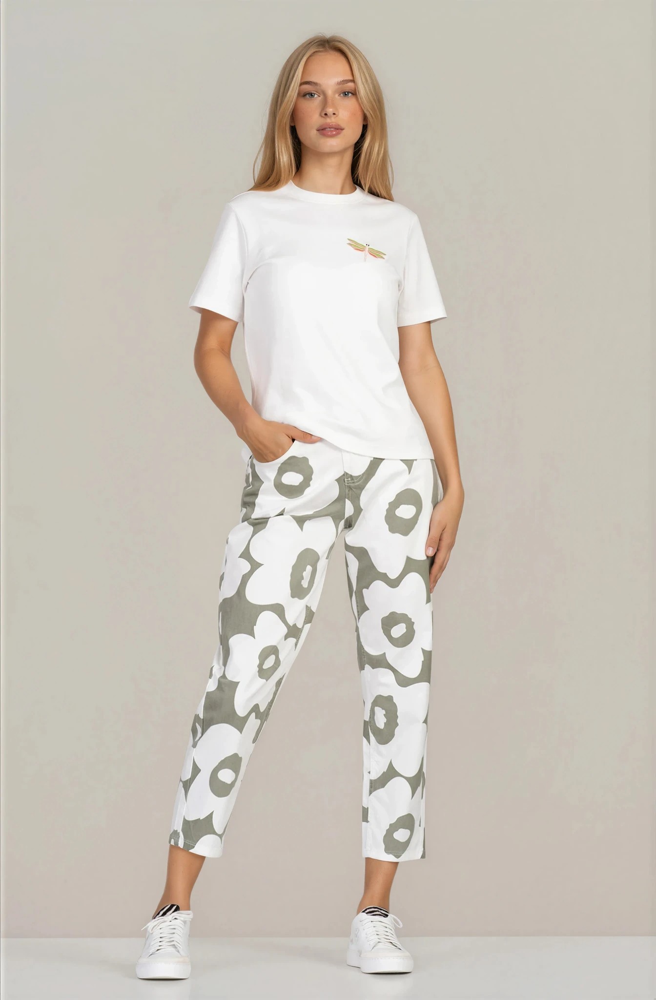 Модерен прочит на ежедневния комфорт – този панталон "Dragonfly" се отличава с артистичен флорален принт и изчистена права линия. Памучната материя с еластичност осигурява мекота и удобство при носене, подходяща за активното ежедневие. Ластикът в кръста гарантира комфортно прилягане, а правият крачол придават съвременен градски стил. Лесно се комбинира както със спортни, така и с по-елегантни визии.