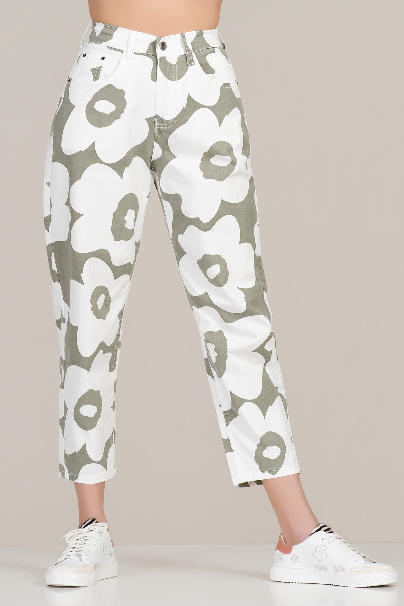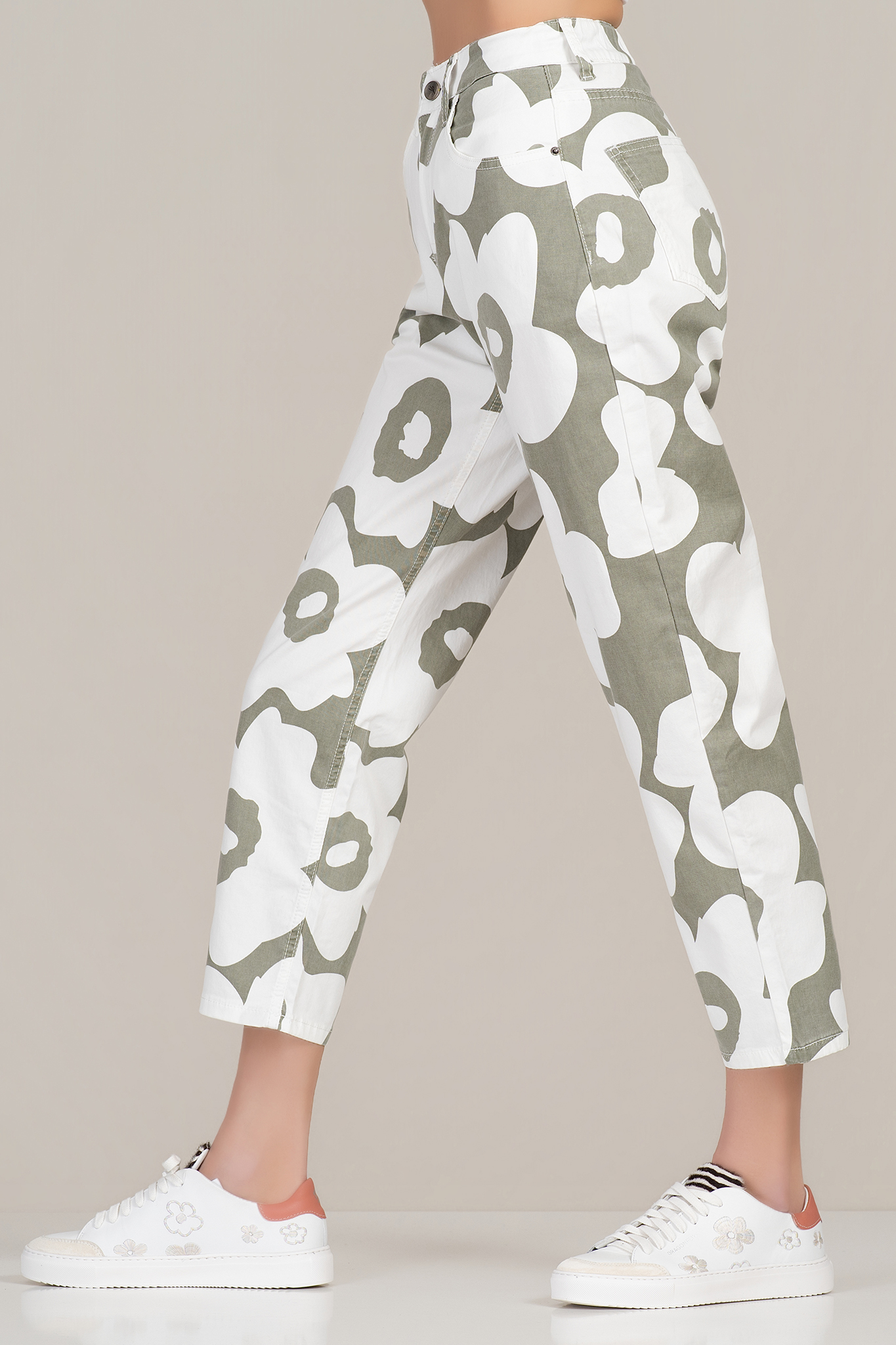 Дамски панталон "Dragonfly" от памук в зелено с принт бели цветя и ластична талия