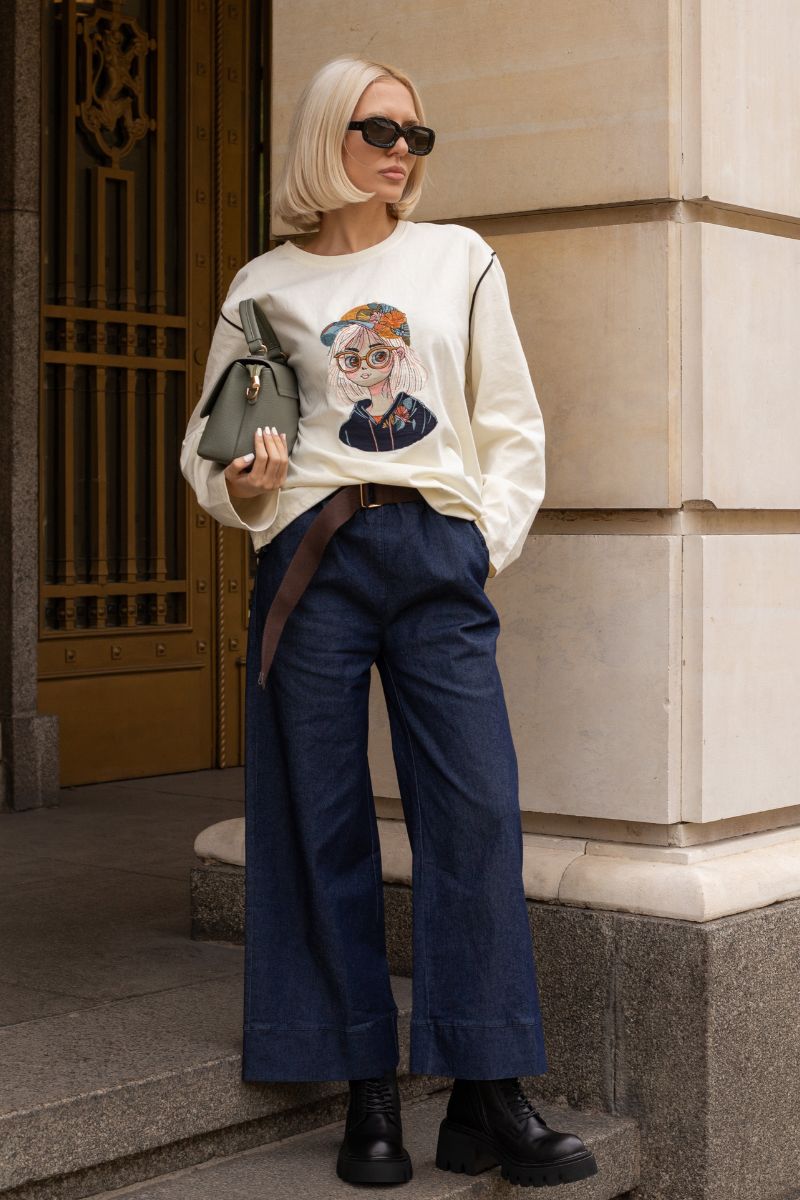 Дамски панталон от памук в тъмносиньо с колан, ластик в талията и широк крачол