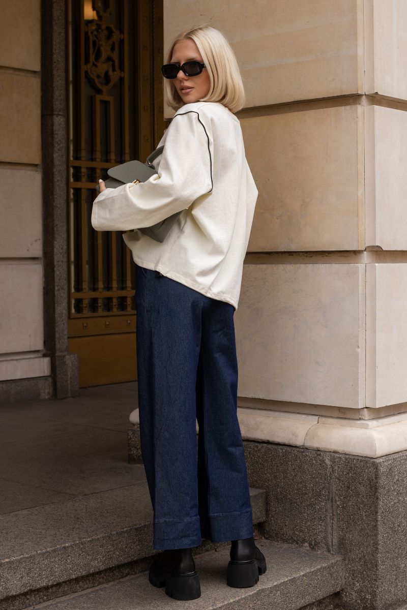 Този тъмносин панталон впечатлява с изчистена визия и комфортна кройка. Моделът е с висока талия, еластичен колан и два практични джоба. Широките крачоли осигуряват свобода на движение и модерен силует. Подходящ за ежедневието или за по-елегантни визии със сако или риза.