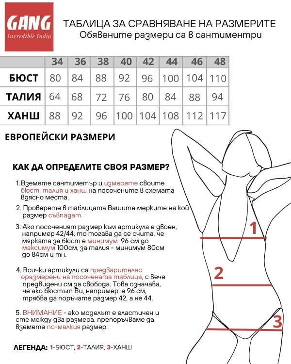 Към всеки артикул в онлайн магазин GANG има приложена таблица с размери. Ако имате нужда от допълнителни указания, наш консултант ще се радва да ви съдейства на телефони 0892257459, 0886122276.