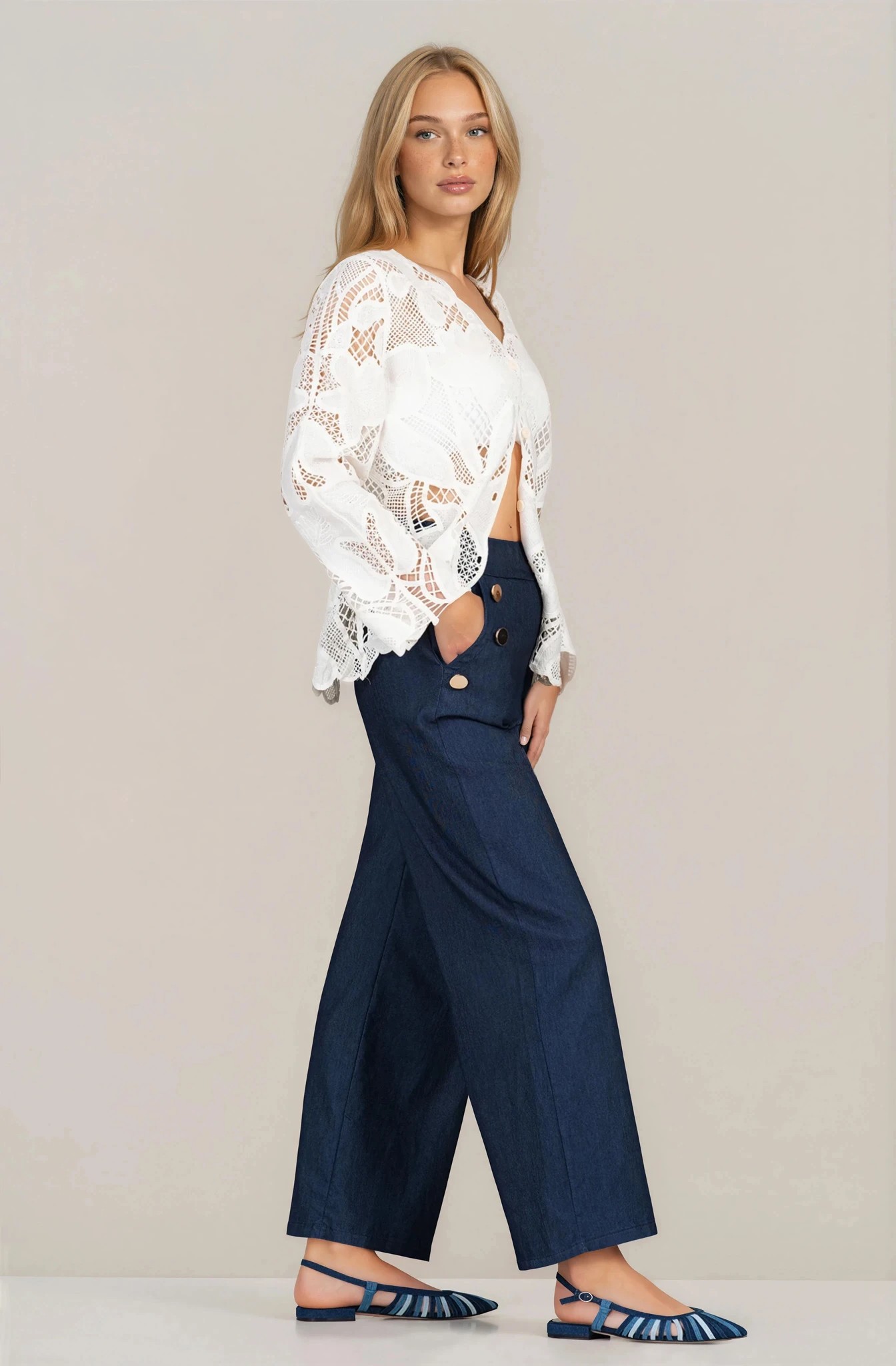 Елегантен панталон от памучен тънък деним в наситен тъмносин нюанс, създаден за стил и комфорт. Материята с високо съдържание на памук е дишаща, приятна на допир и подходяща за ежедневна употреба. Моделът е с еластична талия и широк крачол, който придава модерна и свободна линия на силуета. Декоративните златисти копчета при джобовете добавят стилен акцент и завършват визията с елегантен детайл.