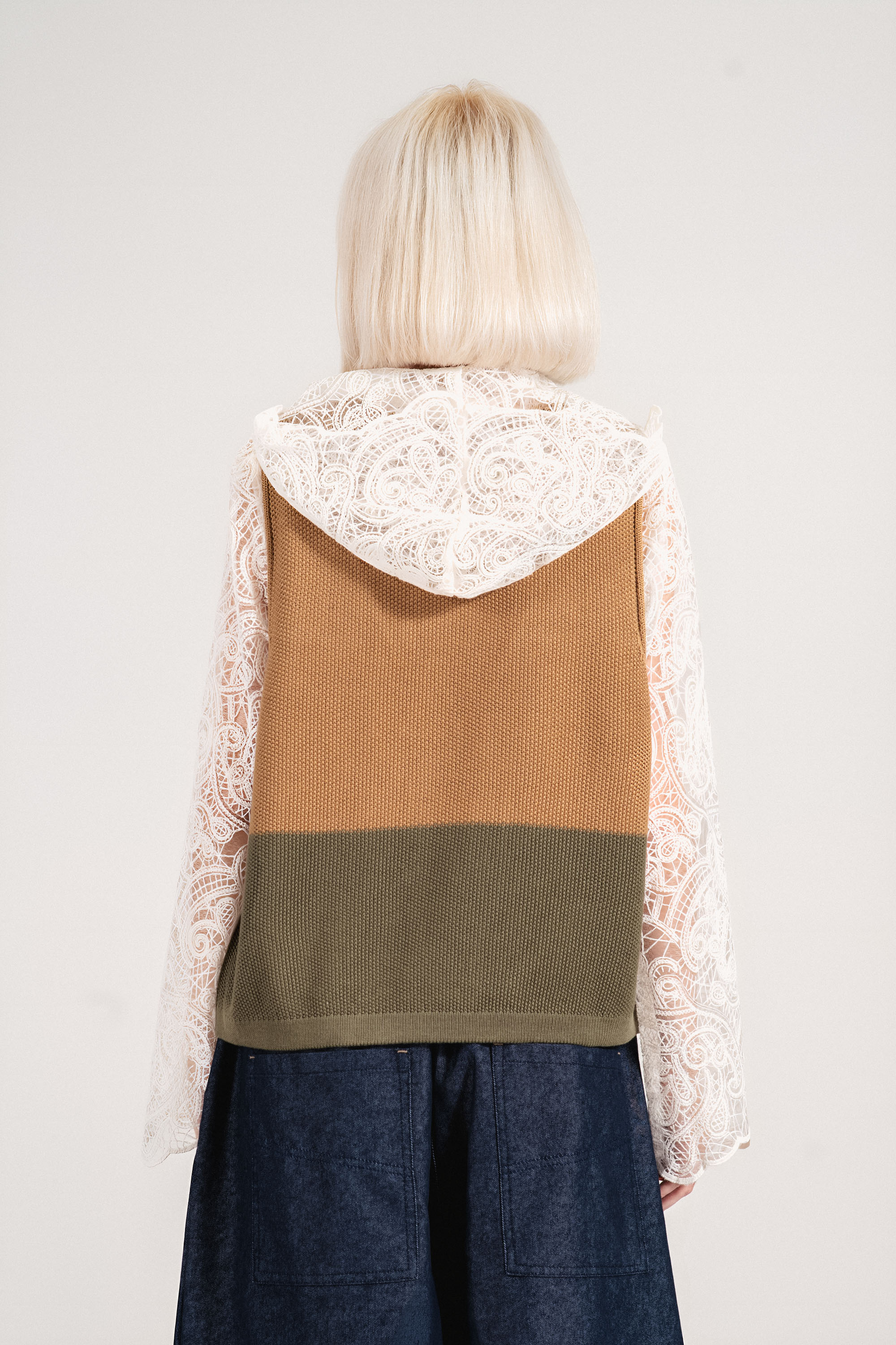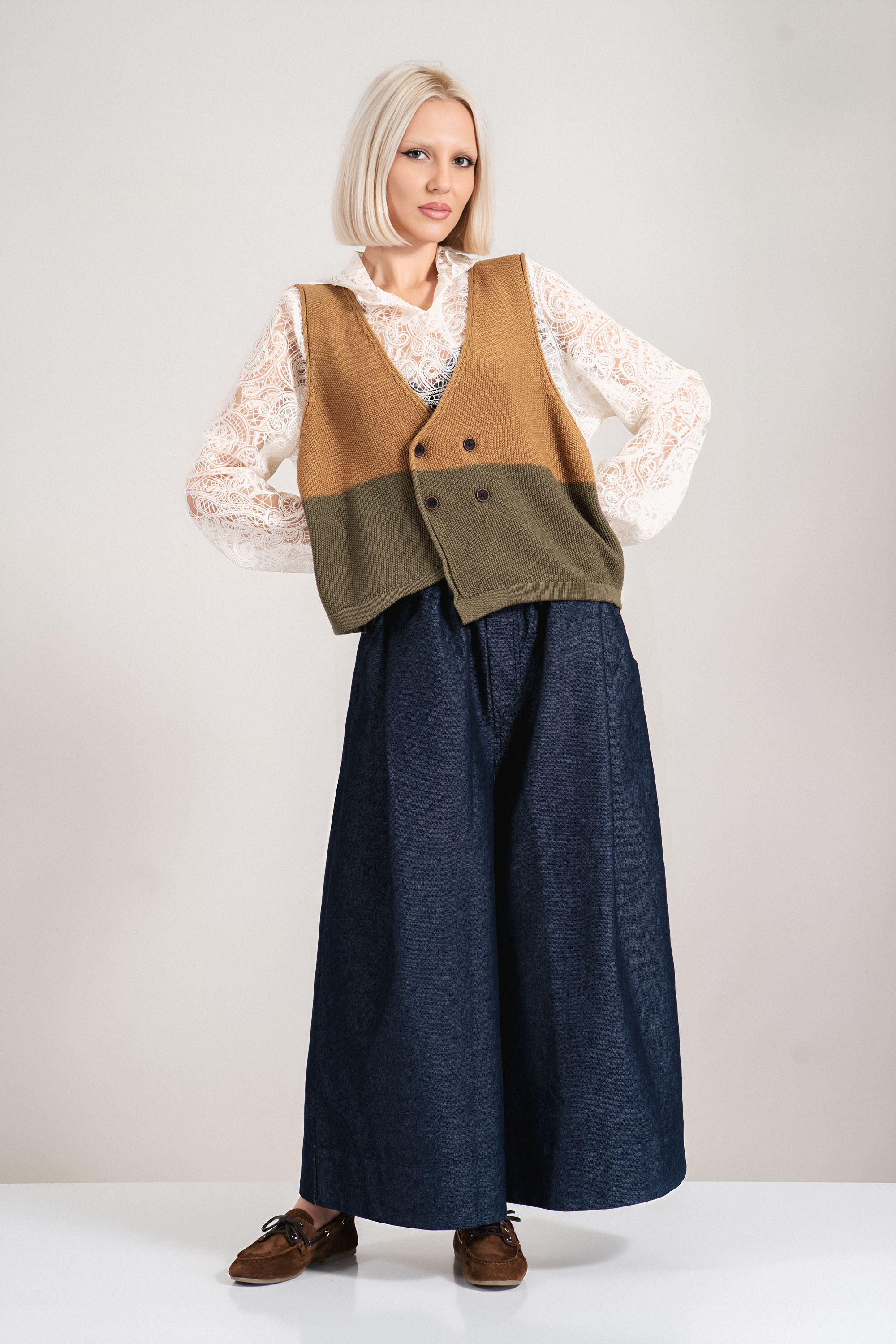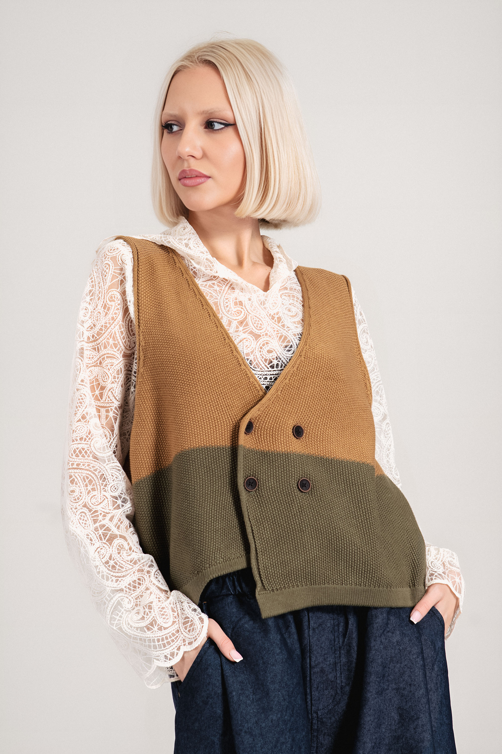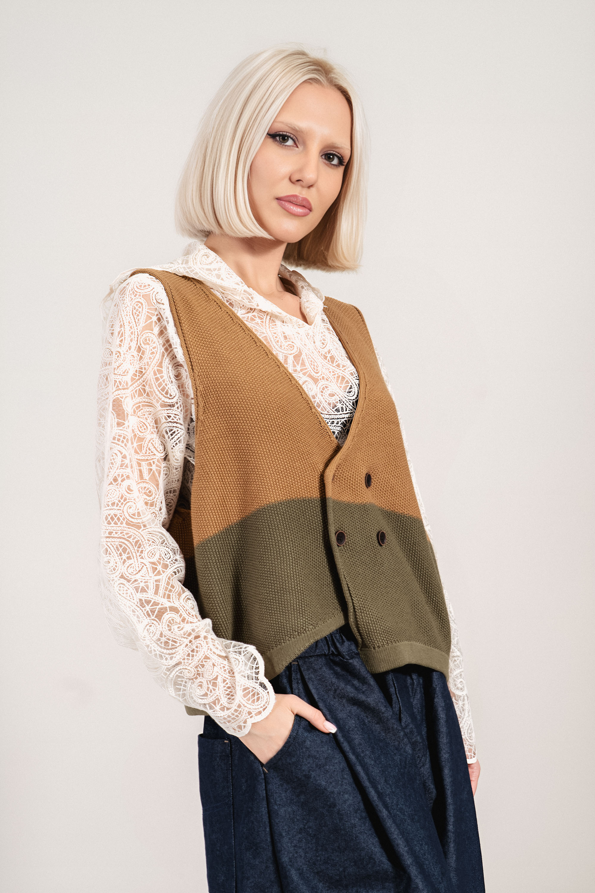 Този стилен елек в зелено и кафяво съчетава съвременно излъчване с класически плетен дизайн. Четири контрастни копчета отпред допълват визията. Подходящ за наслояване през преходните сезони и комбиниране с ризи или блузи.