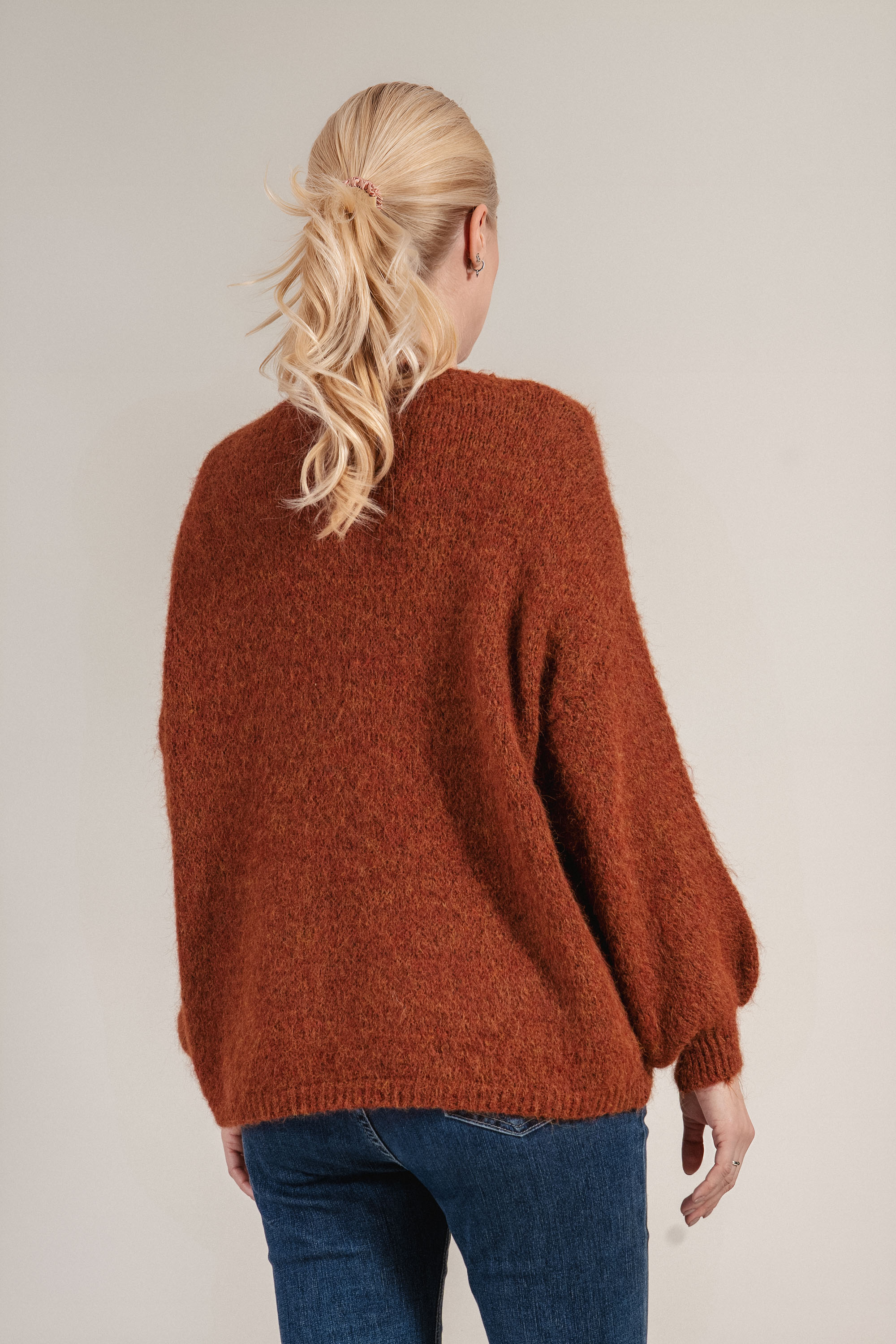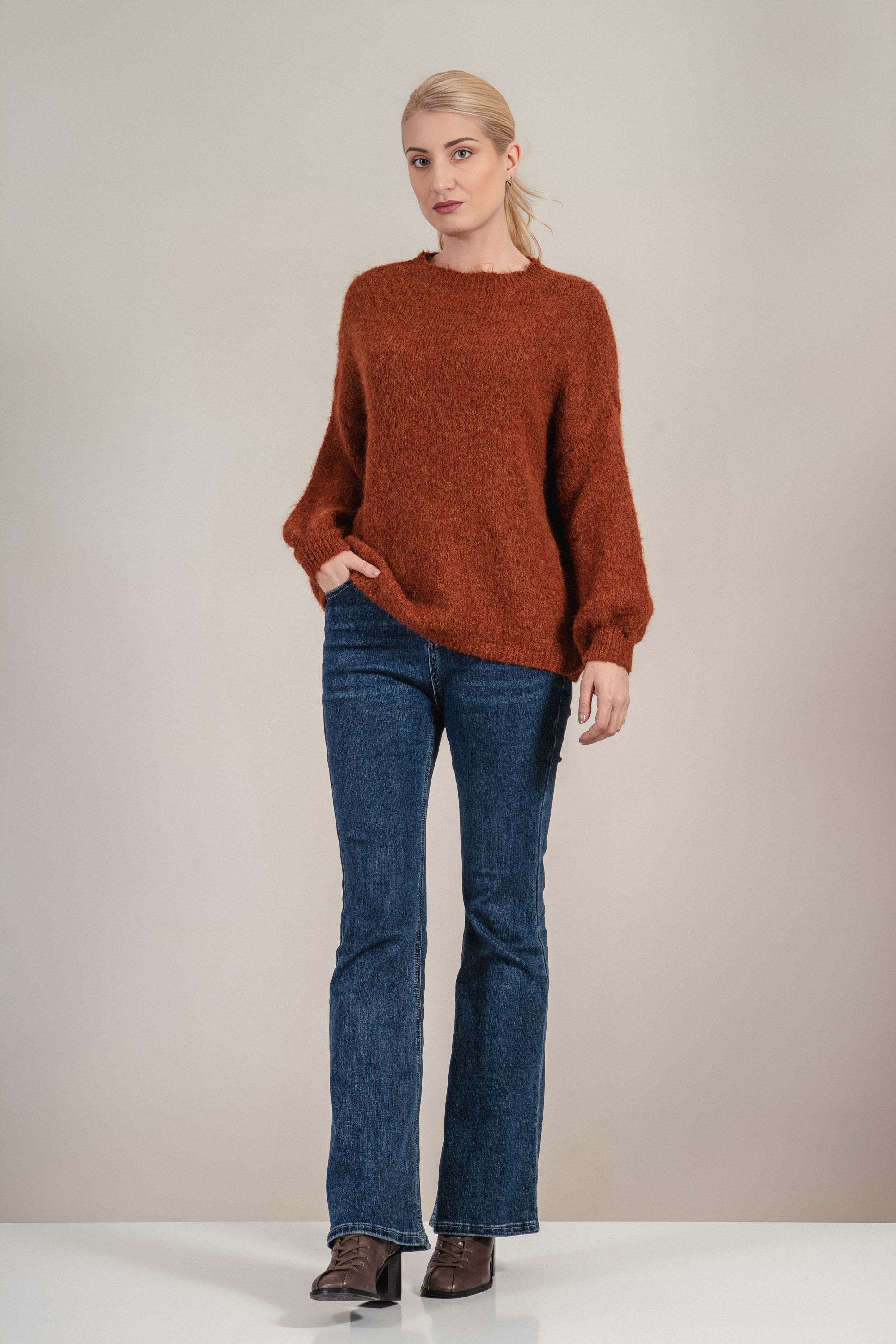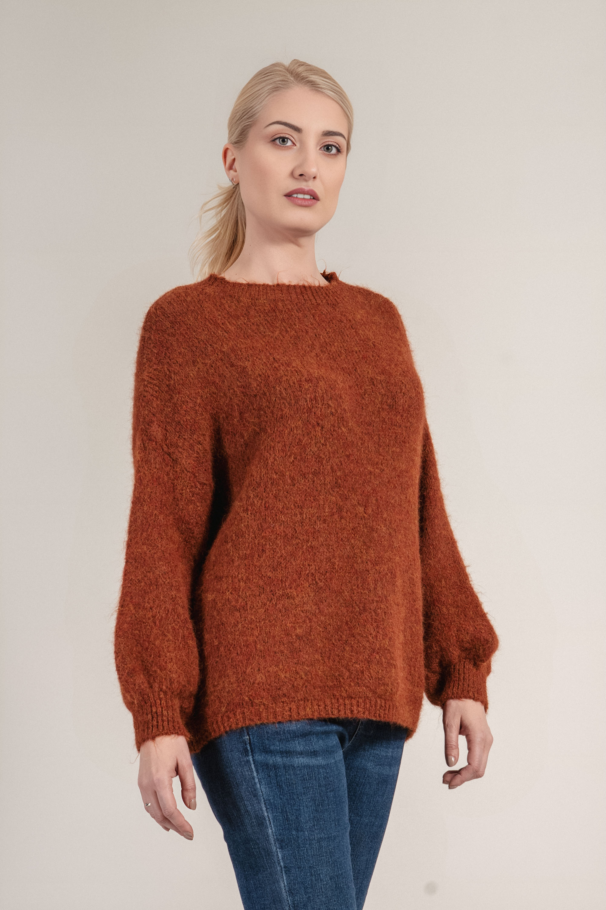 Едноцветен пуловер със свободен силует, съчетаващ стил и комфорт. Грубата плетка придава обем и мекота, а карамеленият цвят носи топлина и универсалност. Перфектен за сезон есен-зима и лесен за стилизиране във всекидневни визии.