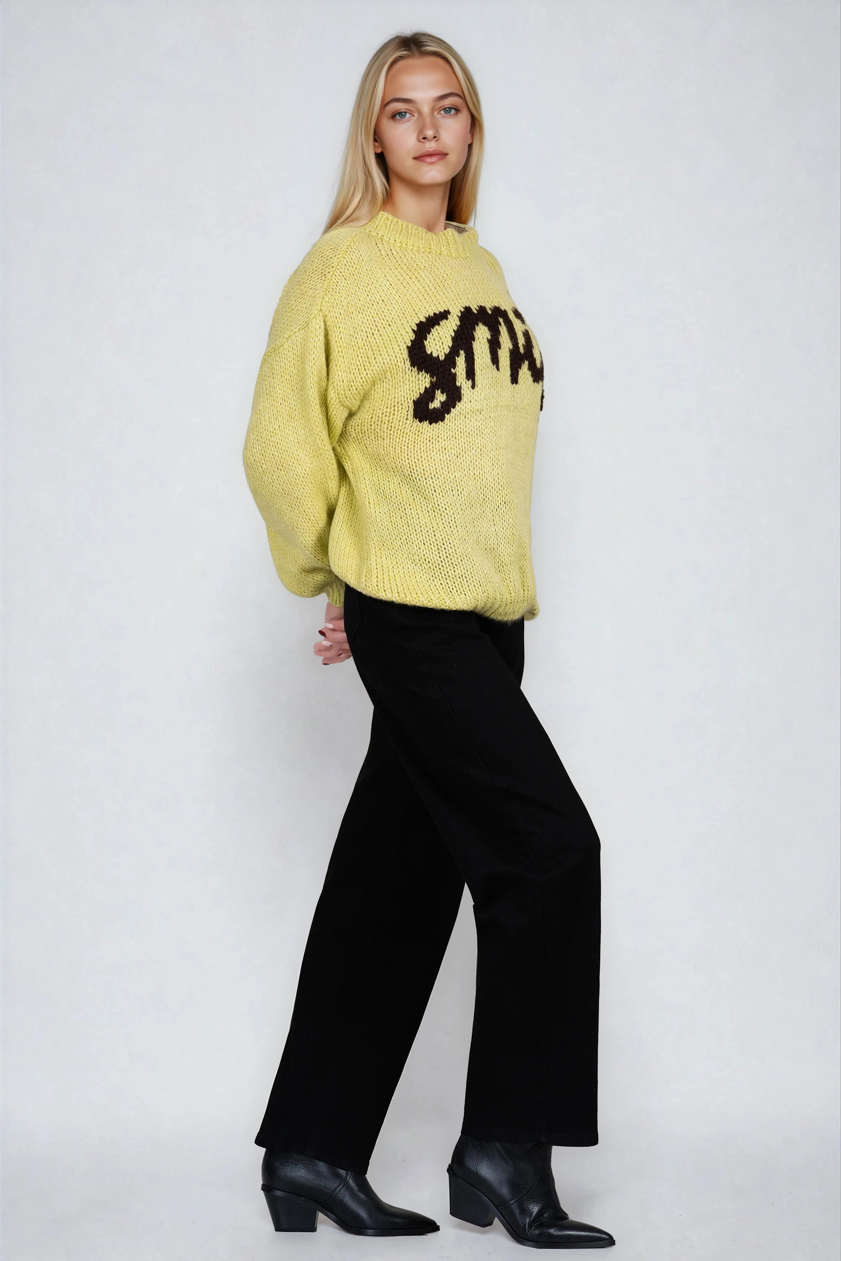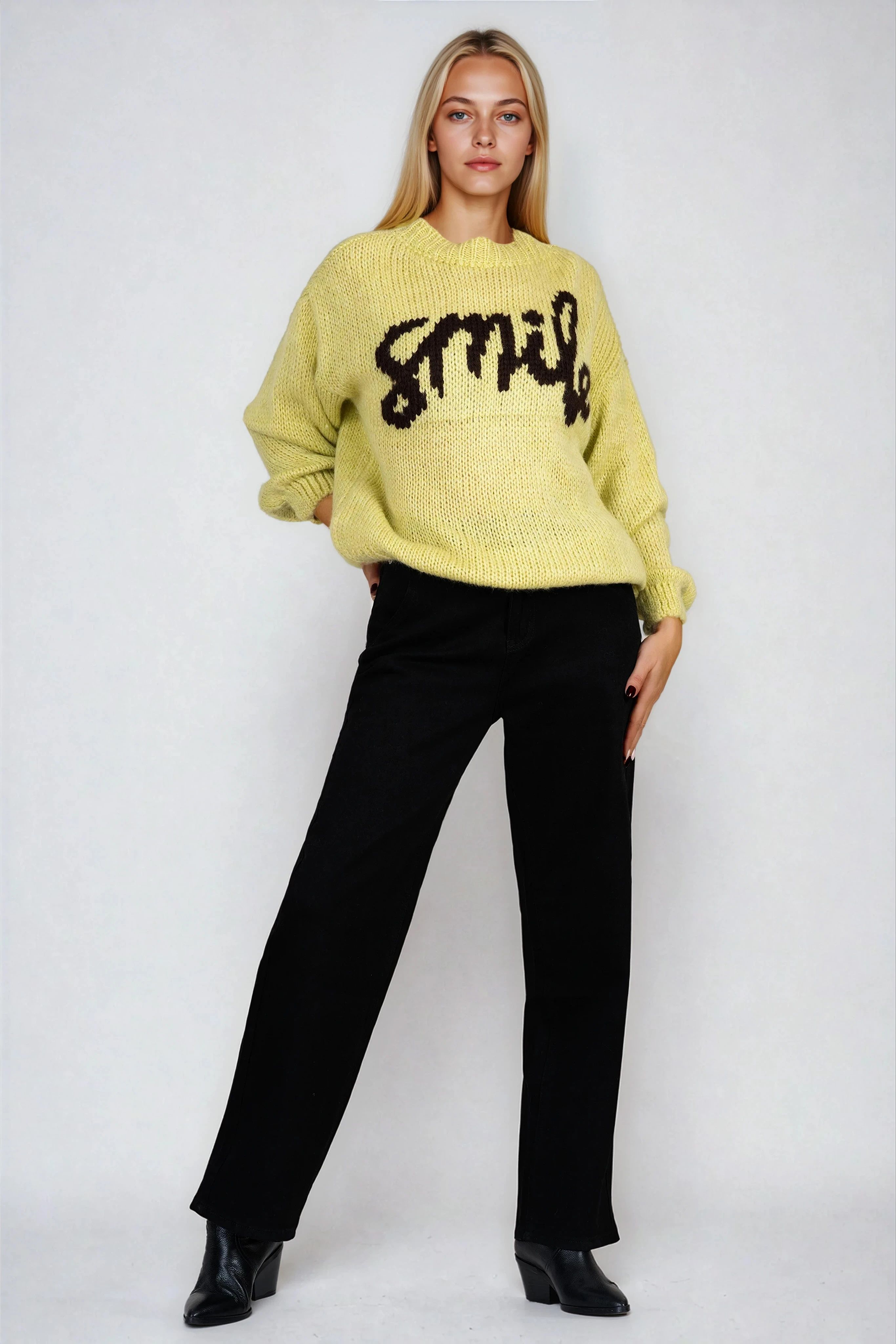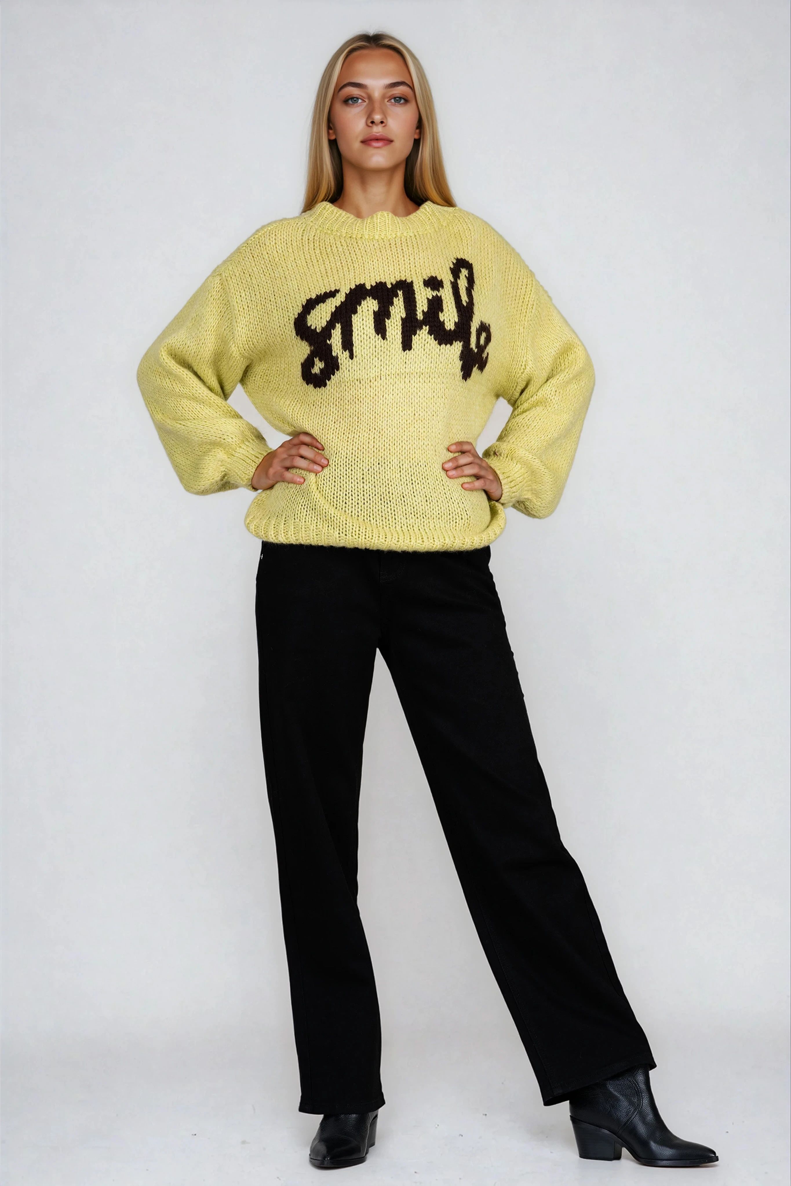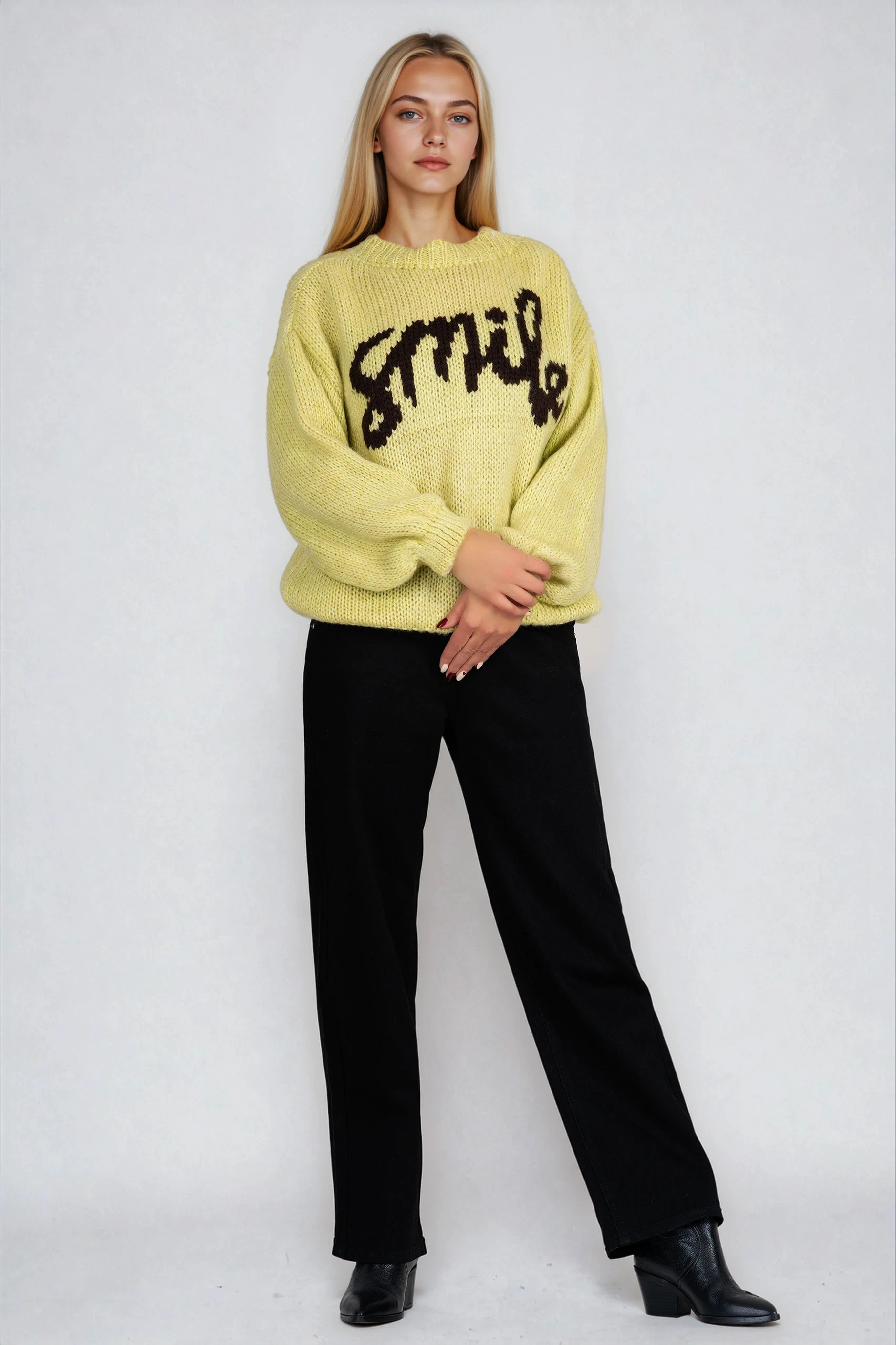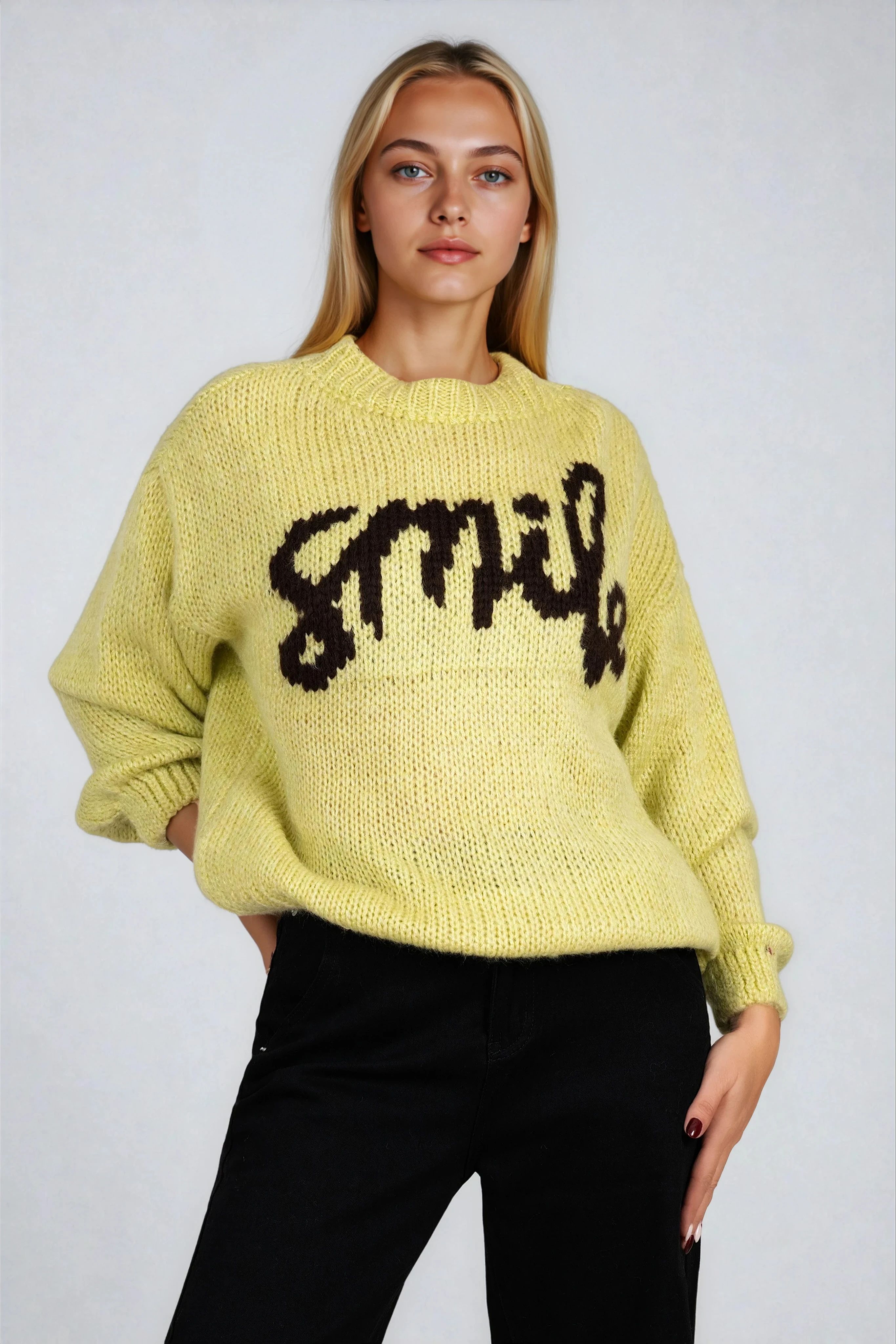 Този пуловер в цвят лайм съчетава удобство и настроение. Изработен от италианско едро плетиво с овално деколте, той се отличава с ефектен надпис "Smile". Подходящ за ежедневно носене с дънки, панталони или пола. Идеален избор за уютна визия в хладно време.