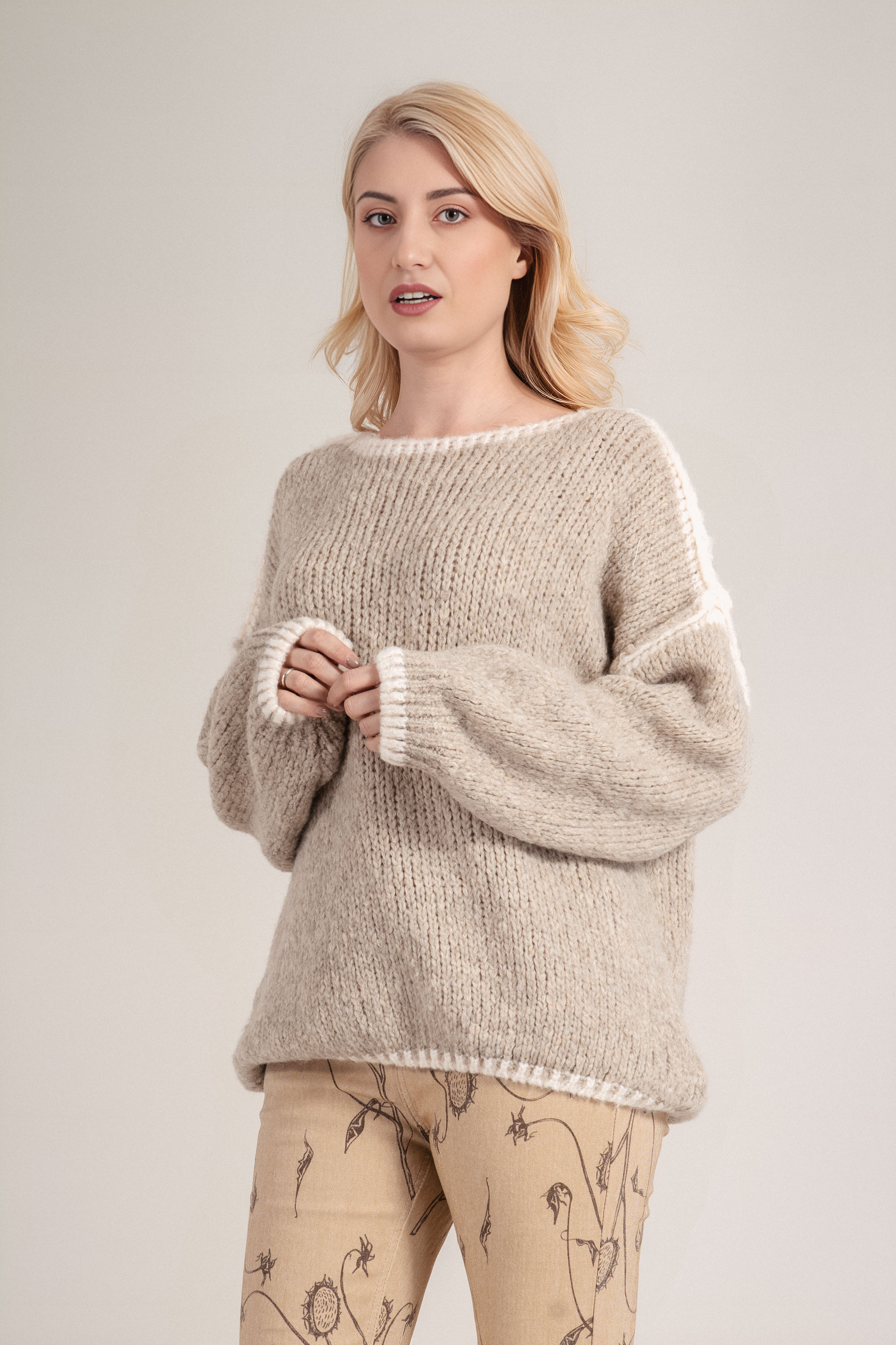 Топъл и уютен пуловер, изработен от висококачествено италианско плетиво. Моделът впечатлява с паднало рамо и акцентиращи бели кантове, които придават завършен и стилен вид. Идеален избор за ежедневието през есенно-зимния сезон. Меката и топла материя осигурява комфорт през целия ден.