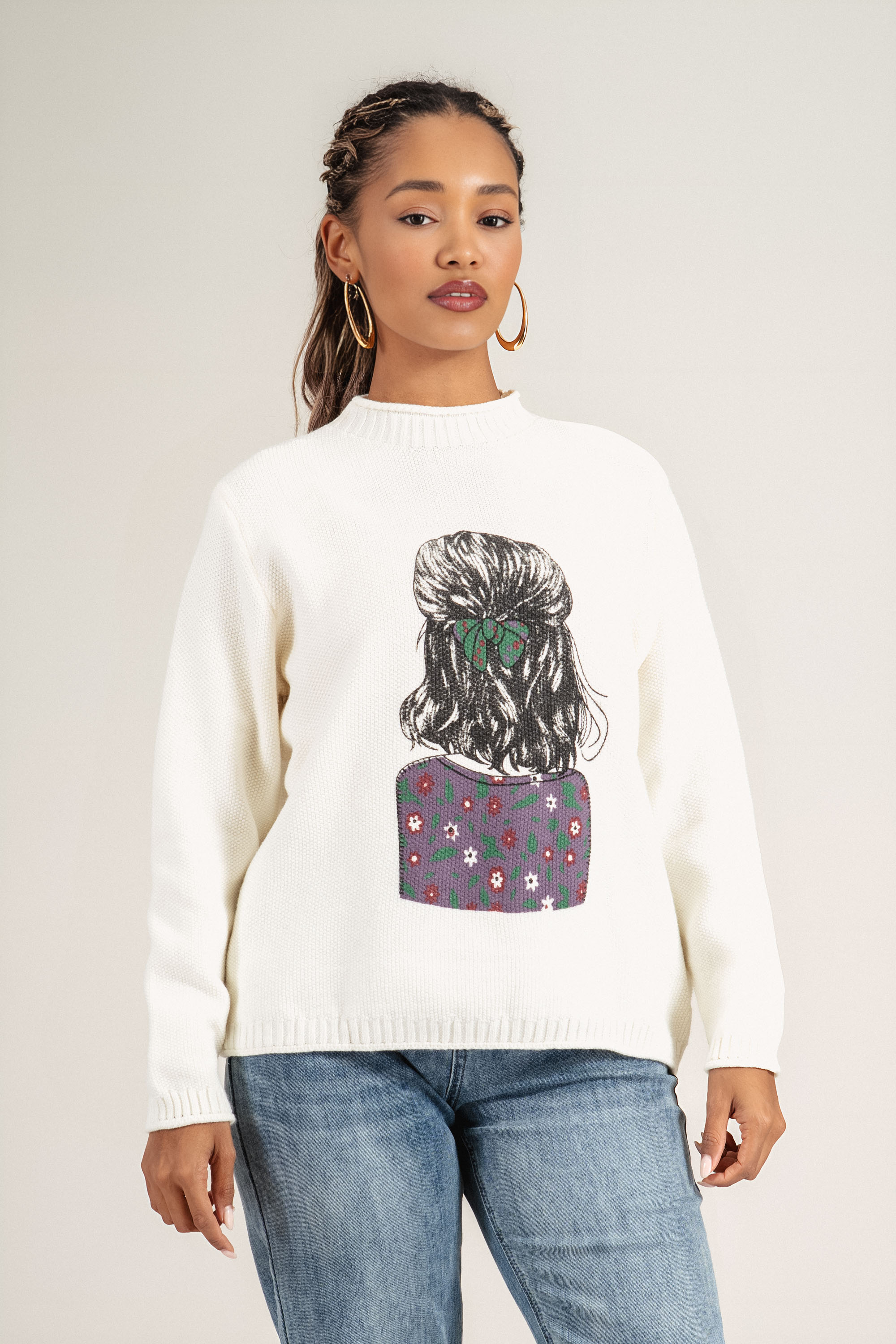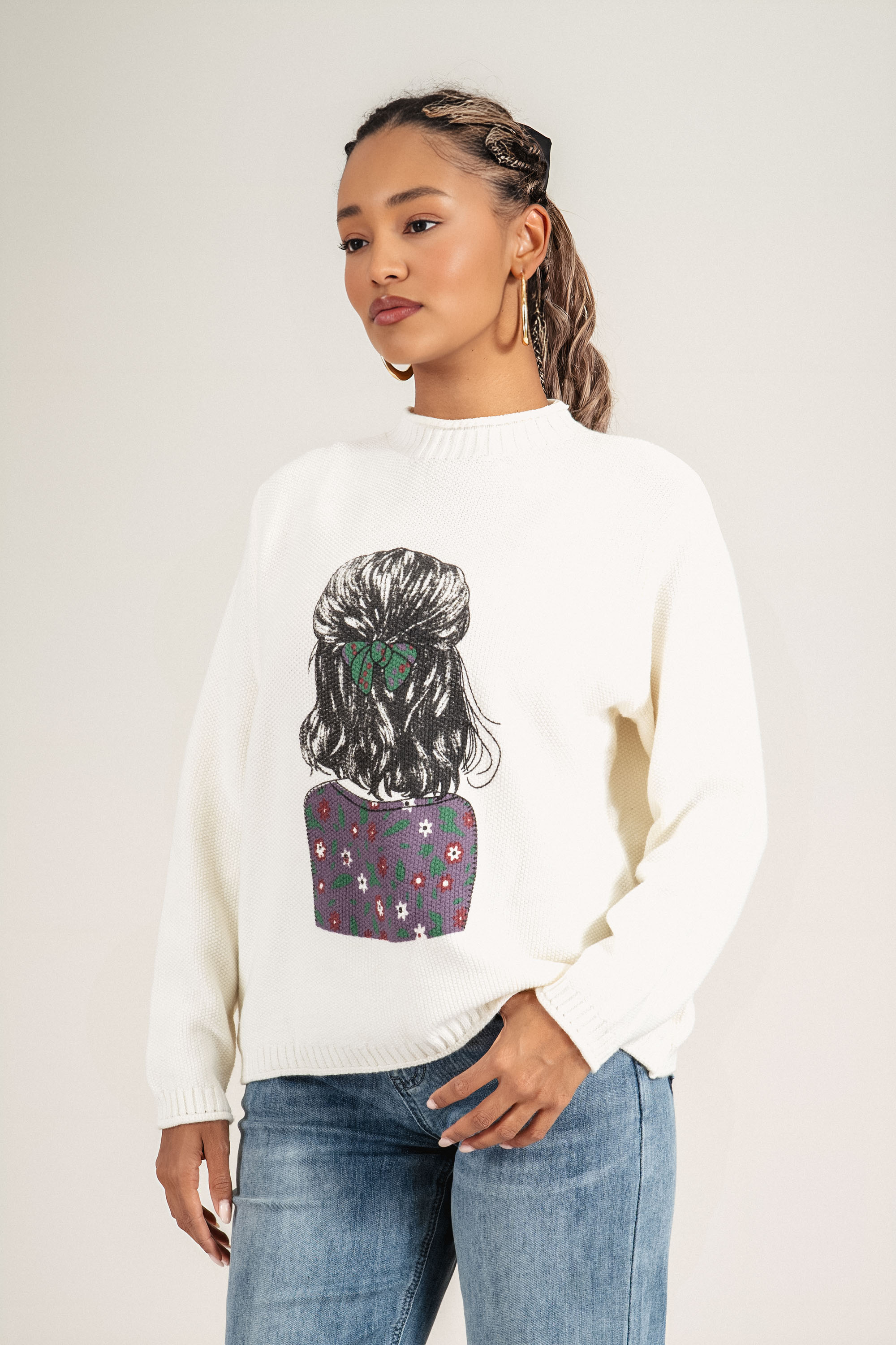 Фино изработен пуловер в бяло, който се откроява с женствени детайли – щамповано момиче с панделка, поставена с фин усет за стил. Материята е мека и подходяща за ежедневна елегантност през по-хладните дни. Стилен избор за офиса или вечерна среща.