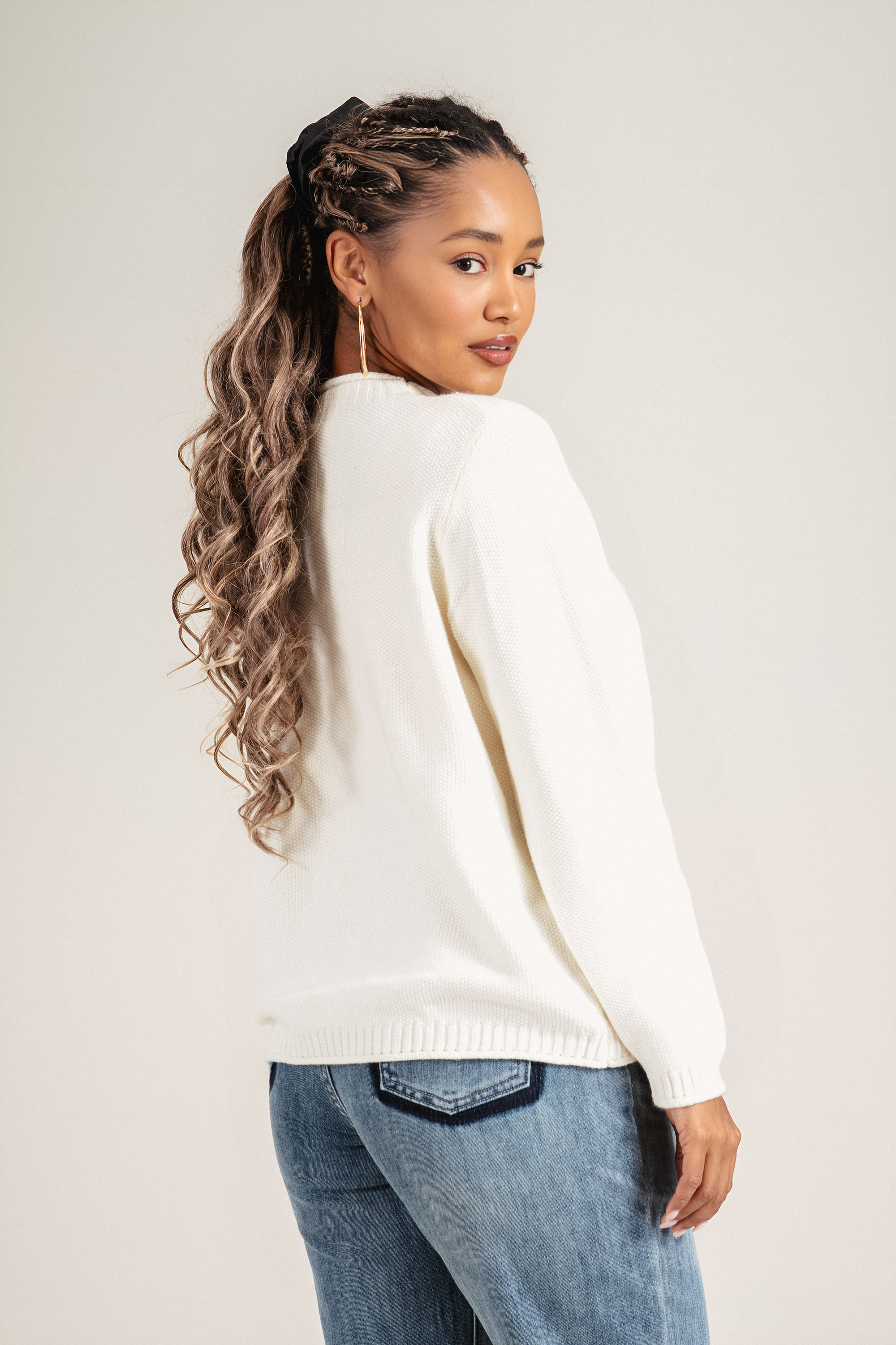 Дамски плетен пуловер в бяло с шампа момиче с панделка