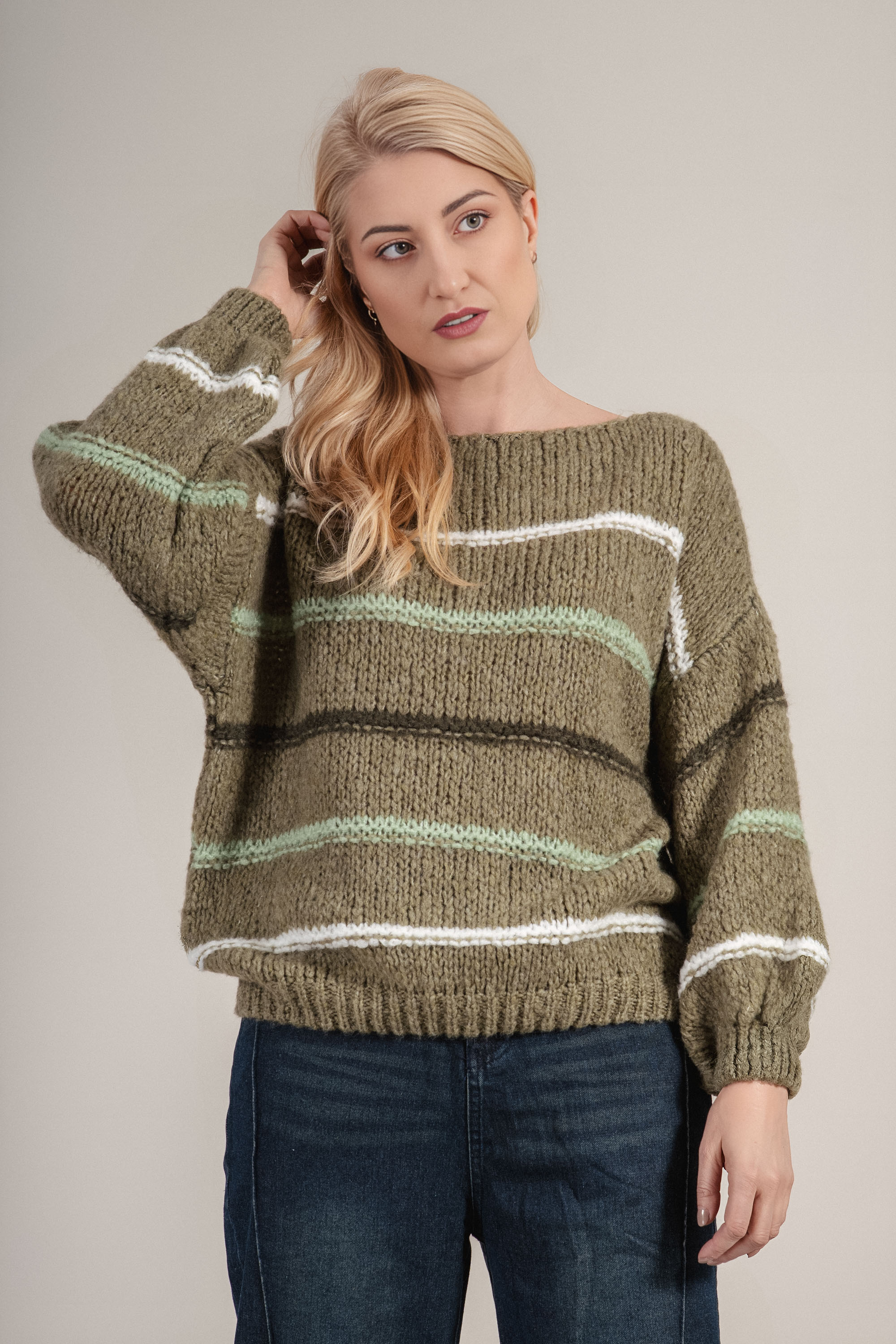 Плетен пуловер с ефектна текстура и мека на допир материя. Дизайнът е освежен с хоризонтално райе в естествени тонове – бяло и зелено– върху опушено зелена основа. Свободната кройка с паднало рамо го прави отличен избор за ежедневието през студените сезони. Моделът е произведен в Италия с внимание към детайла.