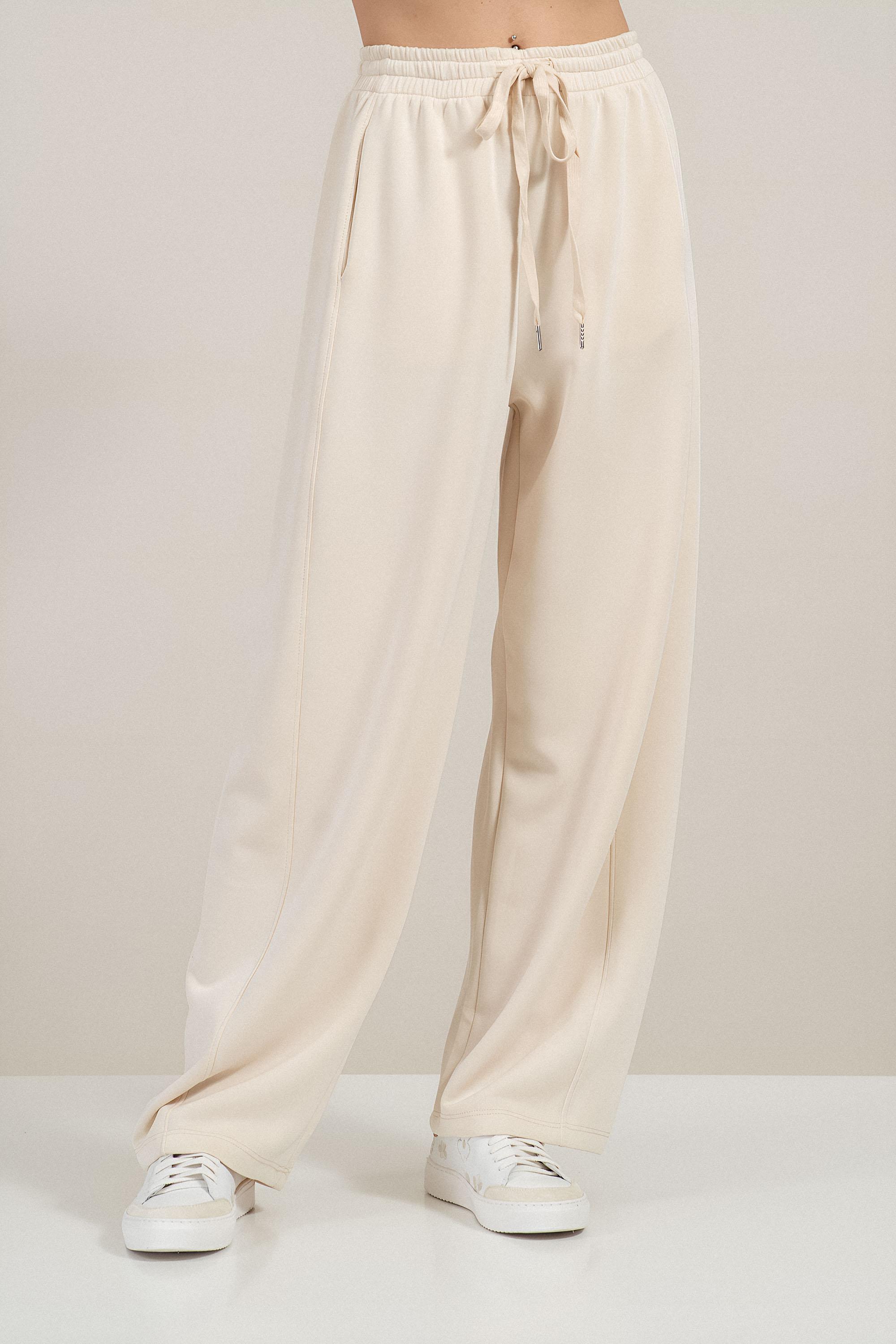 Този панталон от меко трико съчетава комфорт и изчистена визия, подходяща за ежедневен стил. Свободната кройка пада естествено по силуета, а еластичният колан с връзки позволява индивидуално регулиране и удобно прилягане. Светлият цвят придава елегантност и се комбинира лесно както със спортни обувки, така и с по-елегантни модели. Подходящ избор за динамично ежедневие, пътуване или спокойни градски визии.