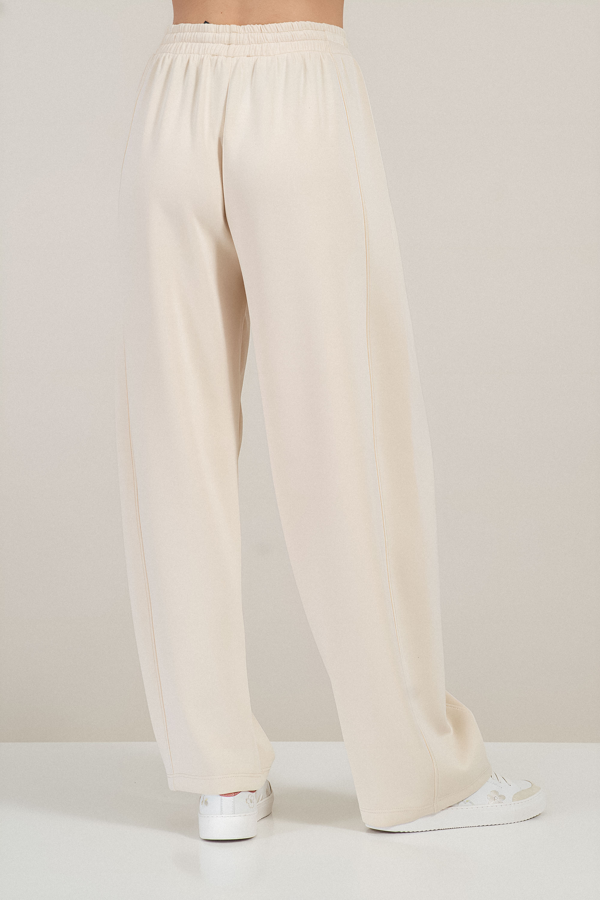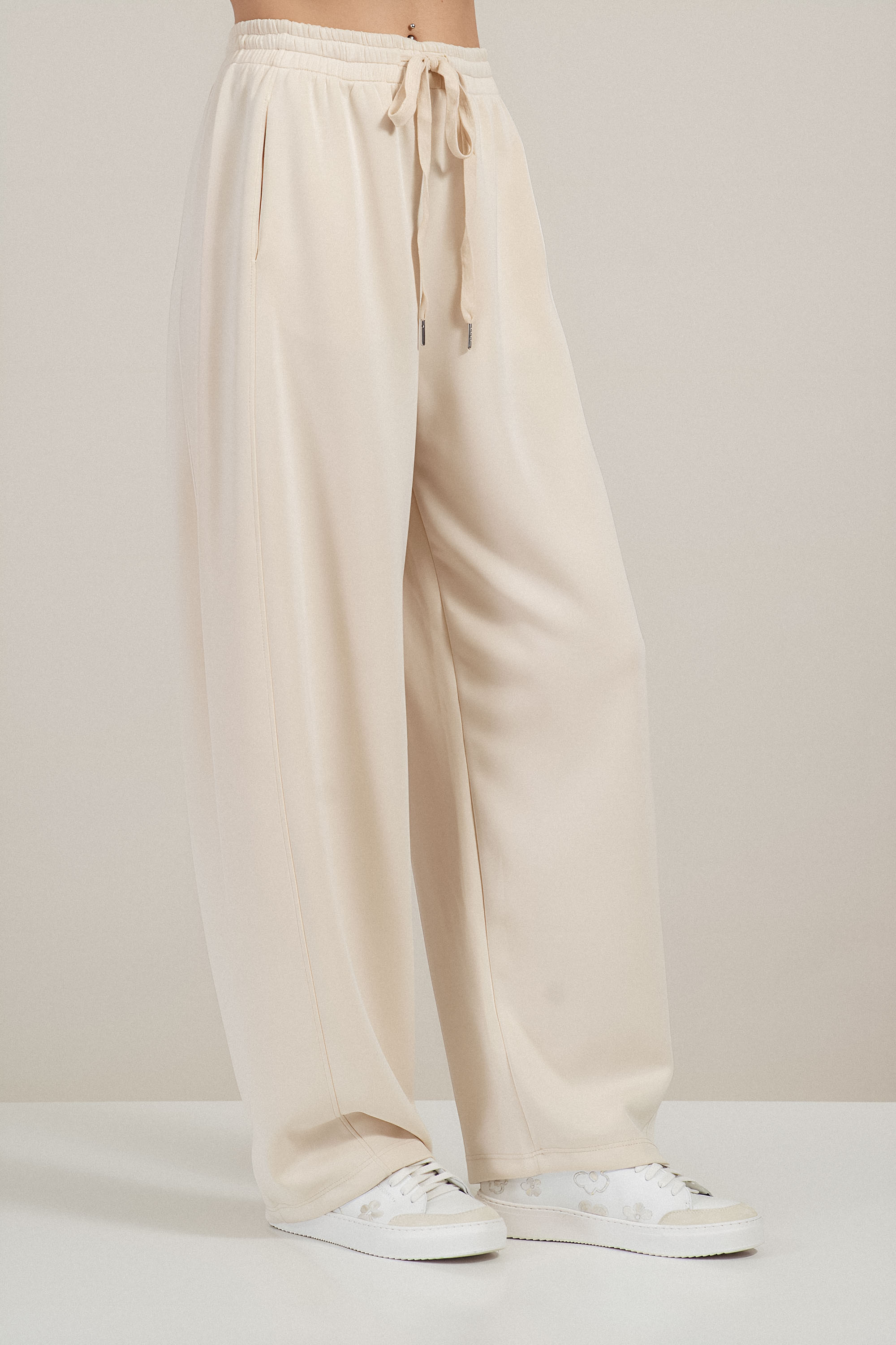 Дамски прав панталон в цвят екрю с ластик и връзки в талията
