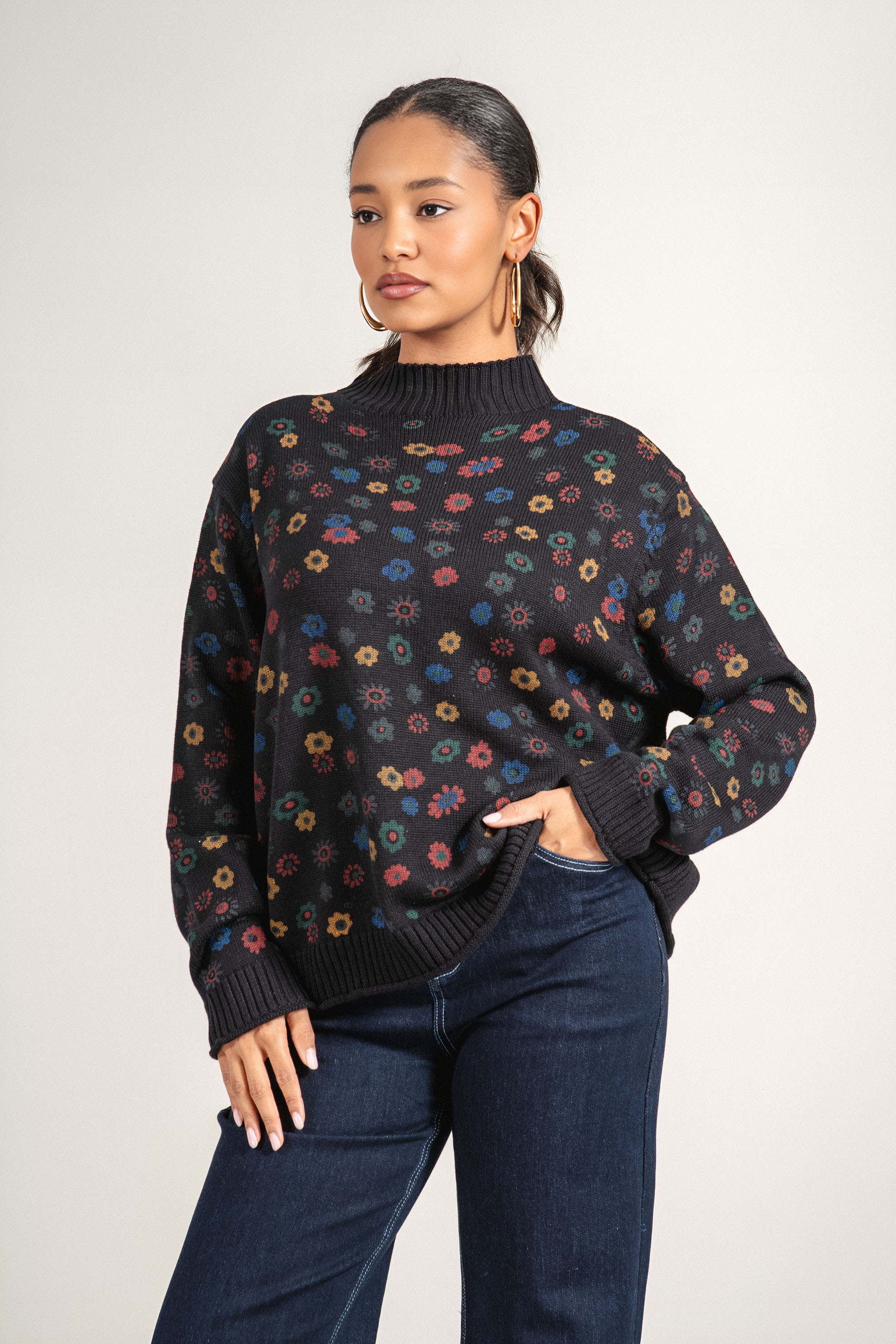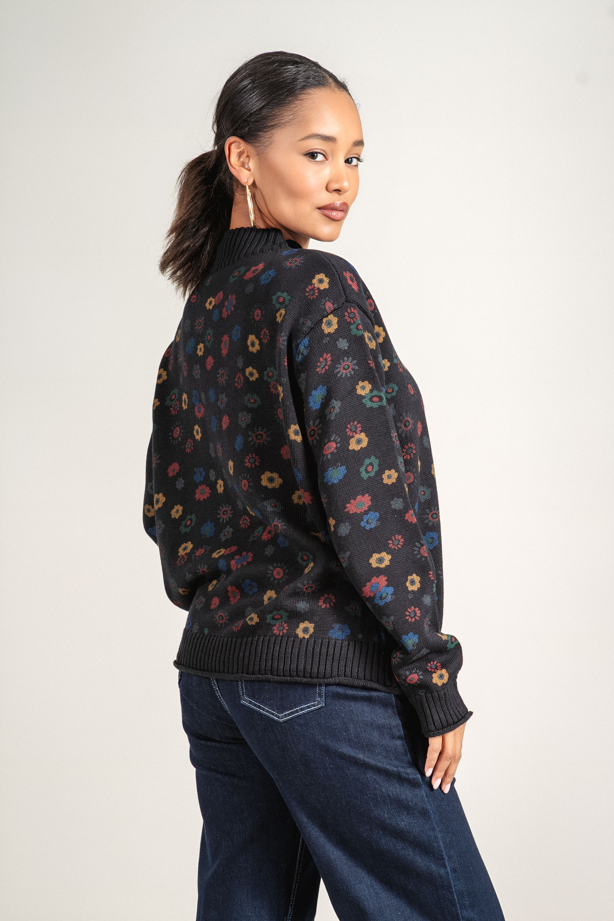 Дамски пуловер фино плетиво в черно с цветен флорален принт