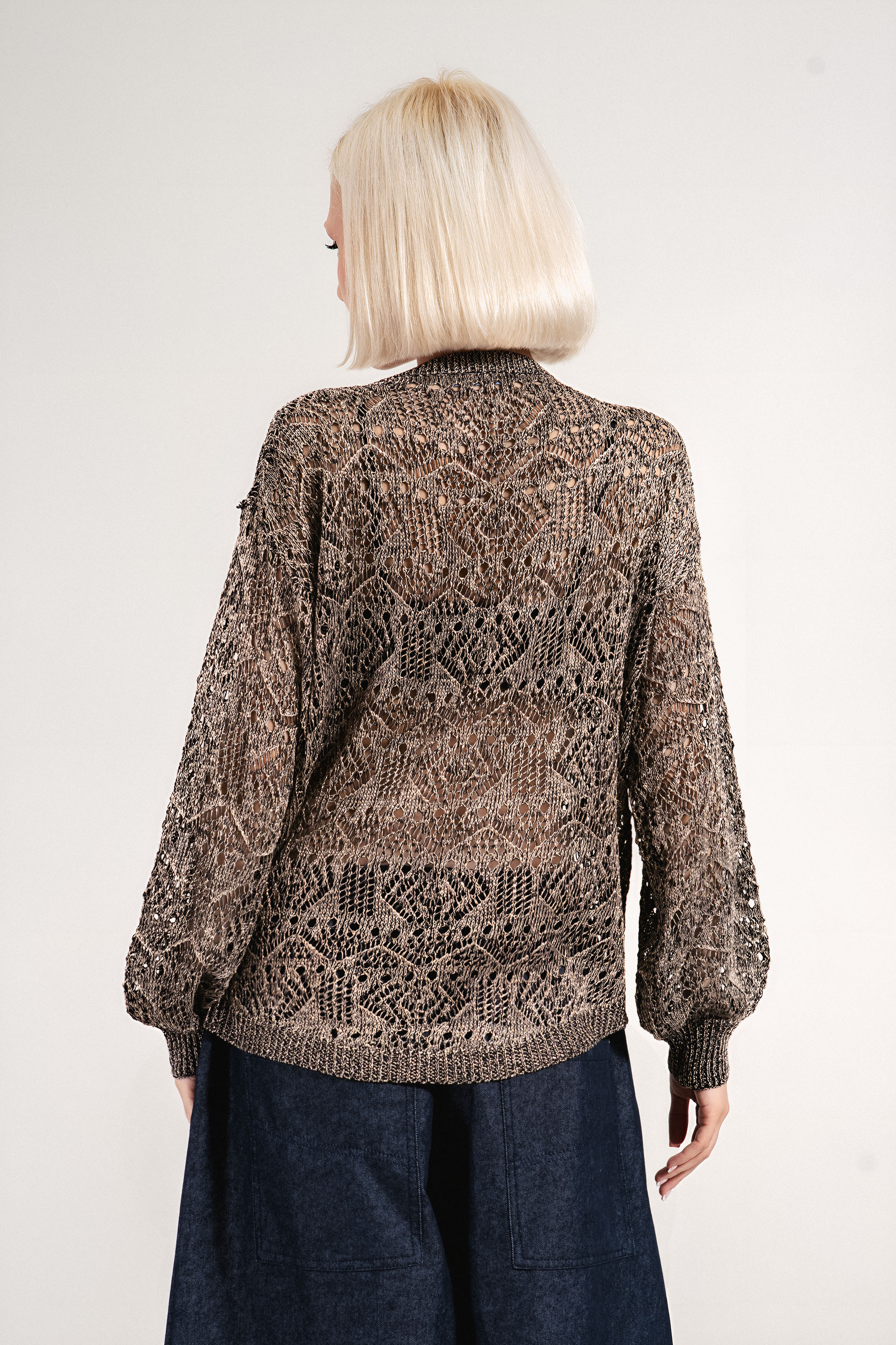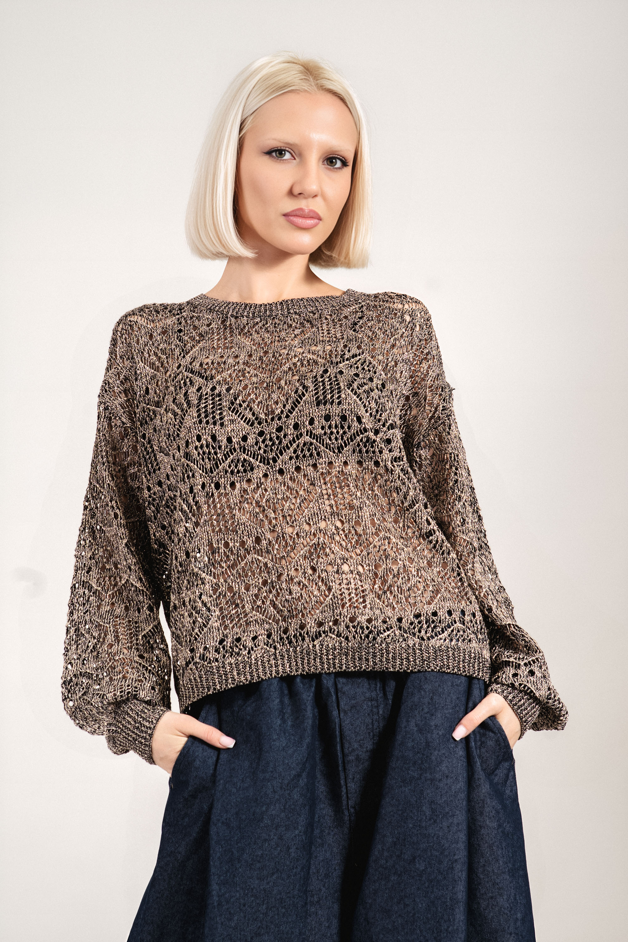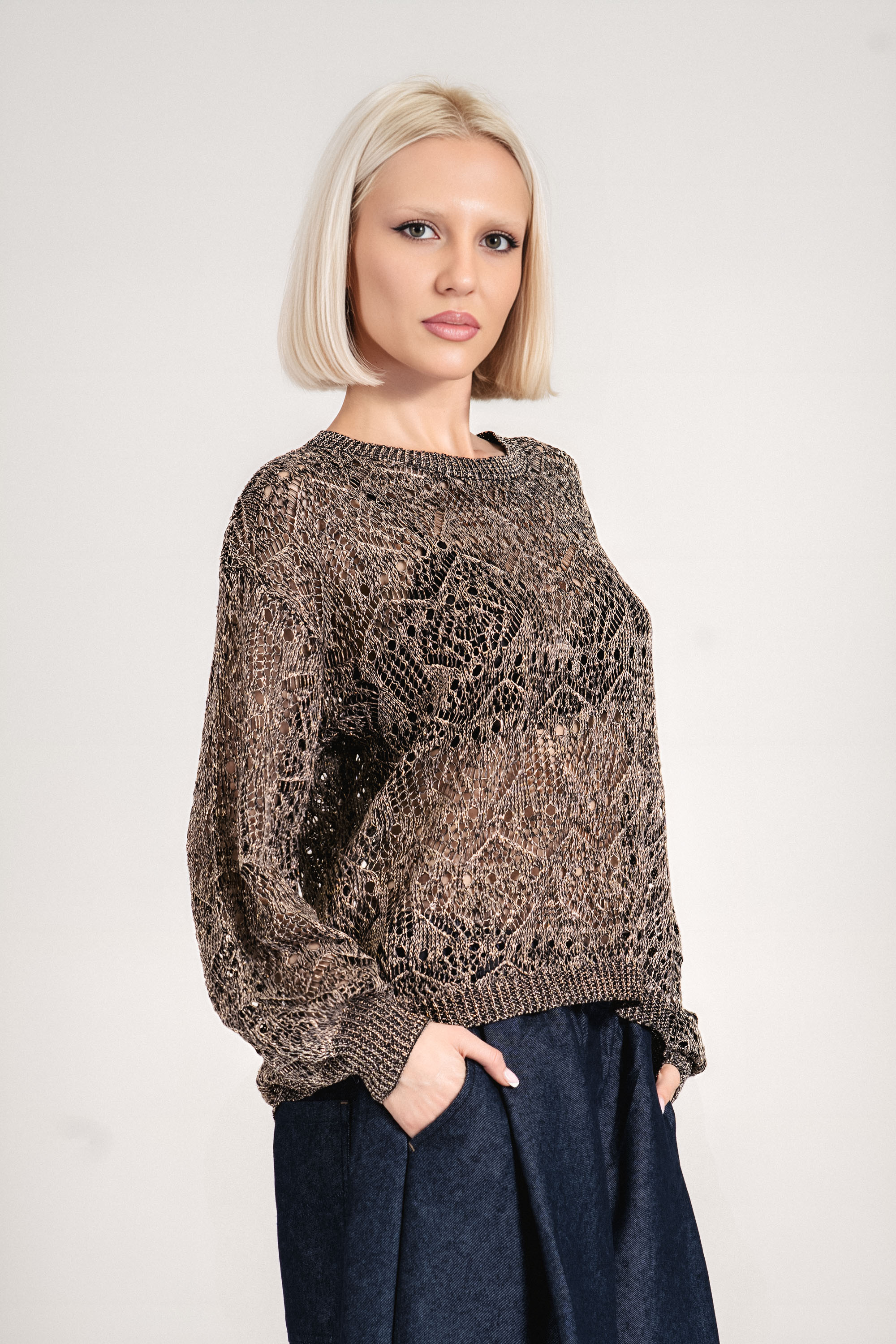 Едноцветният пуловер в класическо черно е изработен от грубо плетиво с видима структура. Кройката е леко свободна, с изразено рамо и широк ръкав, което осигурява максимално удобство. Подходящ за ежедневно носене, така и за по-небрежен офис стил.