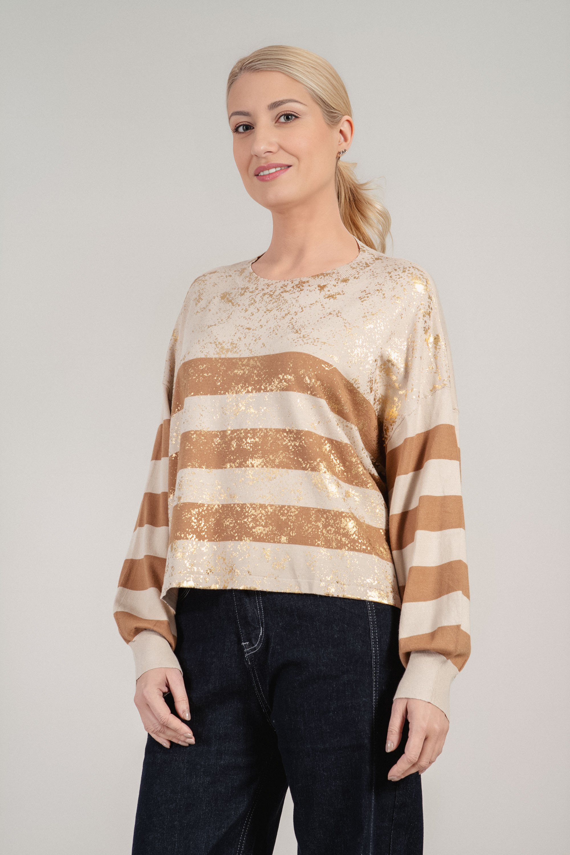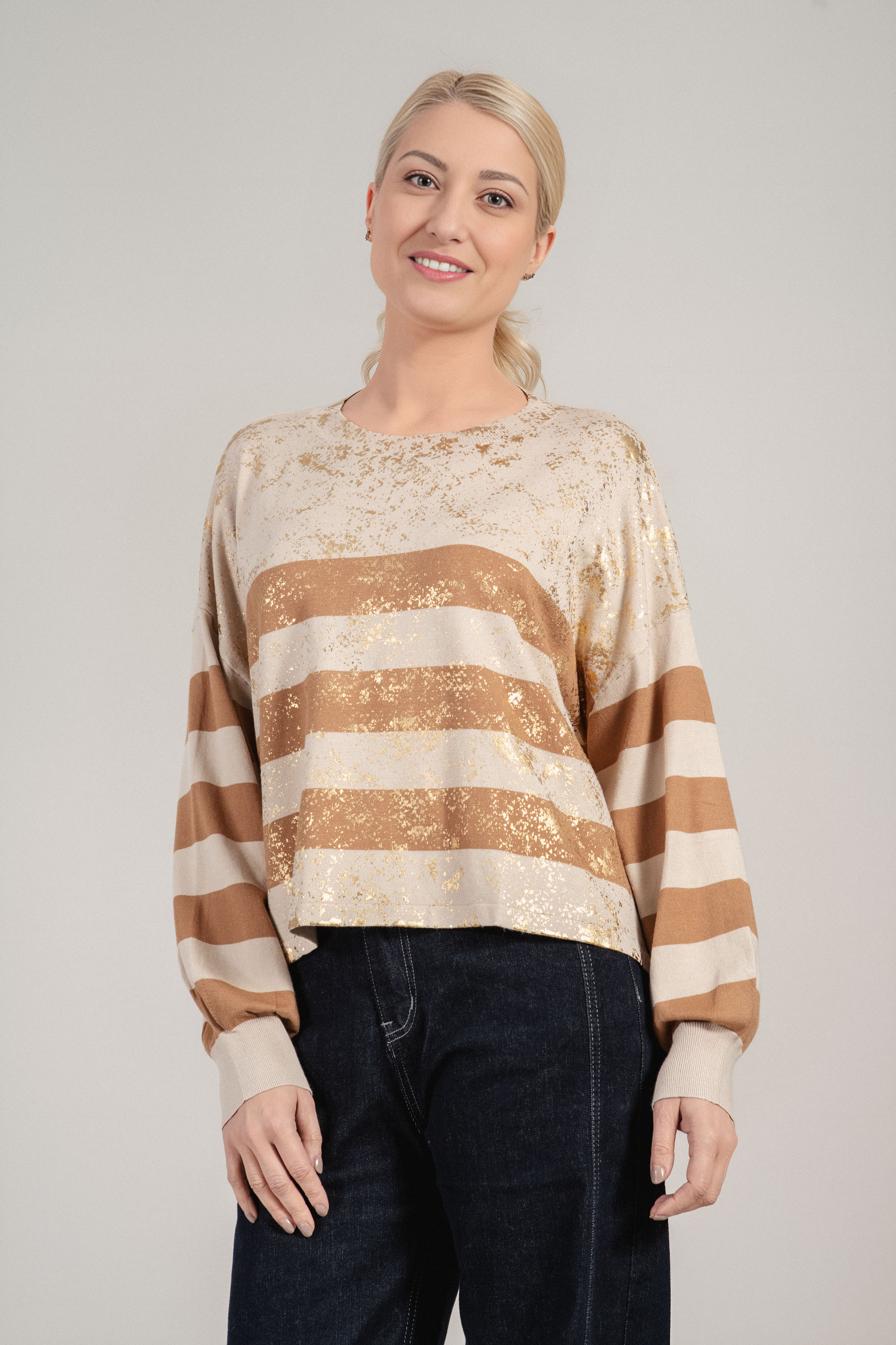 Дамски пуловер от фино плетиво в бежово с принт райе и златист ефект