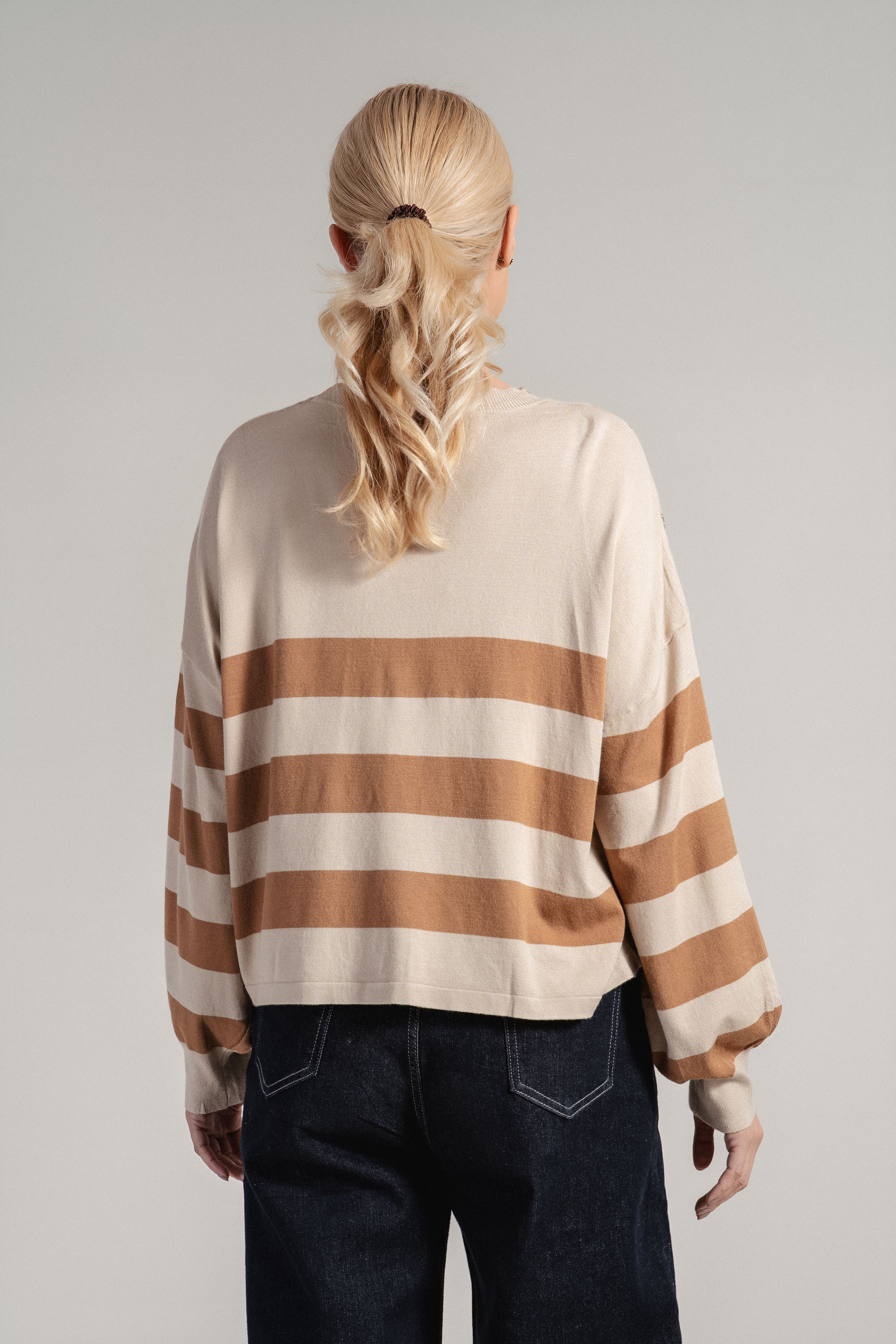 Лек и стилен пуловер от фино плетиво в нежен бежов нюанс с раие и деликатен златист ефект. Изработен в Италия от мека и приятна на допир материя, моделът е с обло деколте и редова плетка. Подходящ за всеки сезон и лесен за комбиниране с панталон или пола, той е отличен избор за ежедневна визия с фин акцент.