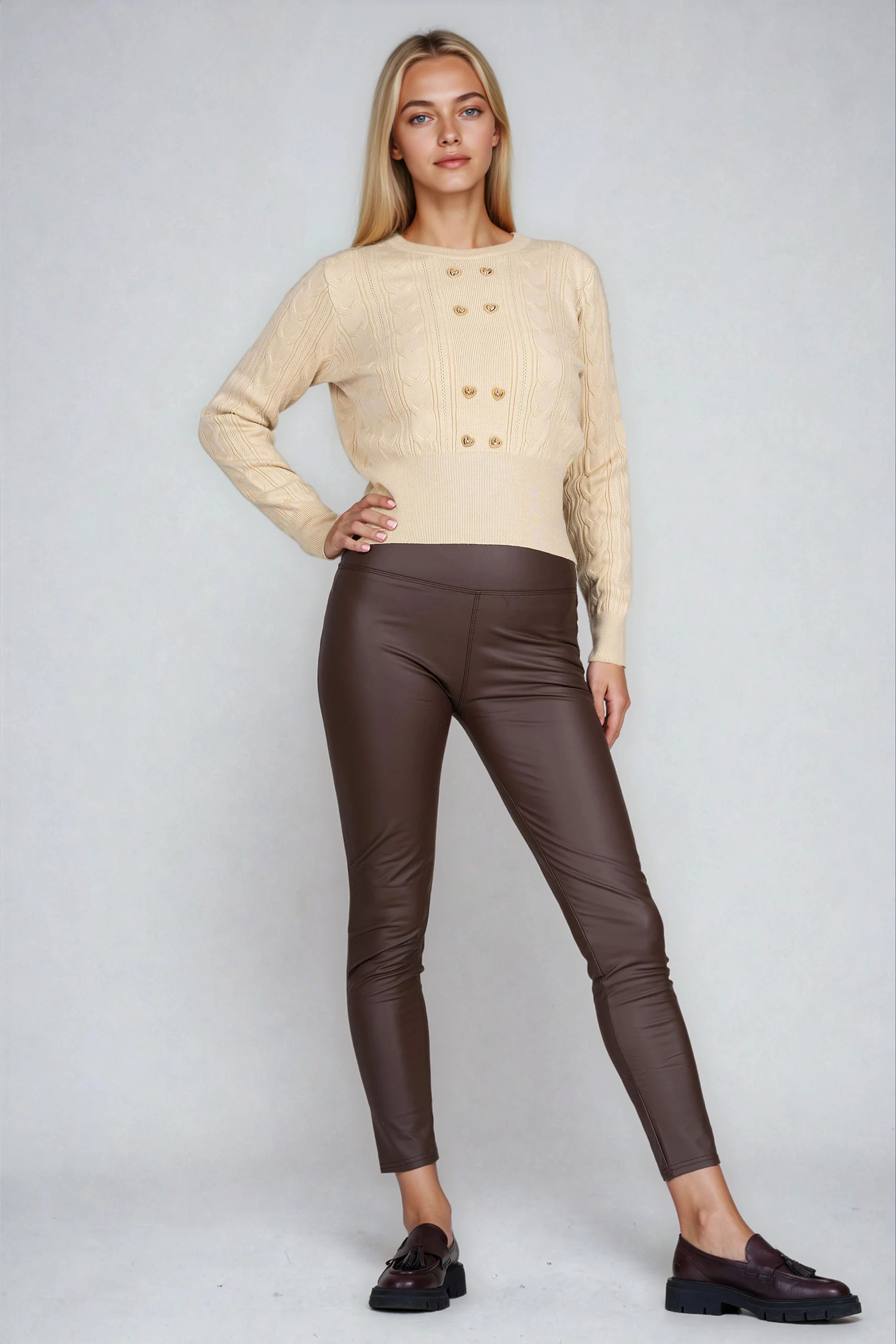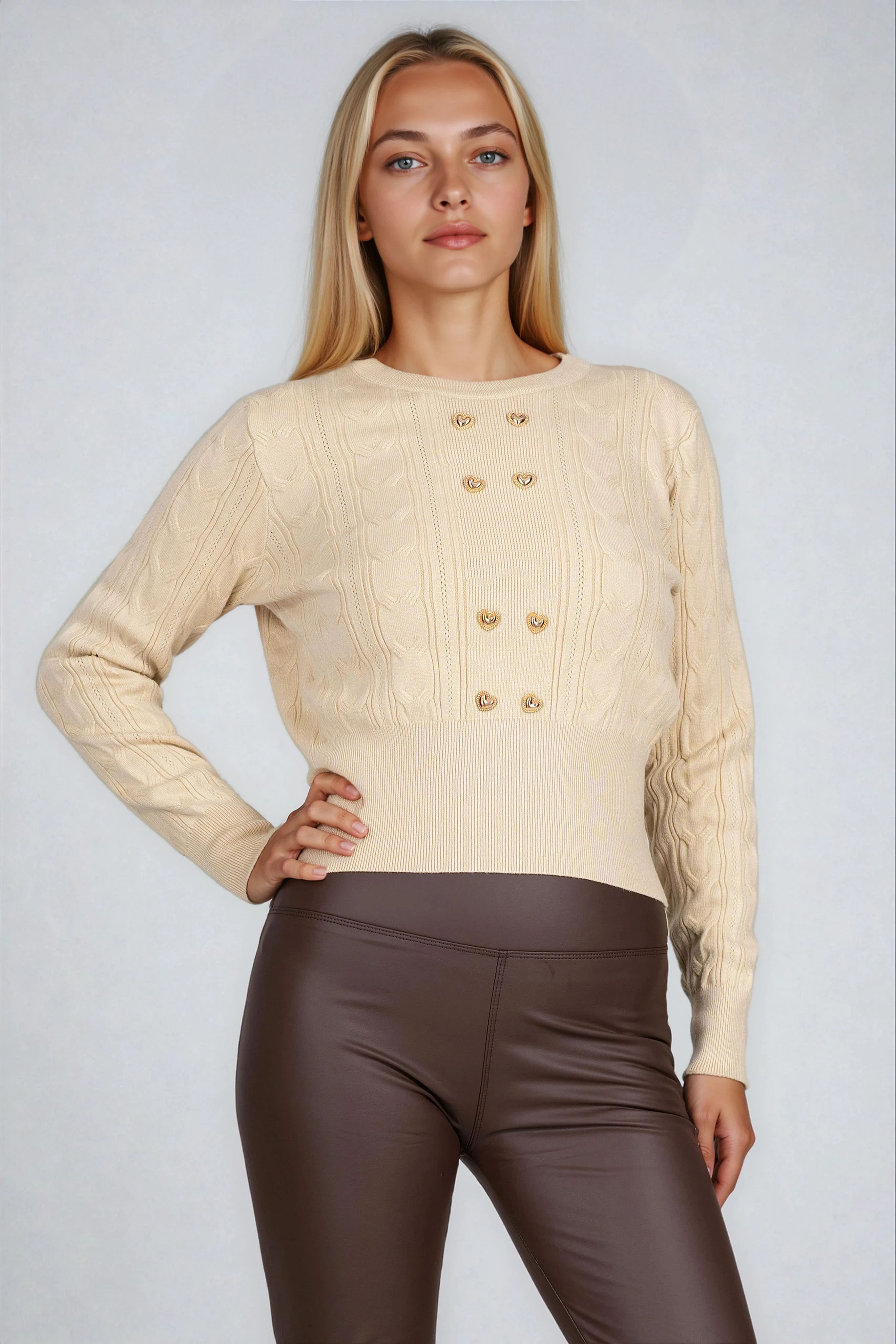 Изискан пуловер с фина плетка и декоративен релеф. Класическото обло деколте е комбинирано със златисти сърцевидни копчета отпред – отличителен акцент, който придава нежност и женственост. Еластичните маншети и кантове допълват завършената визия. Подходящ за ежедневни и полуофициални поводи.