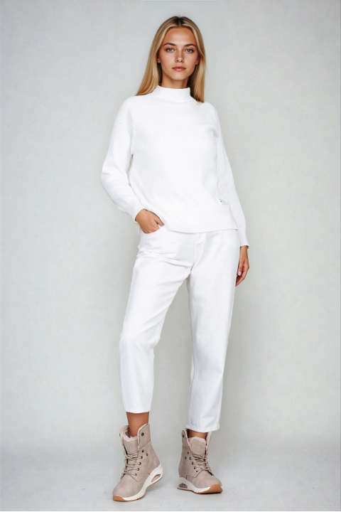 Този пуловер в бяло съчетава класически релефен десен с модерен щрих – декоративен елемент в долната част. Полуполо яката и еластичните кантове осигуряват допълнителен комфорт. Цветът е подходящ за Есено-Зимният сезон.