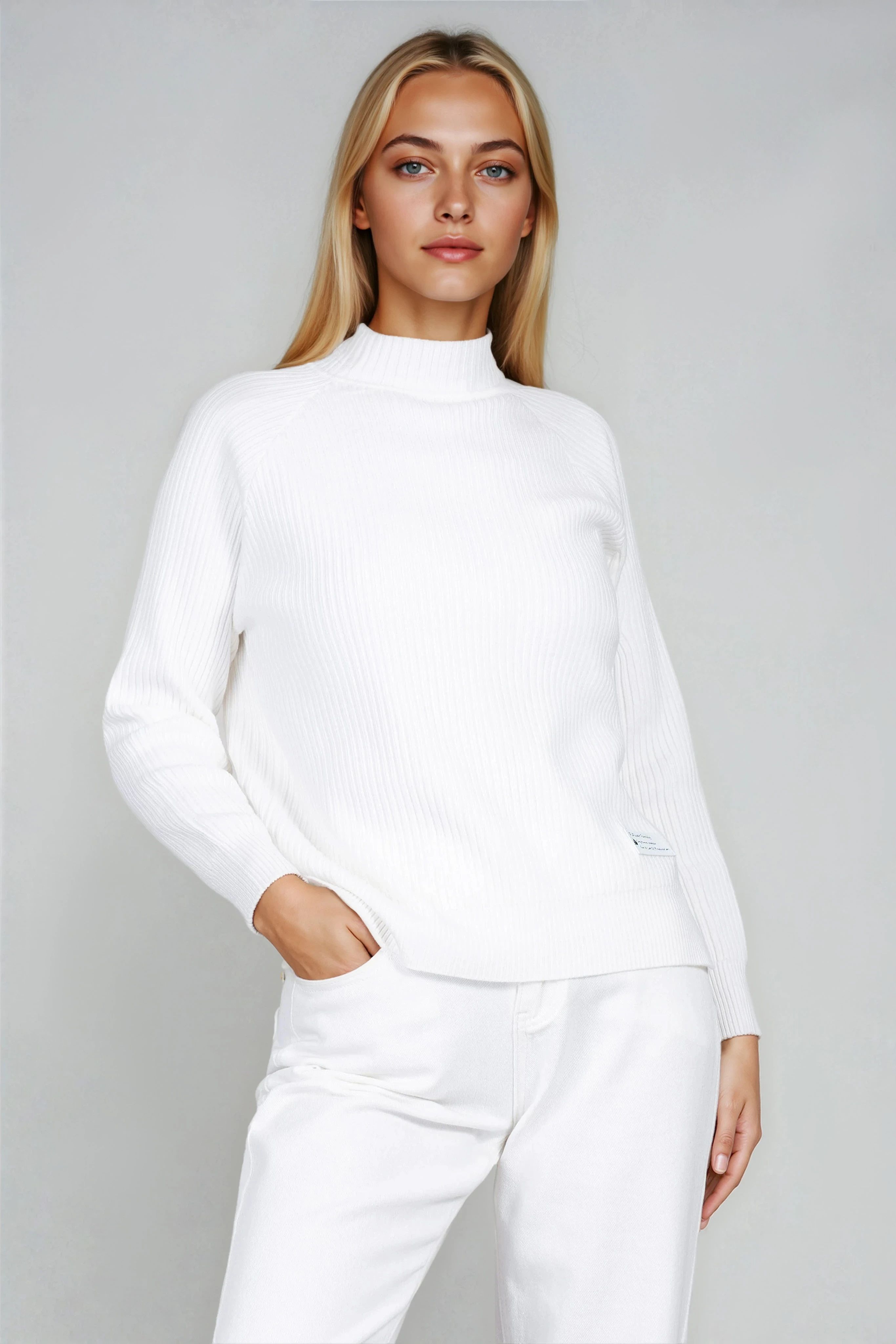 Дамски пуловер от фино плетиво в бяло с релефен рипс и малка емблема