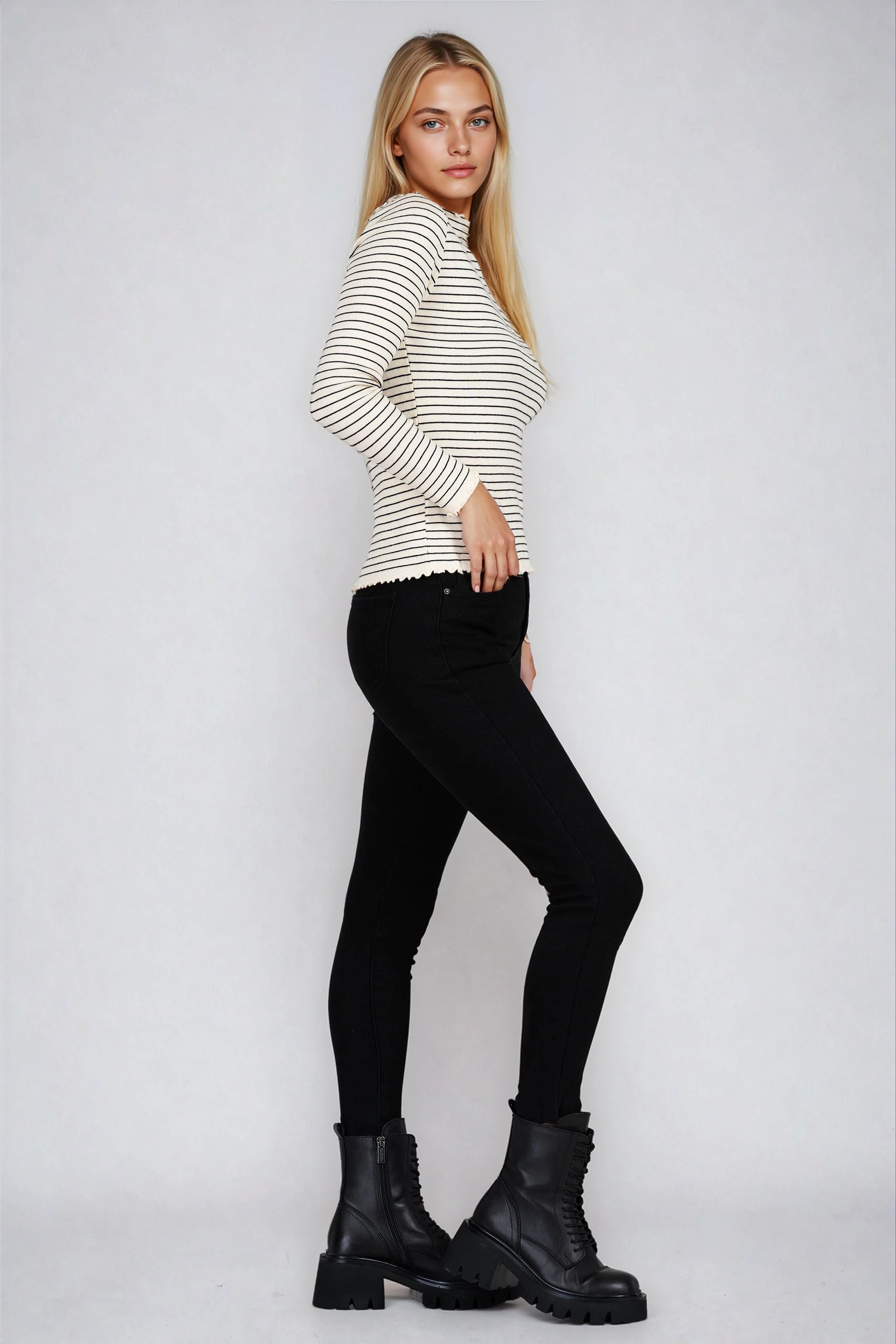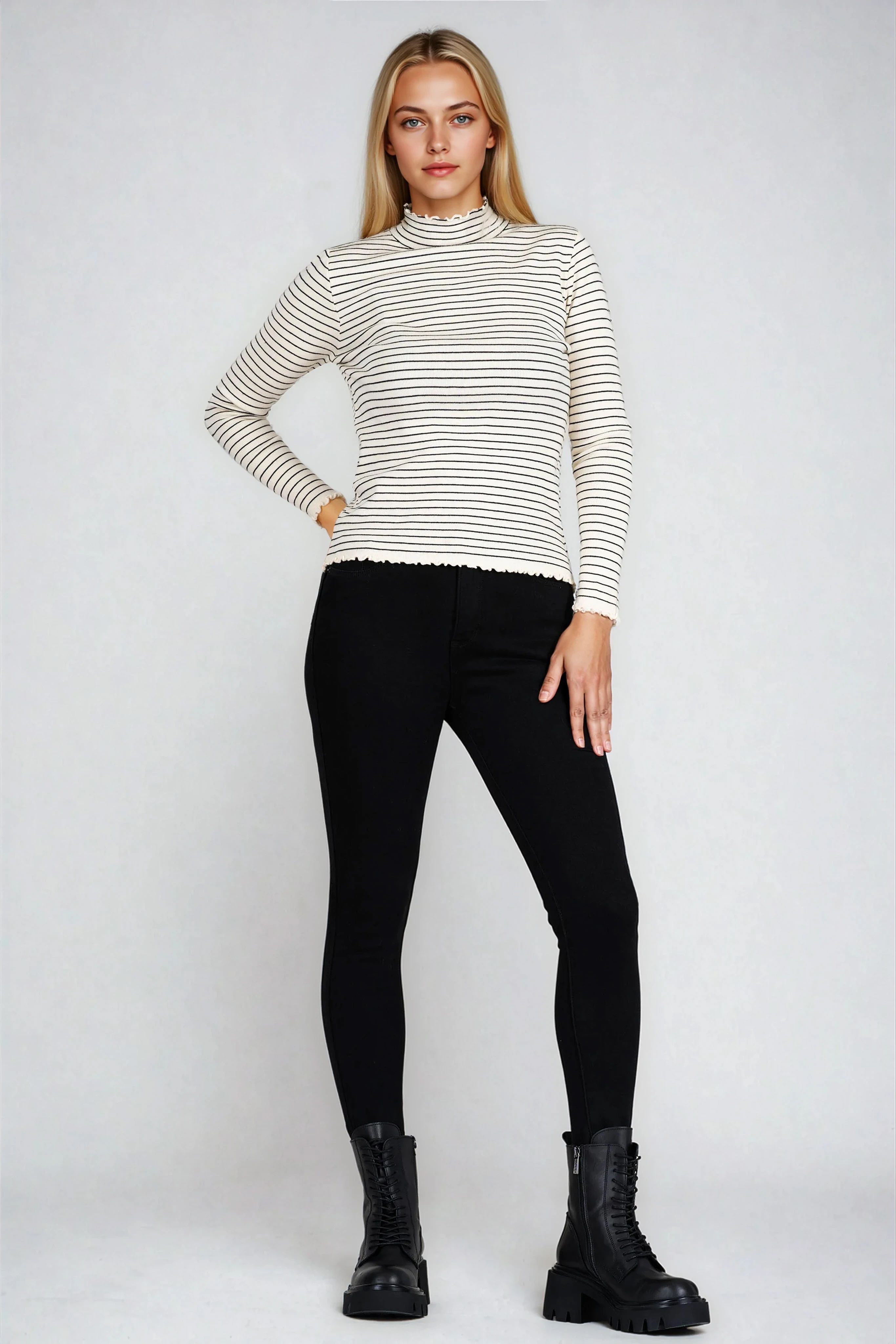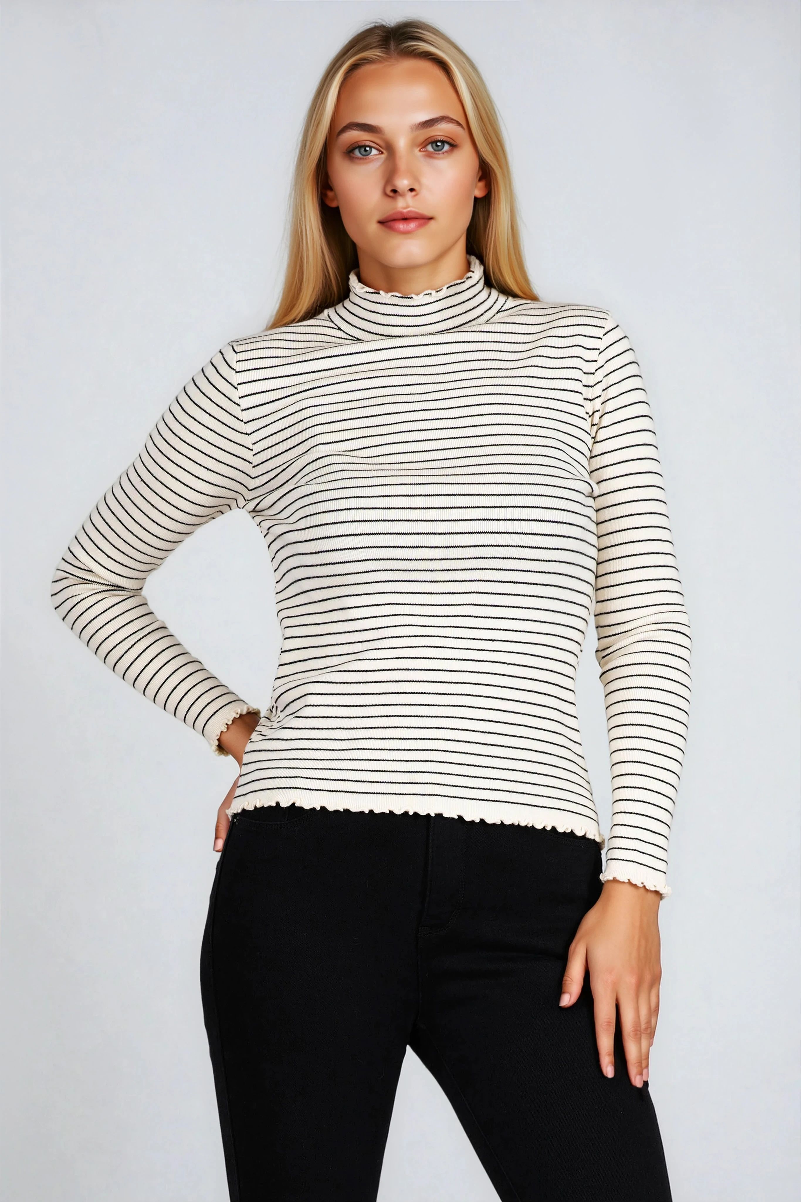 Елегантен пуловер от меко фино плетиво в стилен екрю нюанс, допълнен с черно райе и декоративни къдрици. Високата поло яка осигурява комфорт през по-хладните дни, а прецизното плетиво подчертава женствената линия. Подходящ за ежедневието или офис визия, комбинира се лесно с дънки или пола.