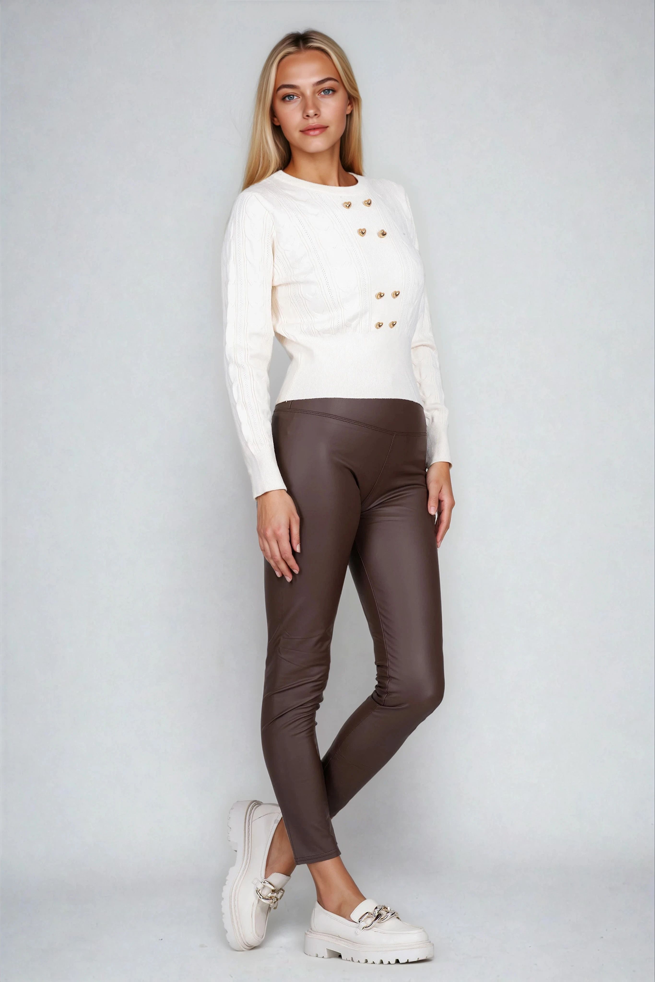 Изискан пуловер с фина плетка и декоративен релеф. Класическото обло деколте е комбинирано със златисти сърцевидни копчета отпред – отличителен акцент, който придава нежност и женственост. Еластичните маншети и кантове допълват завършената визия. Подходящ за ежедневни и полуофициални поводи.